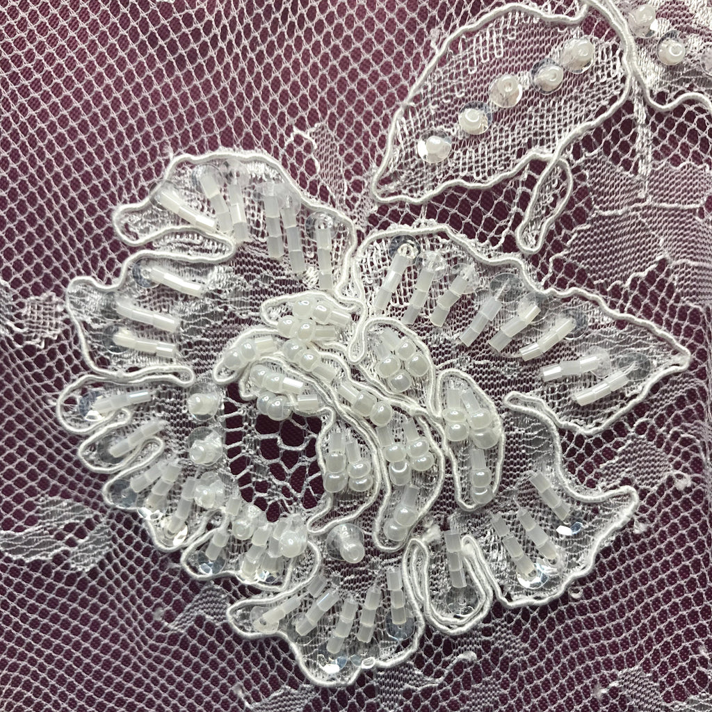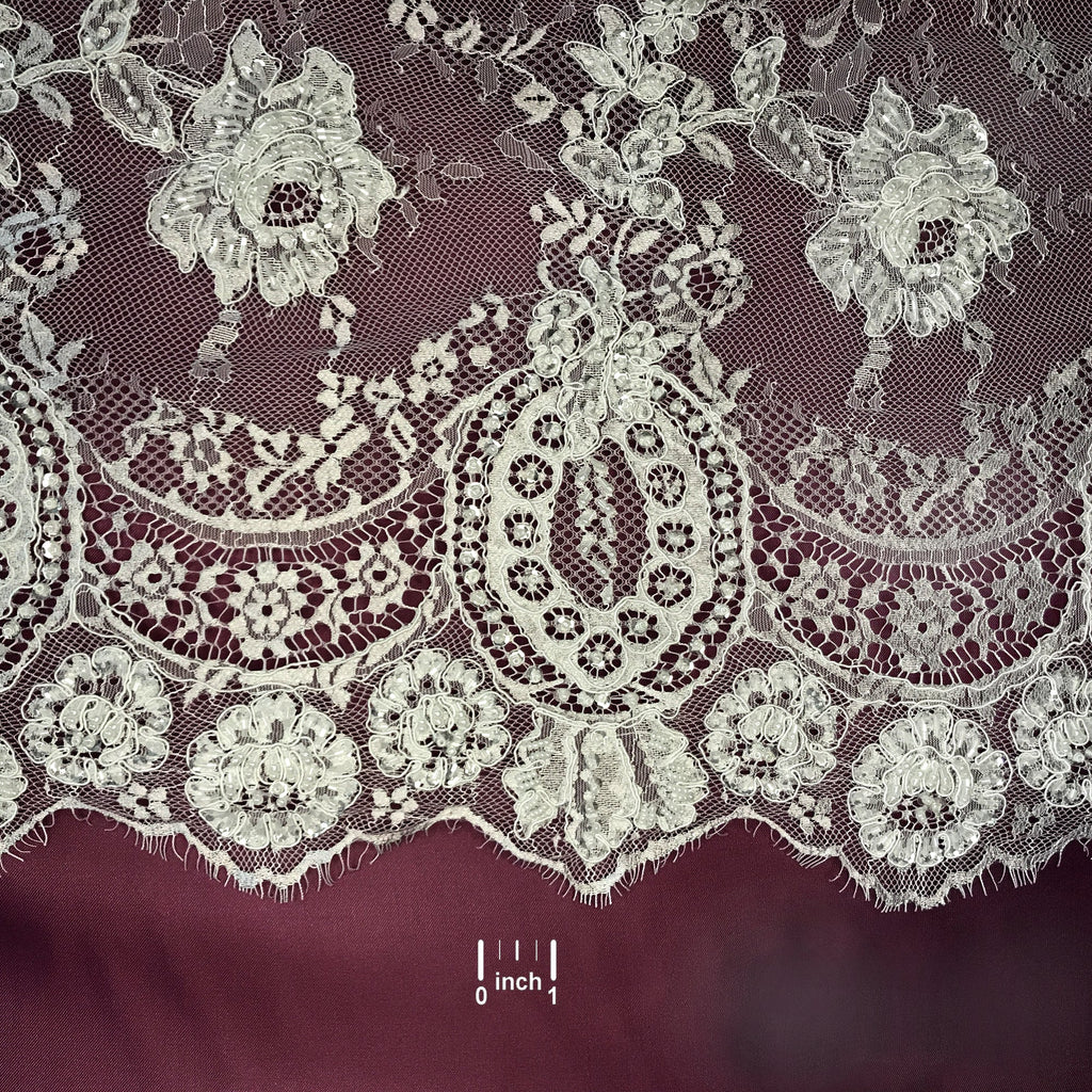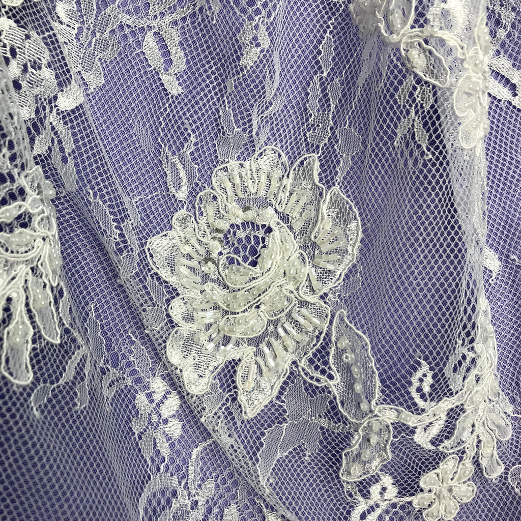 This stunning lace, handcrafted with love and meticulous attention to detail, features delicate floral embroidery on a 100% polyester net mesh base.  This design boasts beautiful corded details and is accentuated by shimmering beads and sequins, creating a truly one-of-a-kind look. Both edges are scalloped. This exquisite lace is sold in convenient 3-yard precut pieces, perfect for smaller projects or getting you started on your larger creation.