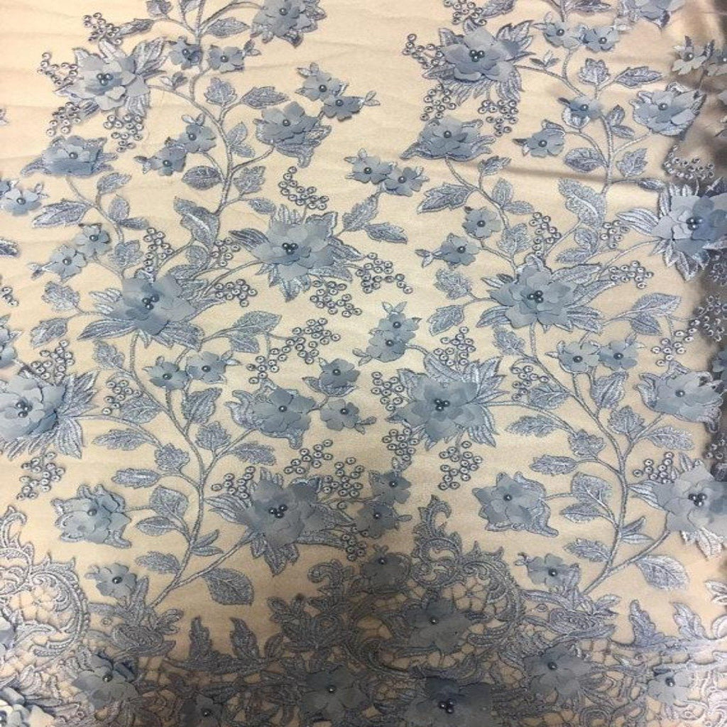 Featuring a unique design backed with a delicate mesh fabric, this material showcases a breathtaking embroidered floral pattern that creates a striking 3D illusion. Adorned with meticulously placed pearls, the fabric not only captivates the eye but also adds a touch of elegance and sophistication to any creation.