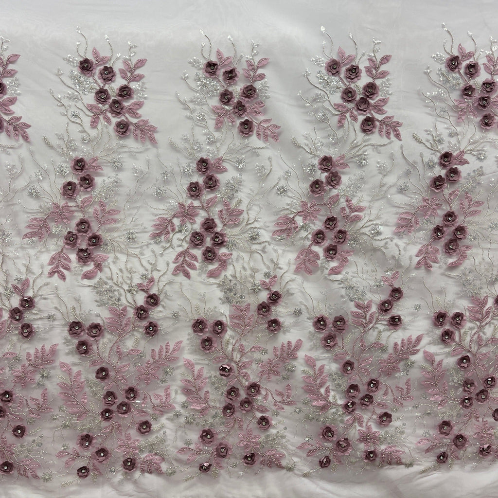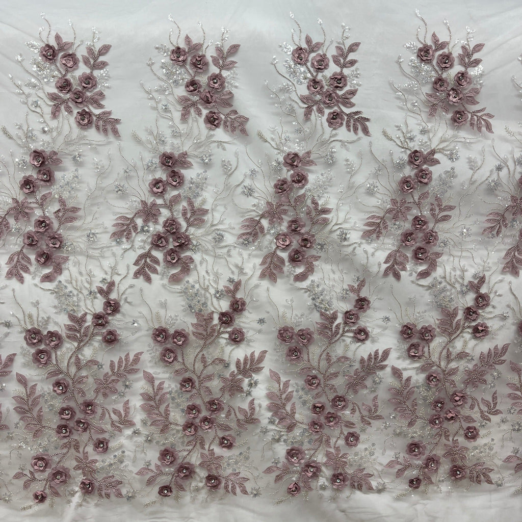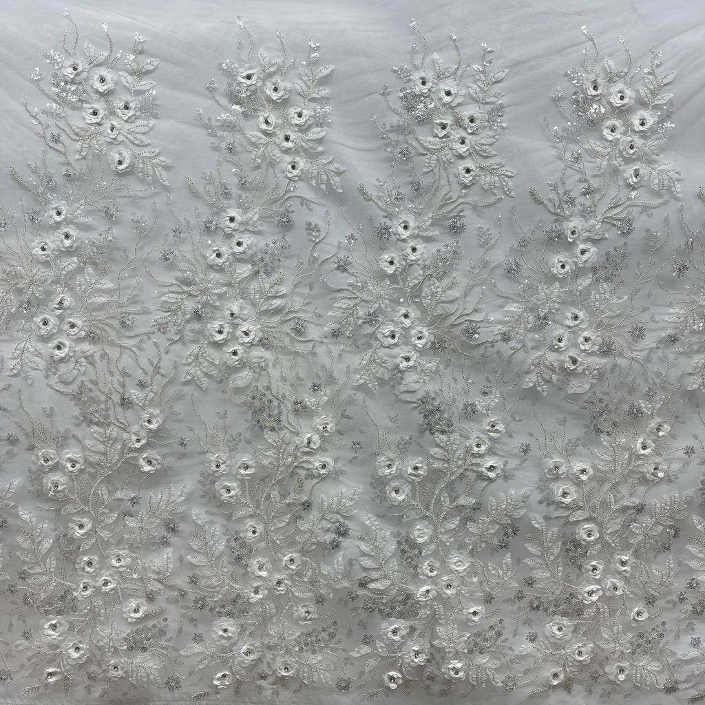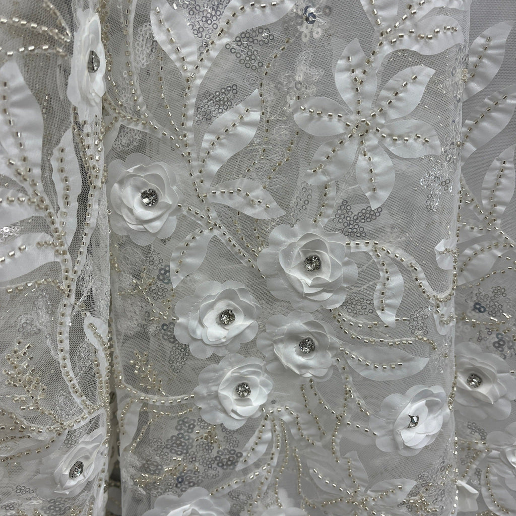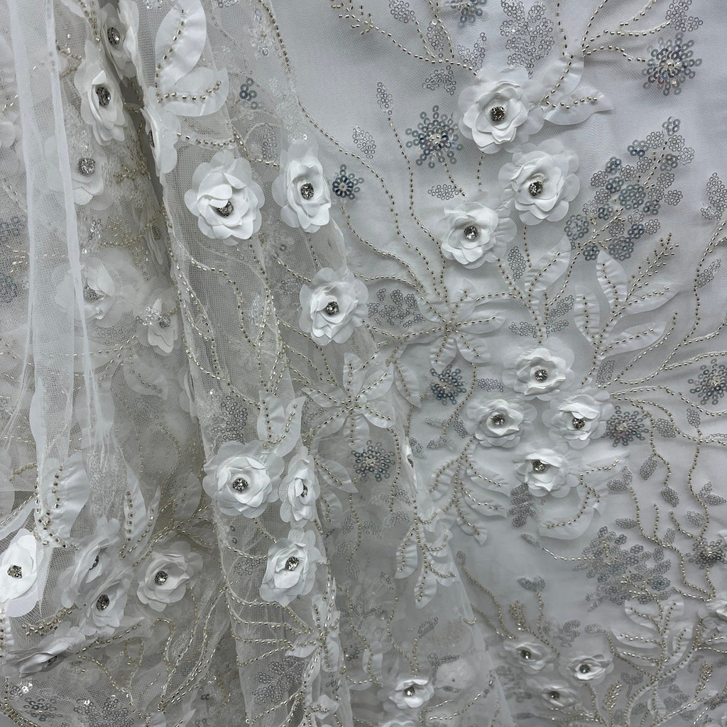 Add a romantic touch to your creations with this exquisite Beaded and heavily sequined 3D Floral Lace Fabric. Designed on soft tulle mesh, it features hand-sewn 3D satin flowers with rhinestone centers, shimmering beads, sequins, and embroidered leaves for a beautifully dimensional look.