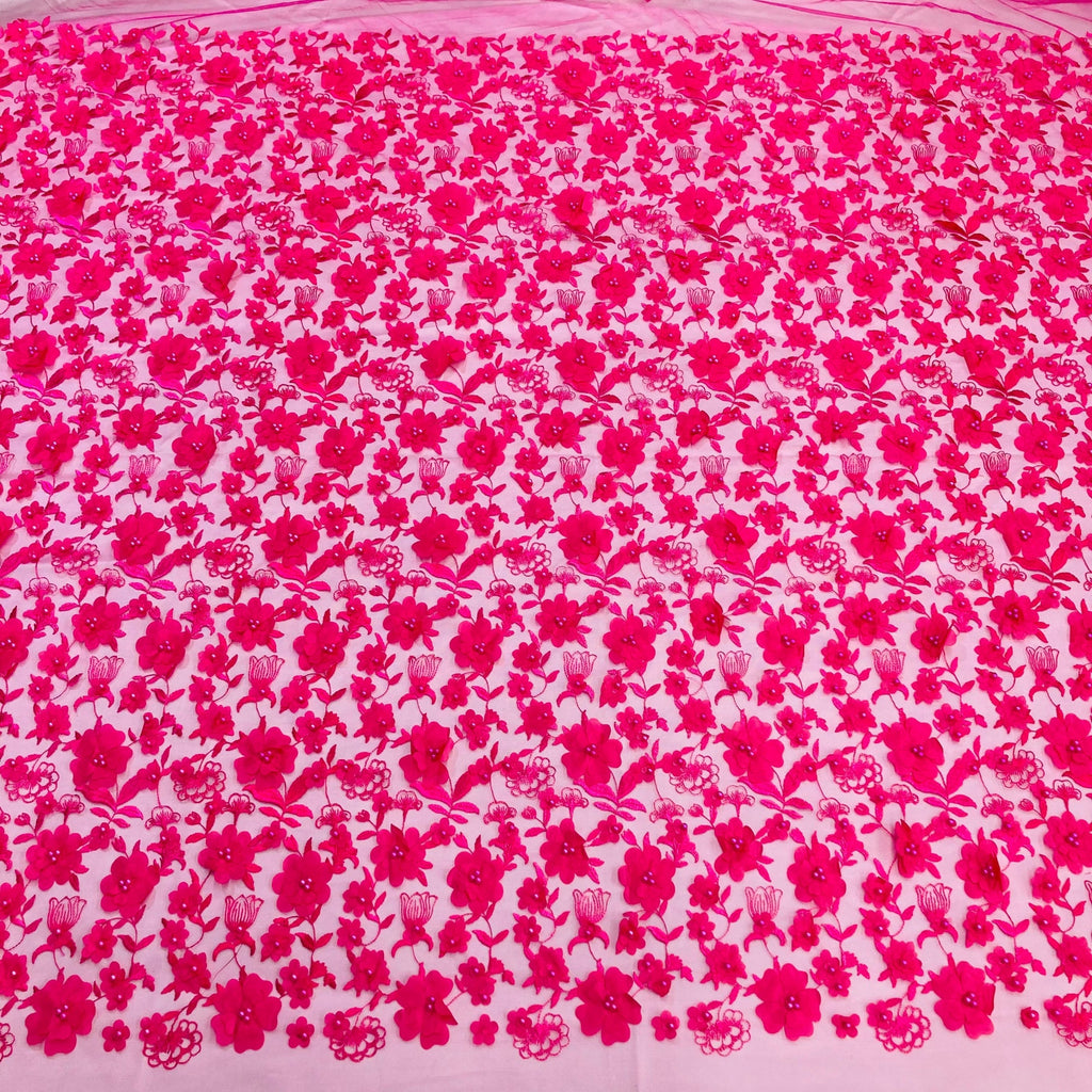 Bring charm to your creations with this Beaded 3D Floral Lace Fabric from Lace USA. Crafted on soft polyester mesh, it features dense floral embroidery with layered 3D satin flowers and hand-sewn pearl bead accents, adding rich texture and a romantic finish.