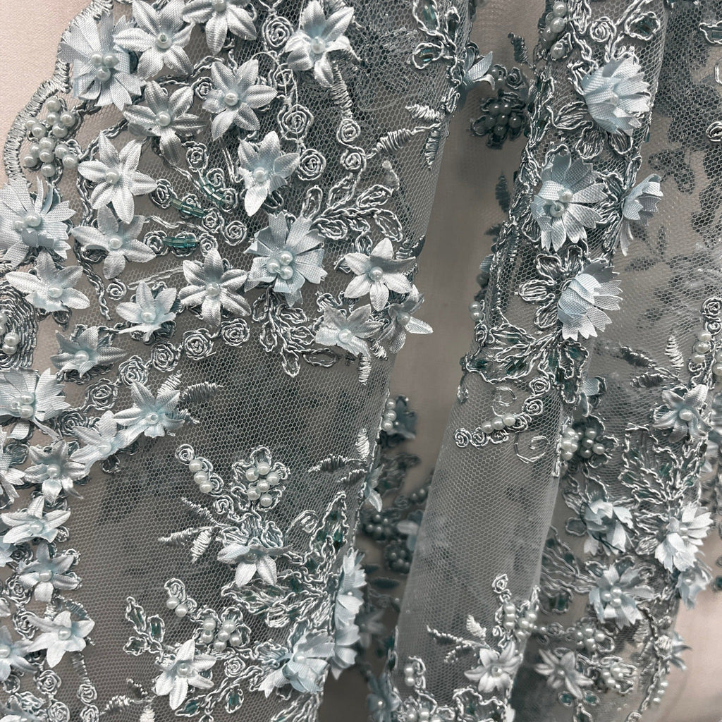 Add a touch of elegance and beauty to any special occasion with our Beaded 3D Floral Lace Fabric Embroidered on 100% Polyester Net Mesh. This luxurious fabric is handmade with a high quality, durable, heavy weight construction that is perfect for making stunning wedding dresses, evening gowns, quinceanera dresses, dance costumes and more. The fabric features a gorgeous, intricate 3D couture lace beaded design which will make a statement no matter how you use it. Craft beautiful evening dresses with its luxurious lace beaded embroidered lace, or make exquisite quinceanera dresses with its elegantly beaded 3D lace. This decorative 3D lace is perfect for any special occasion, adding an extra touch of sophistication and beauty. Add glamour and style to any costume with its stunning beaded 3D bridal lace, or make a show-stopping dance costume with its eye-catching beaded 3D lace. The Beaded 3D Floral Lace Fabric Embroidered on 100% Polyester Net Mesh is available in 9 different colors and ships within 24 business hours. Get now and add a touch of elegance to any project! Approximately 50" Wide.