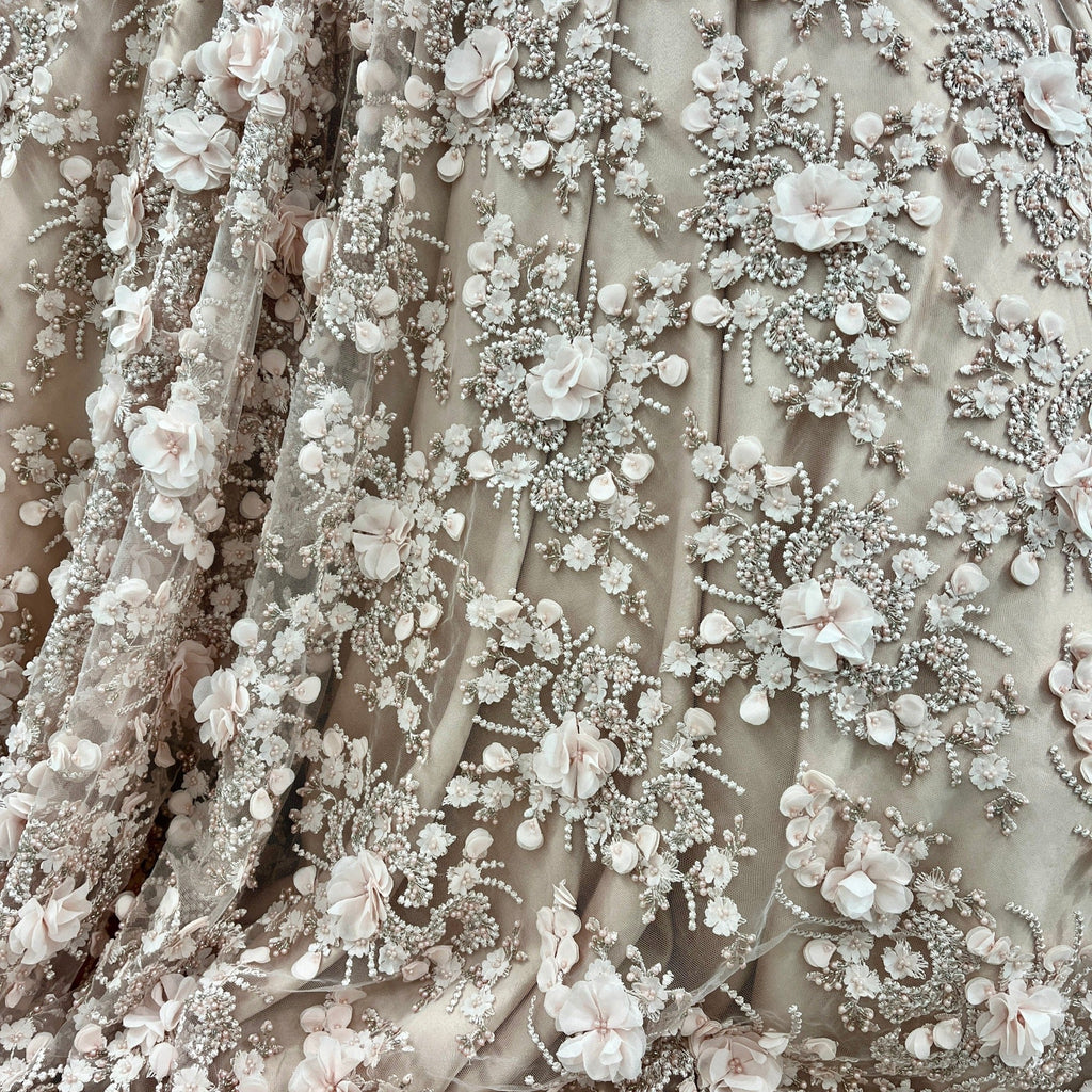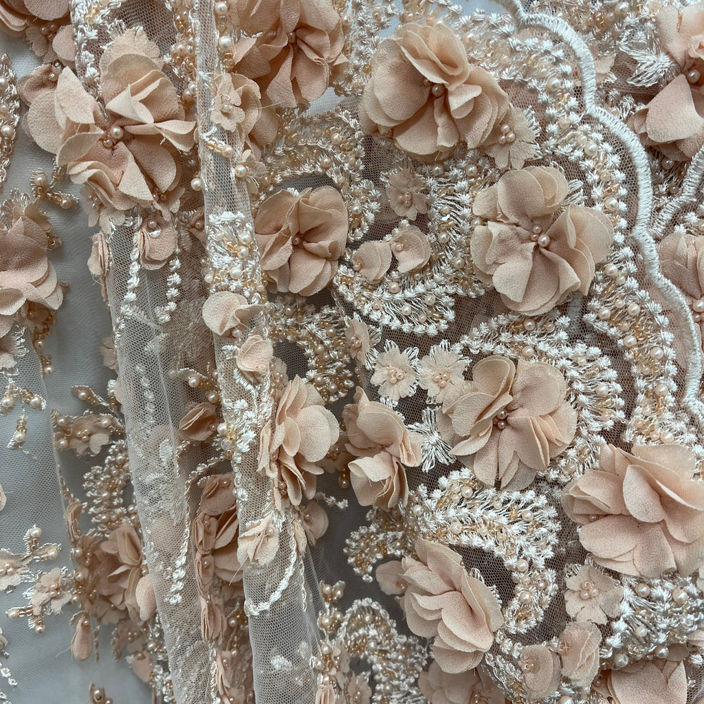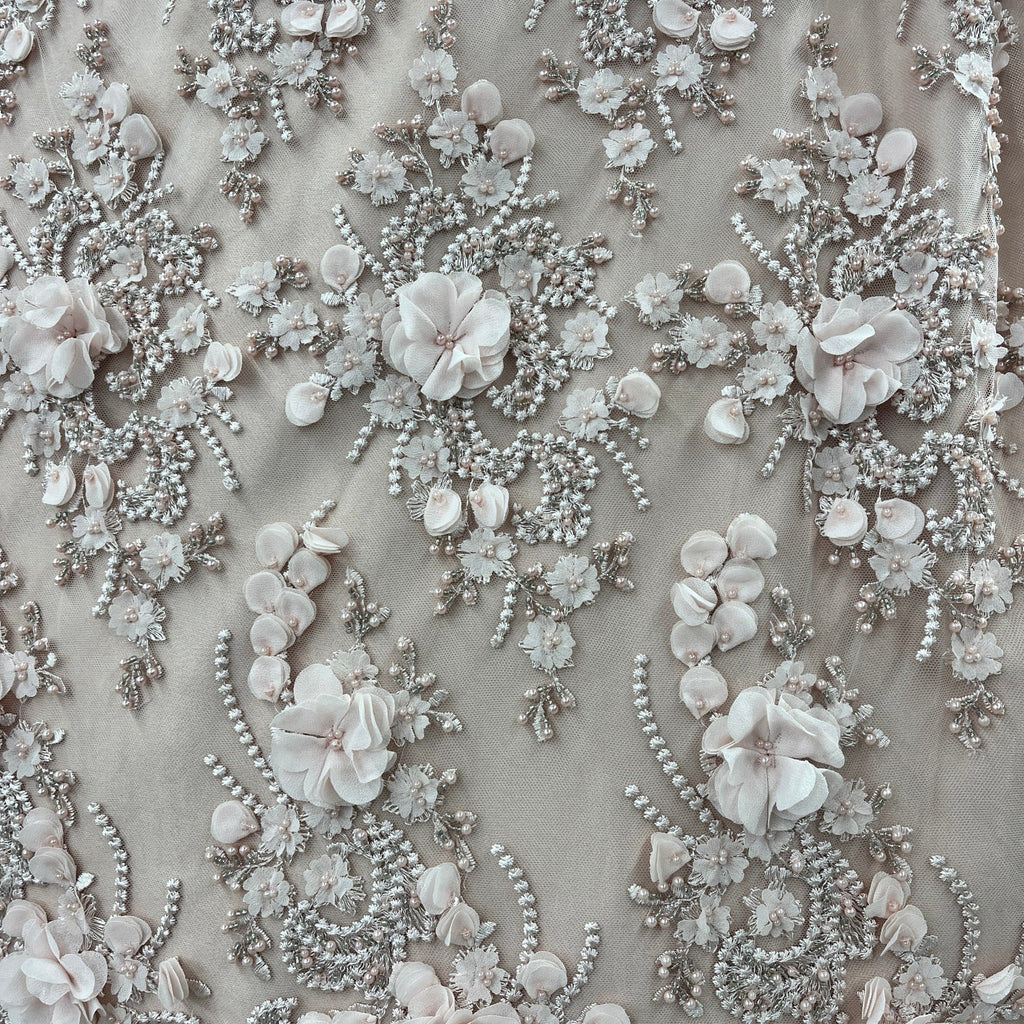 Add a touch of elegance and beauty to any special occasion with our Beaded 3D Floral Lace Fabric Embroidered on 100% Polyester Net Mesh. This luxurious fabric is handmade with a high quality, durable, heavy weight construction that is perfect for making stunning wedding dresses, evening gowns, quinceanera dresses, dance costumes and more. The fabric features a gorgeous, intricate 3D couture lace beaded design which will make a statement no matter how you use it. Craft beautiful evening dresses with its luxurious lace beaded embroidered lace, or make exquisite quinceanera dresses with its elegantly beaded 3D lace. This decorative 3D lace is perfect for any special occasion, adding an extra touch of sophistication and beauty. Add glamour and style to any costume with its stunning beaded 3D bridal lace, or make a show-stopping dance costume with its eye-catching beaded 3D lace. The Beaded 3D Floral Lace Fabric Embroidered on 100% Polyester Net Mesh is available in 2 different colors and ships within 24 business hours. Get now and add a touch of elegance to any project! Approximately 48" Wide.