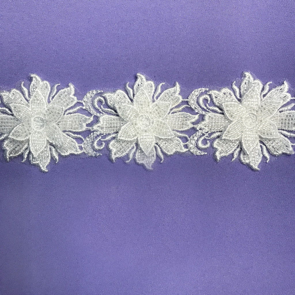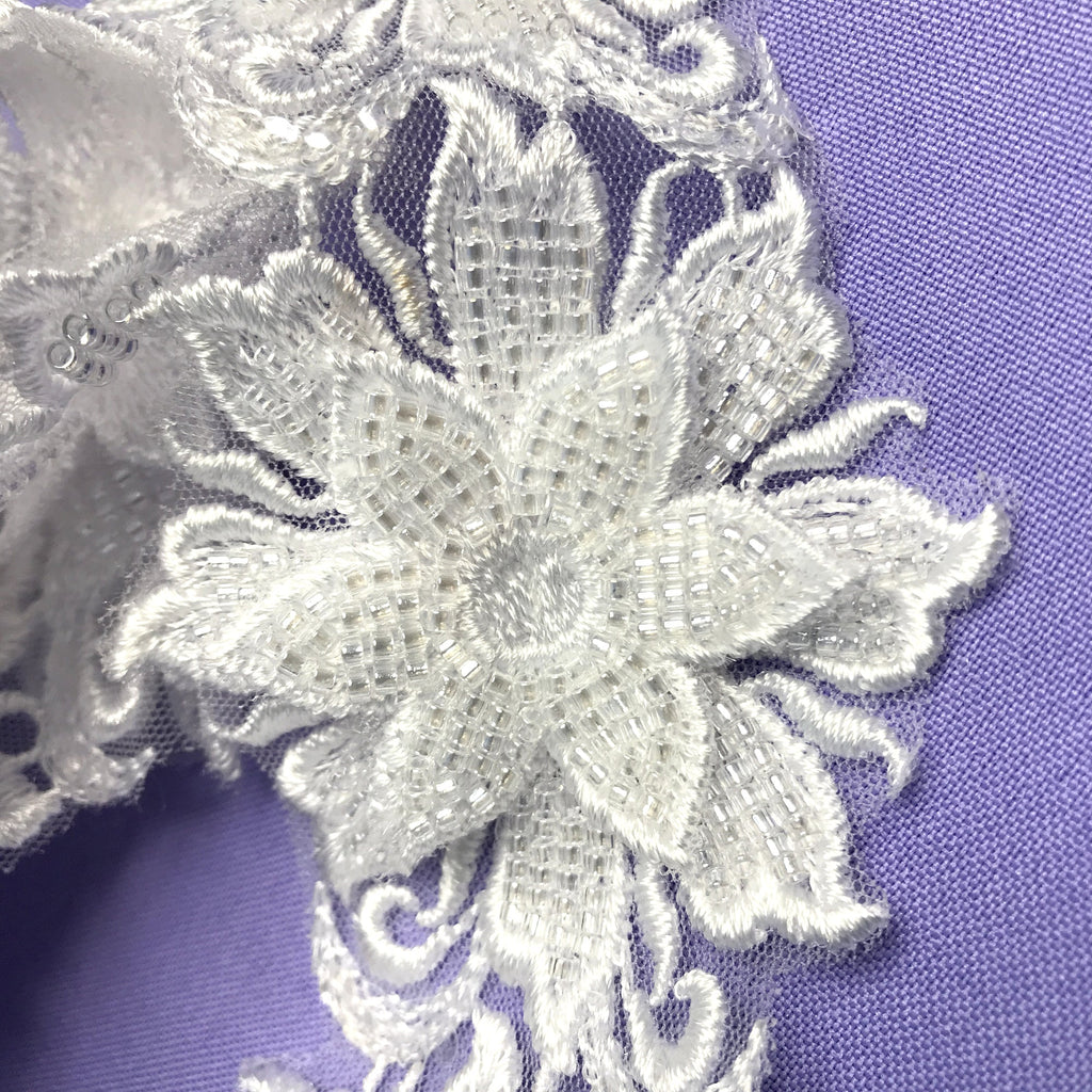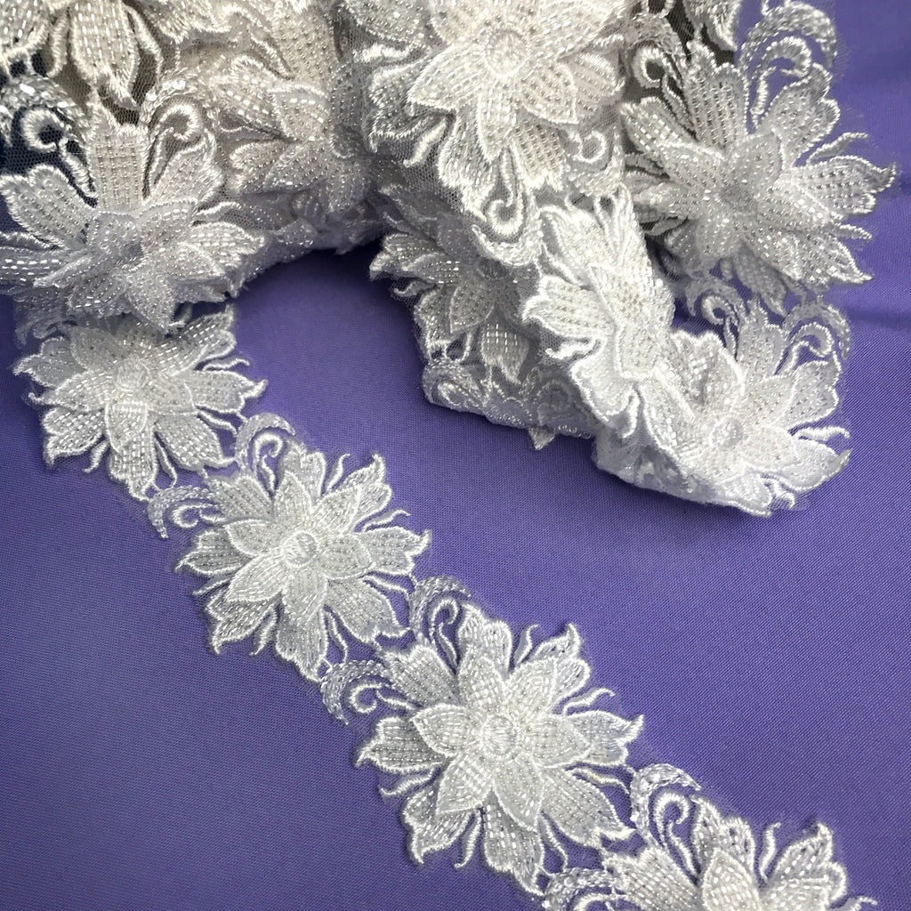 Handmade, high quality Beaded 3D Floral Lace Trimming Embroidered on 100% Polyester Net Mesh. Durable heavy weight fabric. Beautiful on wedding dresses, evening gowns, dance costumes, and more.