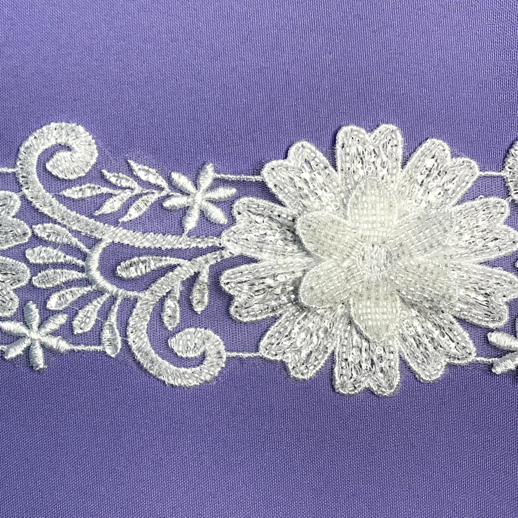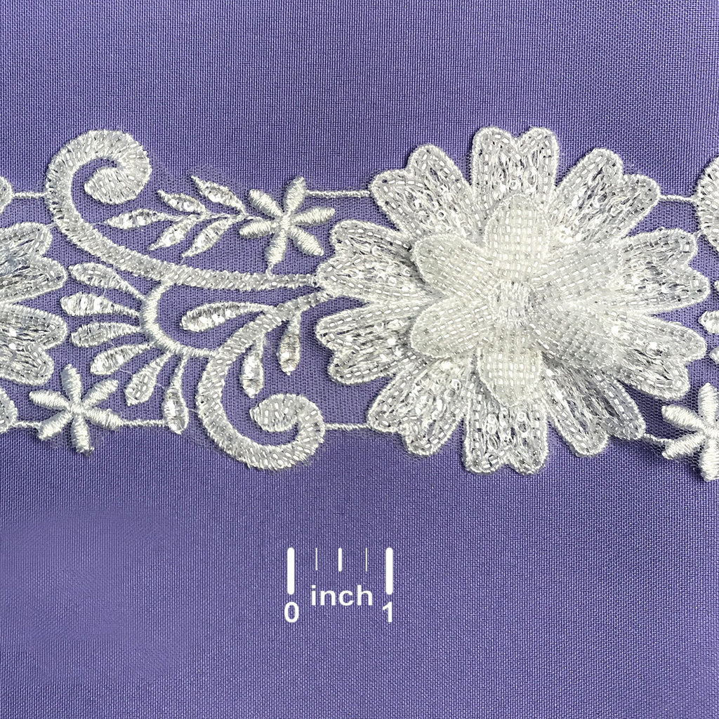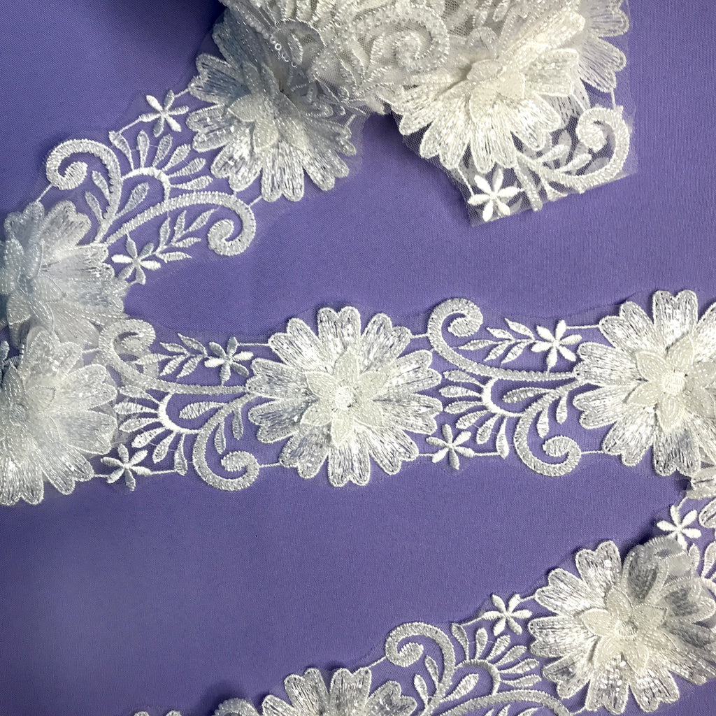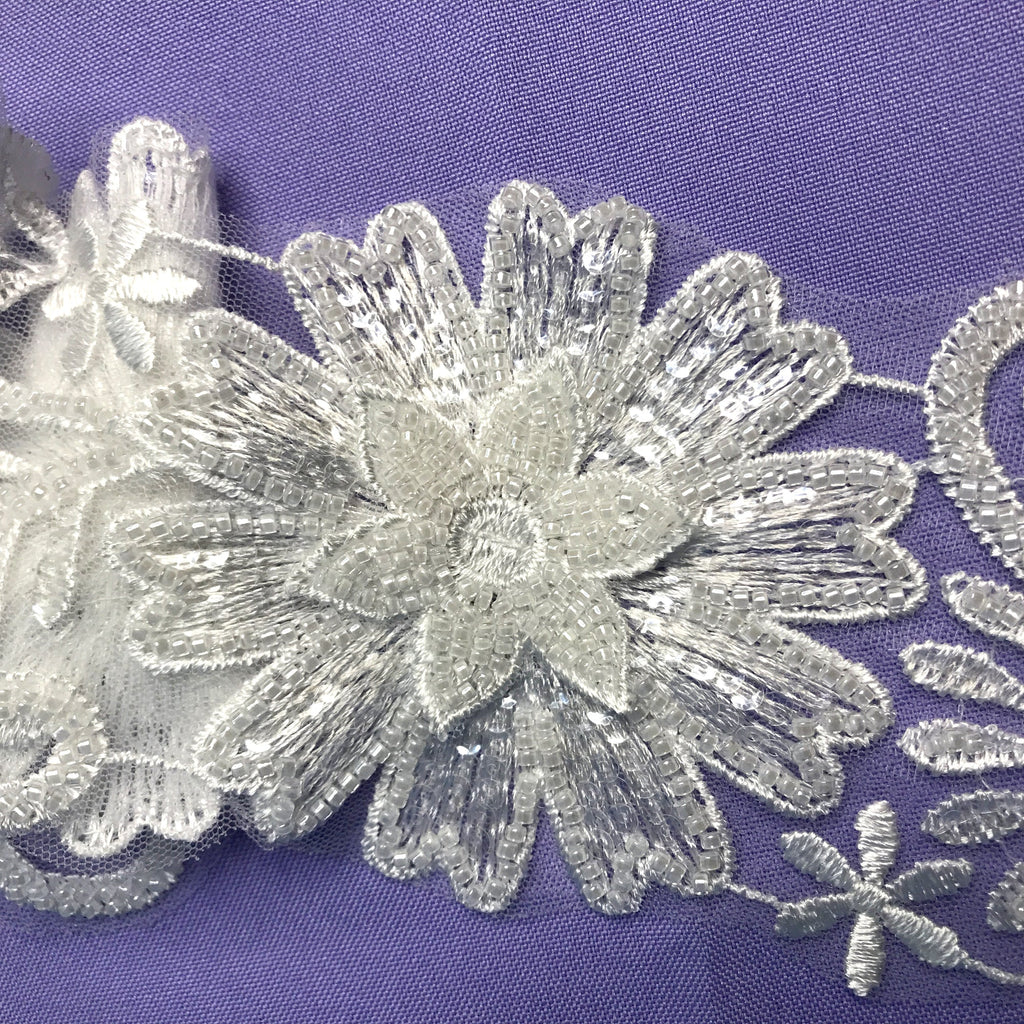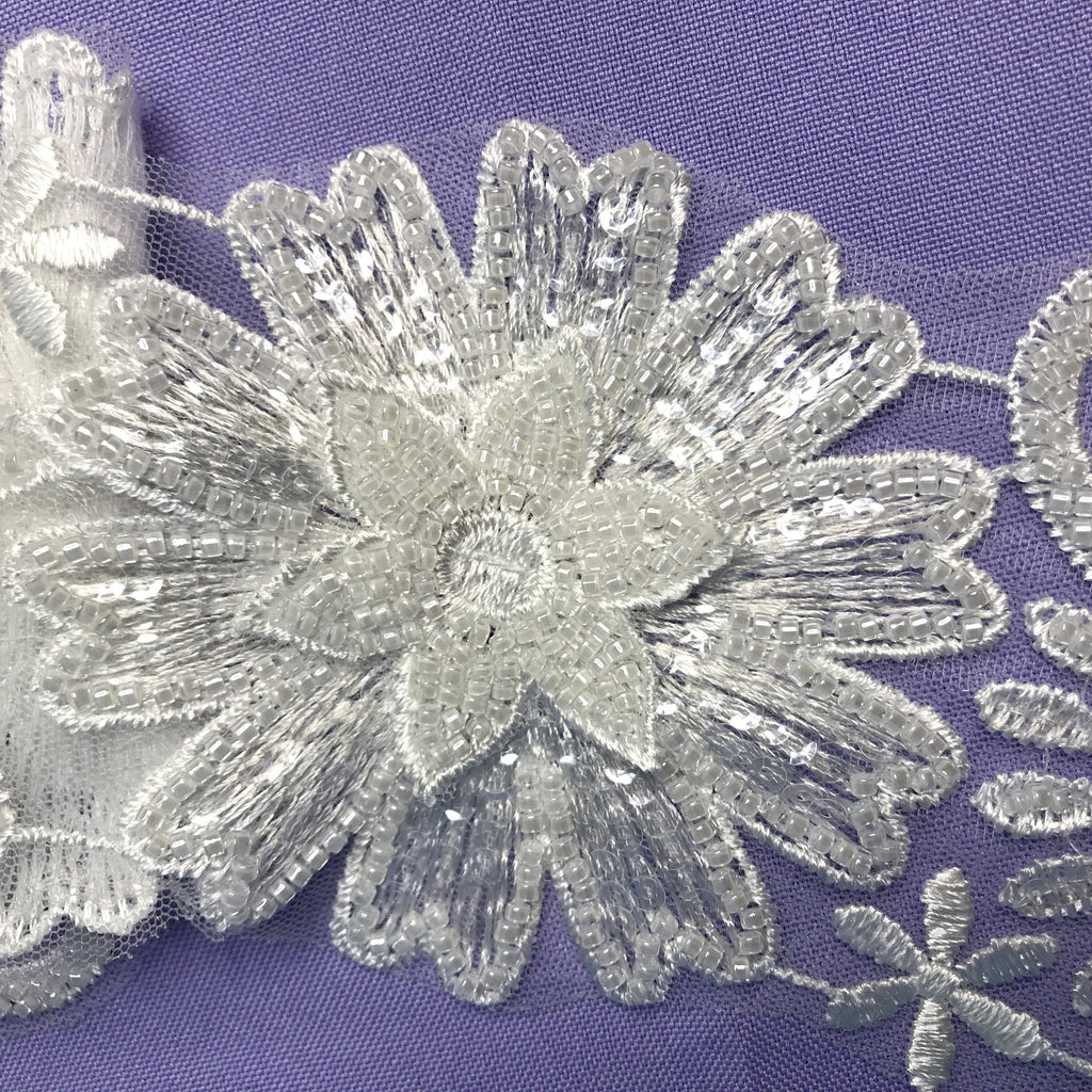 Handmade, high quality Beaded 3D Floral Lace Trimming Embroidered on 100% Polyester Net Mesh. Durable heavy weight fabric. Beautiful on wedding dresses, evening gowns, dance costumes, and more.