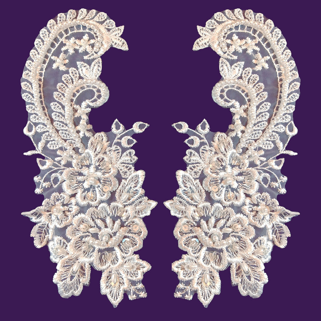 Handmade, high quality beaded lace applique embroidered on 100% Polyester Organza.   highlighted with elegant  pearls and sequins, perfect on wedding dresses, communion dresses, flower girl dresses,, dance costumes, home decor, and DIY projects, this applique is sold in symmetrical pairs and is guaranteed to make you shine on your special day.