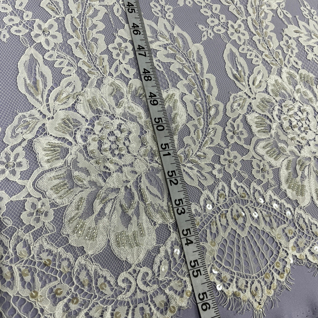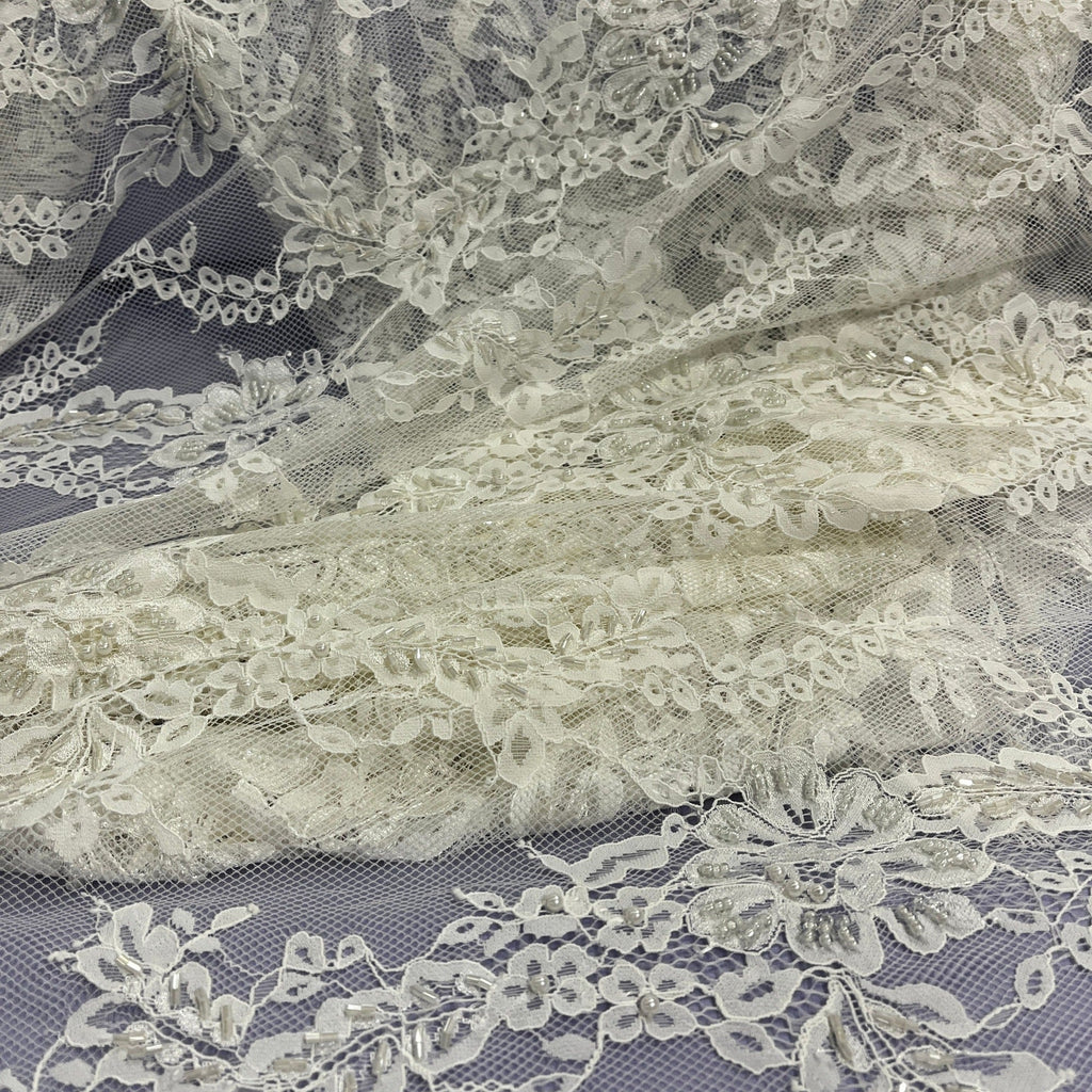 Dazzle your guests and make them remember your event forever with our stunning Beaded Chantilly Embroidered Lace Fabric with Eyelash Scallop from Lace USA! Handmade with the highest quality, this gorgeous fabric is perfect for making wedding dresses, evening gowns, dance costumes and more. With its timeless Alencon lace, beaded, floral, French lace, mesh, net, pearl and sequin details, you can craft luxurious pieces for all kinds of special occasions. Each piece of fabric spans approximately 56" wide and comes in Ivory. Shop for 1 piece of fabric now and get 3 yards of fabric, plus get your order shipped within 24 business hours. Don't wait any longer - make your outfit shine with our luxurious fabric today!