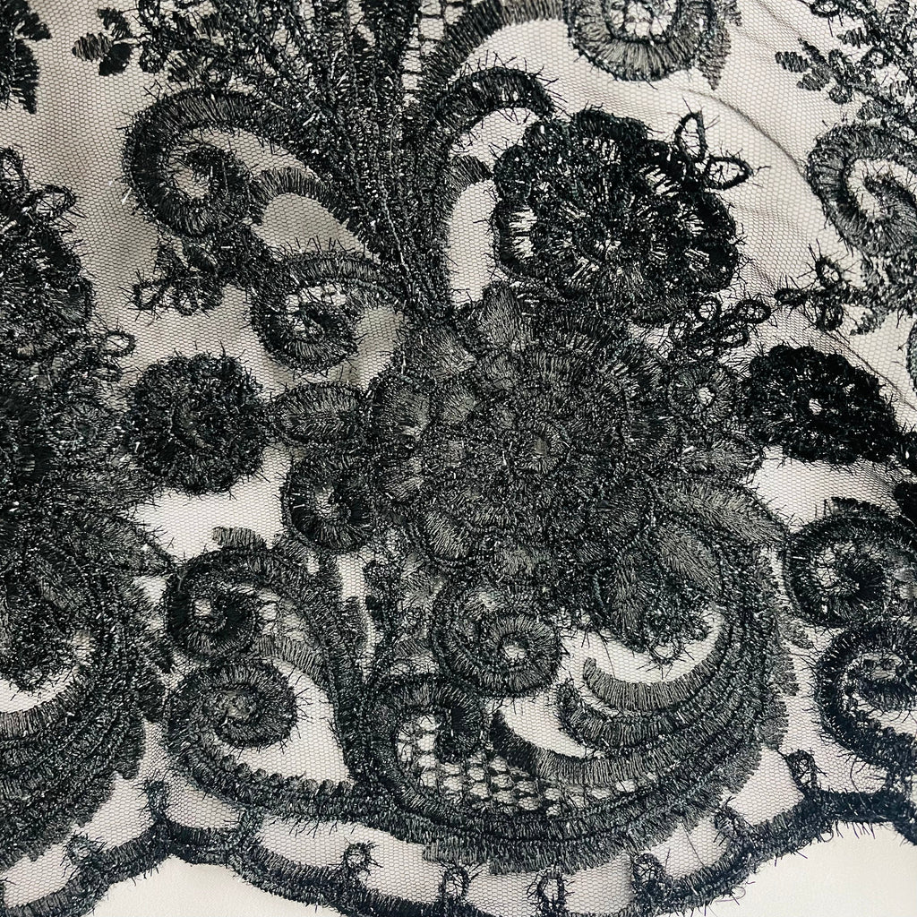 Introducing the stunning Beaded & Corded Lace fabric embroidered on 100% Polyester Net Mesh from Lace USA. This exquisite fabric is perfect for creating beautiful wedding dresses, evening gowns, dance costumes, and more. Crafted with love and care, this one-of-a-kind material features hand-beaded and corded lace in an elegant design that is sure to turn heads. Designers, fashionistas, and beyond will love the versatility of this luxurious fabric, which can be used to create stunning pieces for a variety of special occasions, such as weddings, proms, quinceañeras, or any other special event. The fabric is made of 100% polyester, making it lightweight and durable. Available in a classic Black color, the fabric measures approximately 56" wide and comes with a minimum yard order. From beaded couture lace to corded evening dress lace and beaded quinceanera dress lace, this fabric has it all. No matter if you’re creating a special occasion dress, a bridal veil, or a dance costume, this fabric is designed to make all your creations shine. Decorative and elegant, this corded and beaded lace will be a surefire way to make any outfit you make stand out from the rest. Take advantage of this beauty and get your hands on this fabric today!