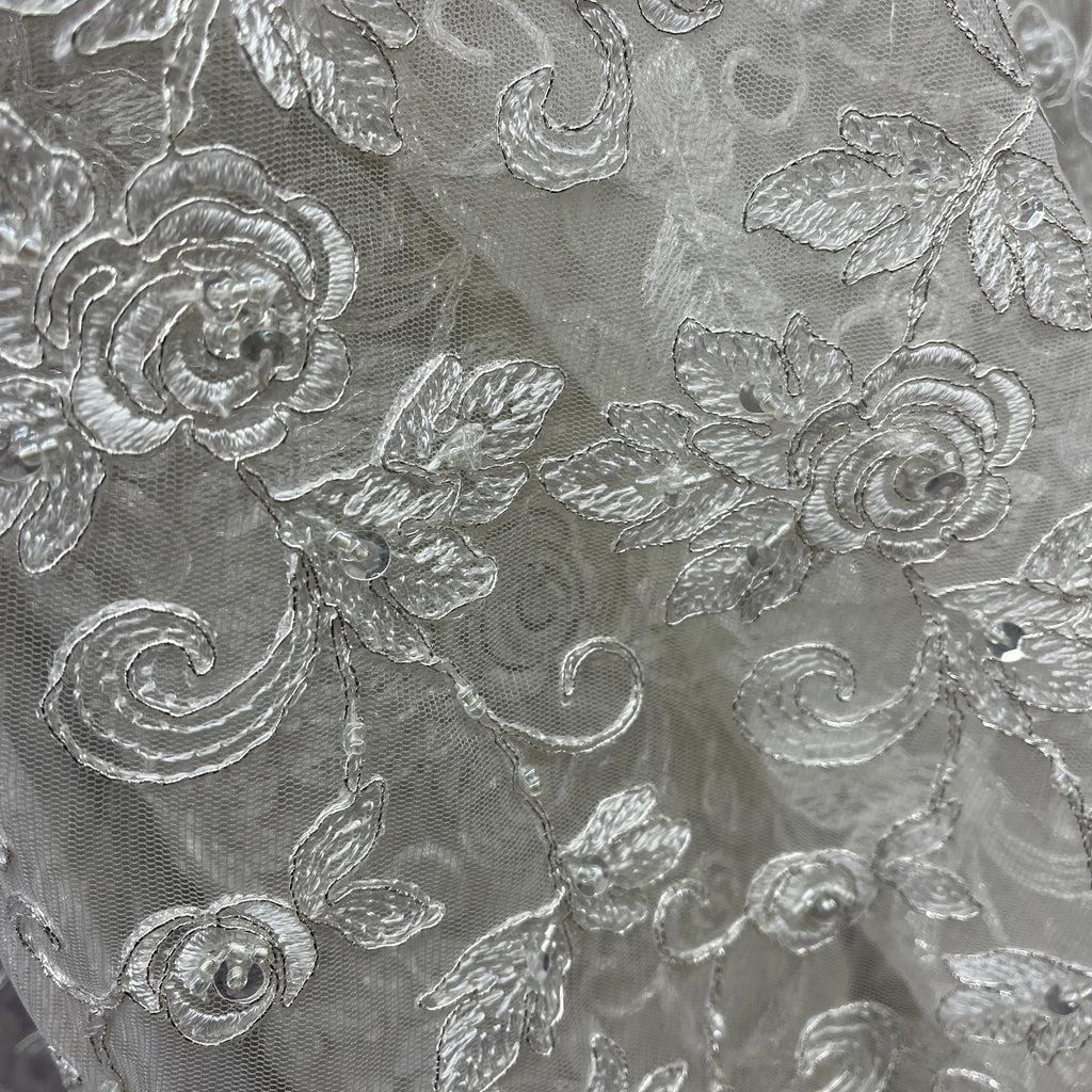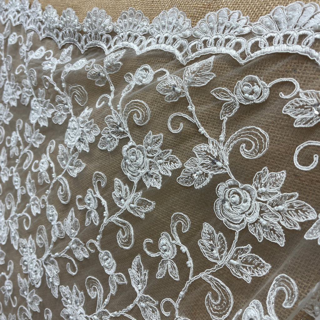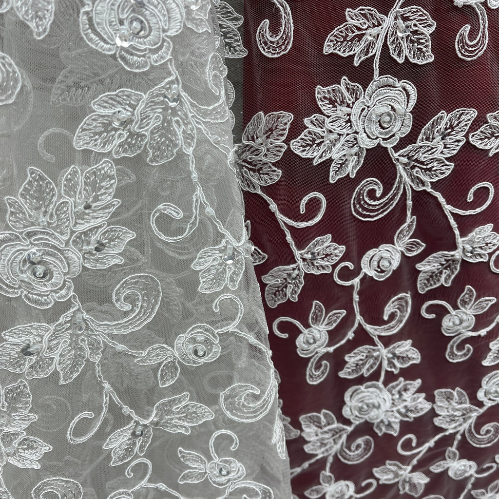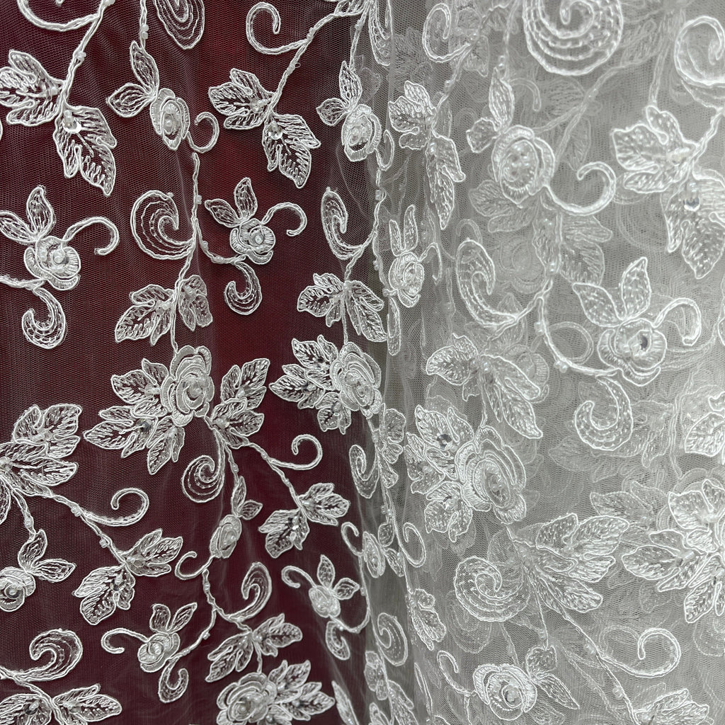 This high-quality fabric combines the timeless beauty of floral Alençon lace with elegant beading, sequins, and corded accents for a luxurious finish. Embroidered with roses, leaves, and scrolling vines, the raised cording adds rich texture while sequins catch the light beautifully.