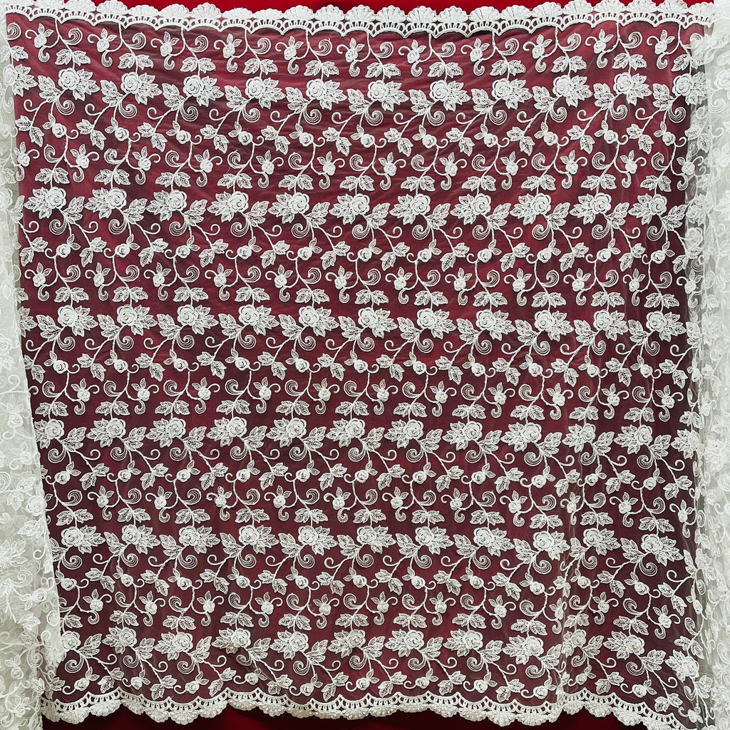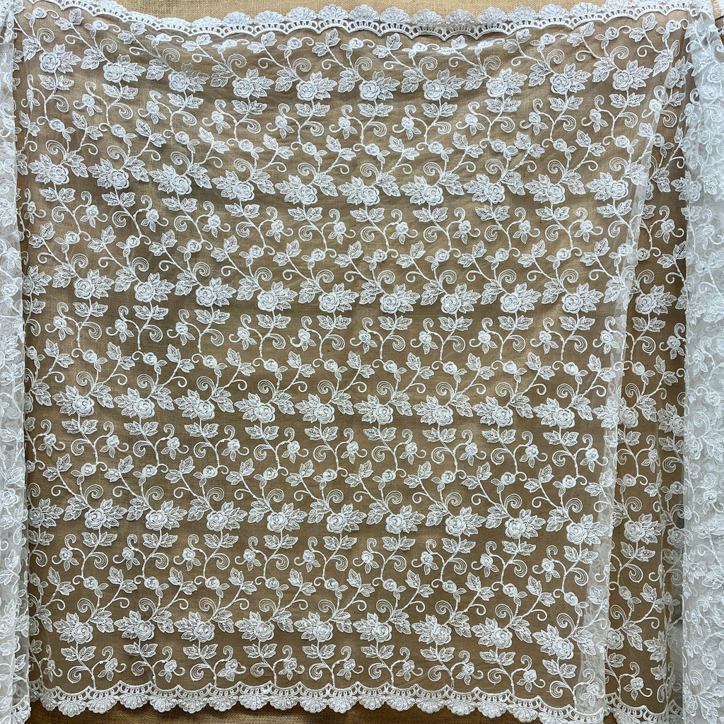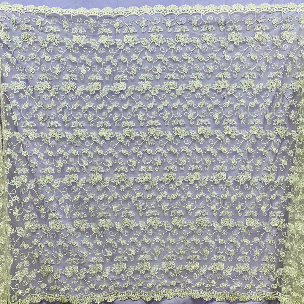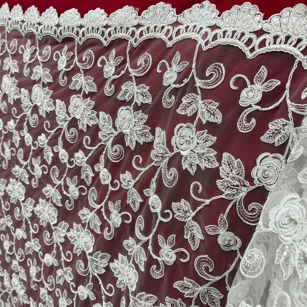 This high-quality fabric combines the timeless beauty of floral Alençon lace with elegant beading, sequins, and corded accents for a luxurious finish. Embroidered with roses, leaves, and scrolling vines, the raised cording adds rich texture while sequins catch the light beautifully.