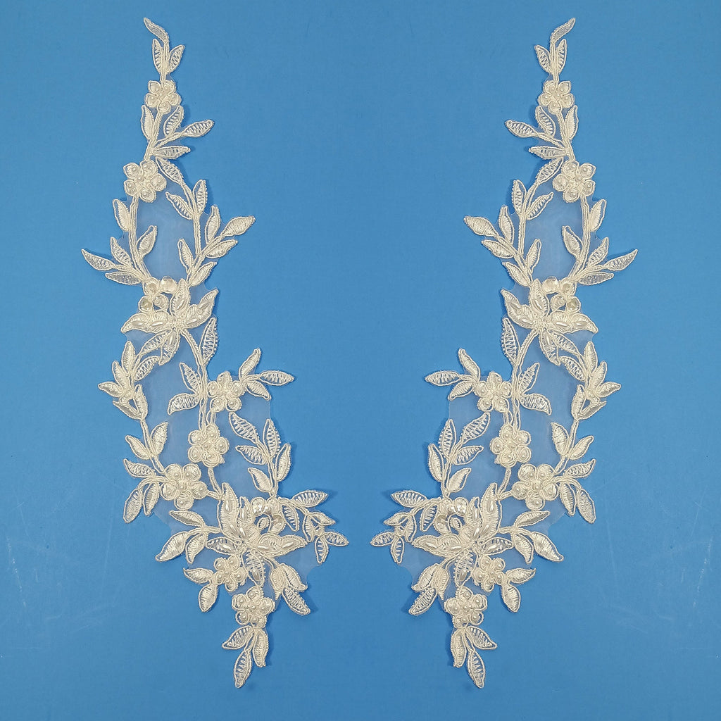 Handmade, high quality Beaded & Corded Floral Lace Applique Embroidered on 100% Polyester Organza. Durable heavy weight fabric. Beautiful on wedding dresses, evening gowns, dance costumes, and more.
