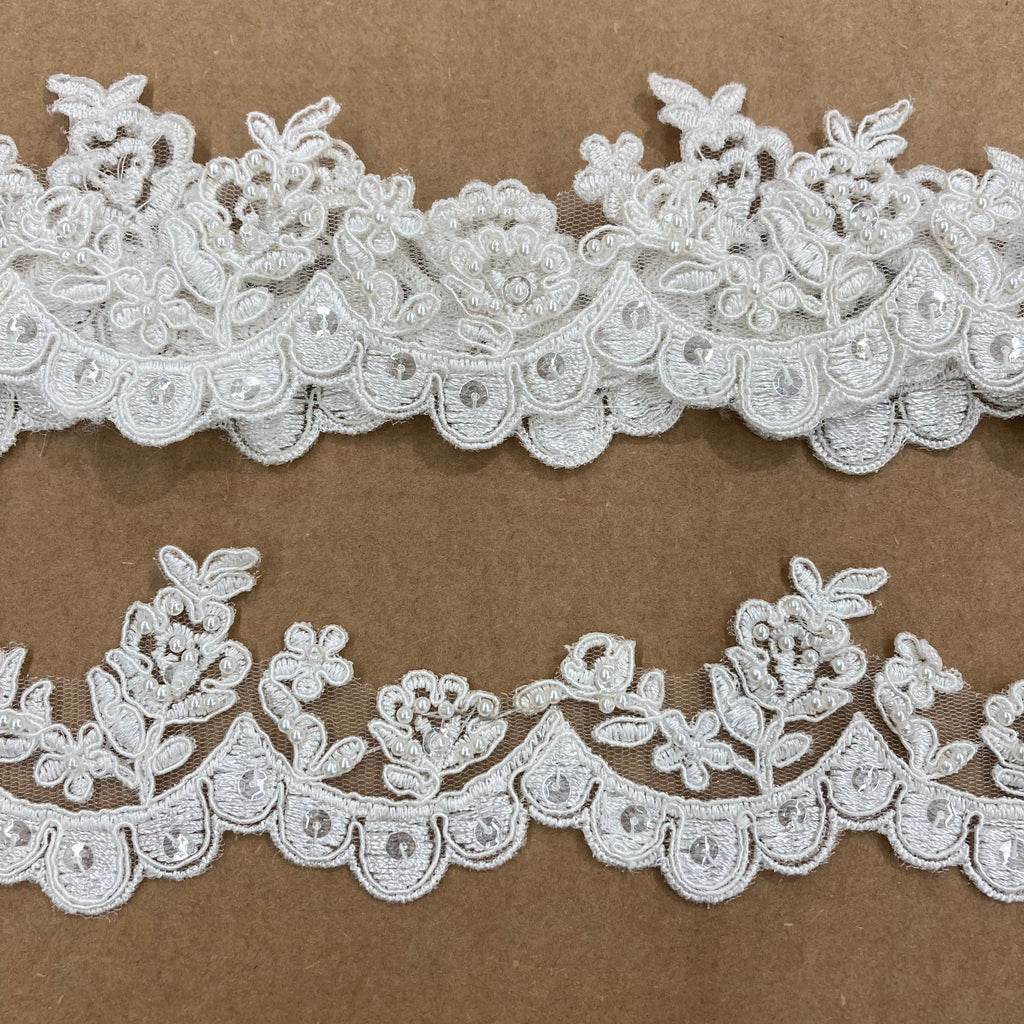 Beaded & Corded Floral Lace Trimming Embroidered on 100% Polyester Net Mesh | Lace USA - 95912W-BP