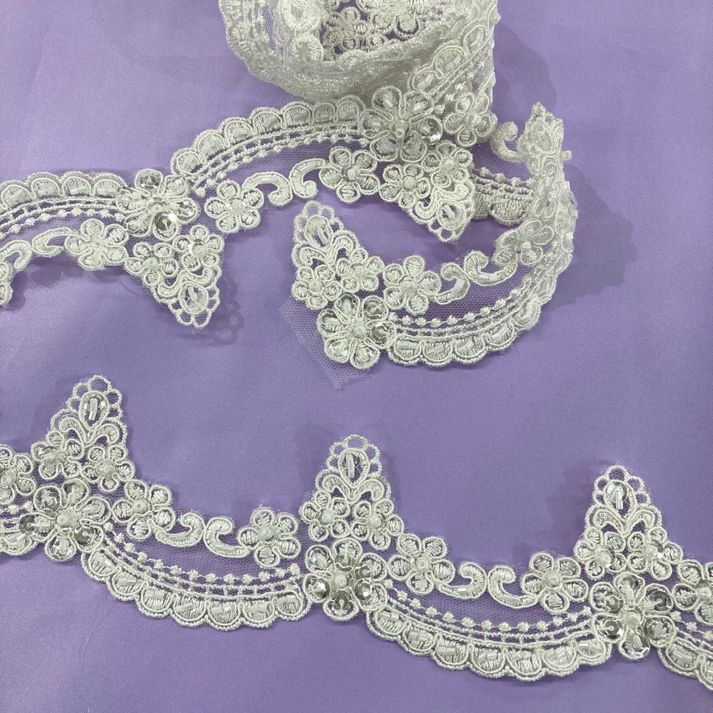 Beaded & Corded Lace Trimming Embroidered on 100% Polyester Net Mesh | Lace USA - 95608W-BP