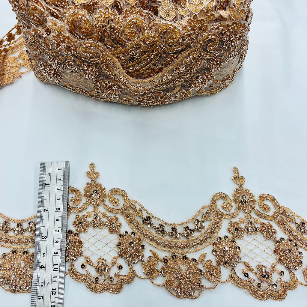 Take your craftsmanship to the highest level with this exquisite Beaded & Corded Lace Trimming Embroidered on 100% Polyester Net Mesh. Craft beautiful designs on wedding dresses, evening gowns, quinceanera dresses, dance costumes, and special occasion dresses with these elegant trim. With our selection of 6 colors, your creations come alive with unmatched vibrancy and exquisite beauty. Our lace trimming is handmade with high quality materials for superior durability and a stunning, finished look. The unique beaded and corded trim adds depth and intricate detailing, offering you the very best in craftsmanship. We offer the ultimate selection in bridal lace trim, corded couture lace trim, beaded couture lace trim, corded evening dress lace trim, beaded evening dress trim, corded quinceanera dress trim, beaded trim for quinceanera dress, corded trim for dance costumes, and beaded trim for dance costumes. The decorative corded and beaded lace trims also provide the perfect finishing touch for any special occasion dresses. Whether it’s our corded embroidered lace trim or beaded embroidered lace trim, our trims will complement any design and finish out your look with unparalleled elegance. Don’t miss this chance to make a lasting impression with our impressive selection of exquisite trim options. Approximately 5" Wide / Ships within 24 business hours.