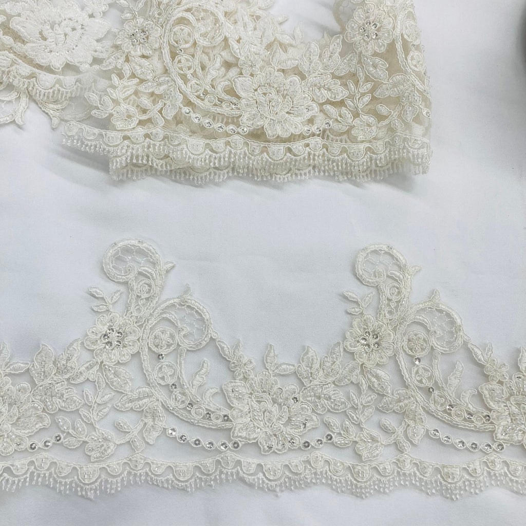 Introducing the stunning Beaded & Corded Lace Trimming Embroidered on 100% Polyester Net Mesh from Lace USA! This high quality trim is perfect for adding the perfect finishing touch to any wedding dress, evening gown, quinceañera dress, or dance costume. This fabric is handmade and extremely durable, made from a heavy weight 100% polyester net mesh and featuring tiny beading and cording that adds an eye-catching sparkle. It comes in four gorgeous colors: white, ivory, champagne, and blush. Let the subtle pearls and sequins of this lace trim adorn your masterpiece, and enjoy the stares of admiration that come with it. Make every look a dreamy affair with this timeless and beautiful trim!