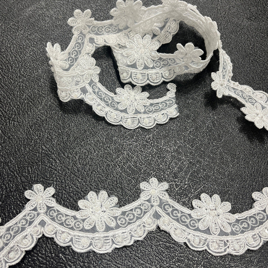 Introducing the exquisite Beaded & Corded Lace Trimming from Lace USA, the perfect addition to your wedding dresses, evening gowns, dance costumes, or any special occasion outfit. The gorgeous trim features 100% polyester mesh that is delicately embroidered with beaded and corded lace accents. Handmade with a heavy weight fabric, this trim will make your look stand out with its exquisite detail. Whether you’re looking for stunning beaded couture lace trim, corded bridal lace trim, corded evening dress lace trim, beaded trim for quinceanera dress, corded trim for dance costume, beaded trim for dance costume, corded embroidered trim, beaded embroidered & corded trim, trim for special occasion dresses, beaded trim for special occasion dresses, decorative corded trim, decorative beaded lace trims, elegant corded lace trims, or elegant beaded lace trimming - this is the trim for you! With two colors available and orders shipped within 24 hours, this trim is sure to make your outfit stand out with its unique and sophisticated detail. Order yours now! Approximately 1.75" Wide. This product comes in 2 different colors.