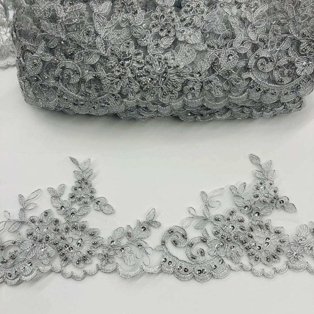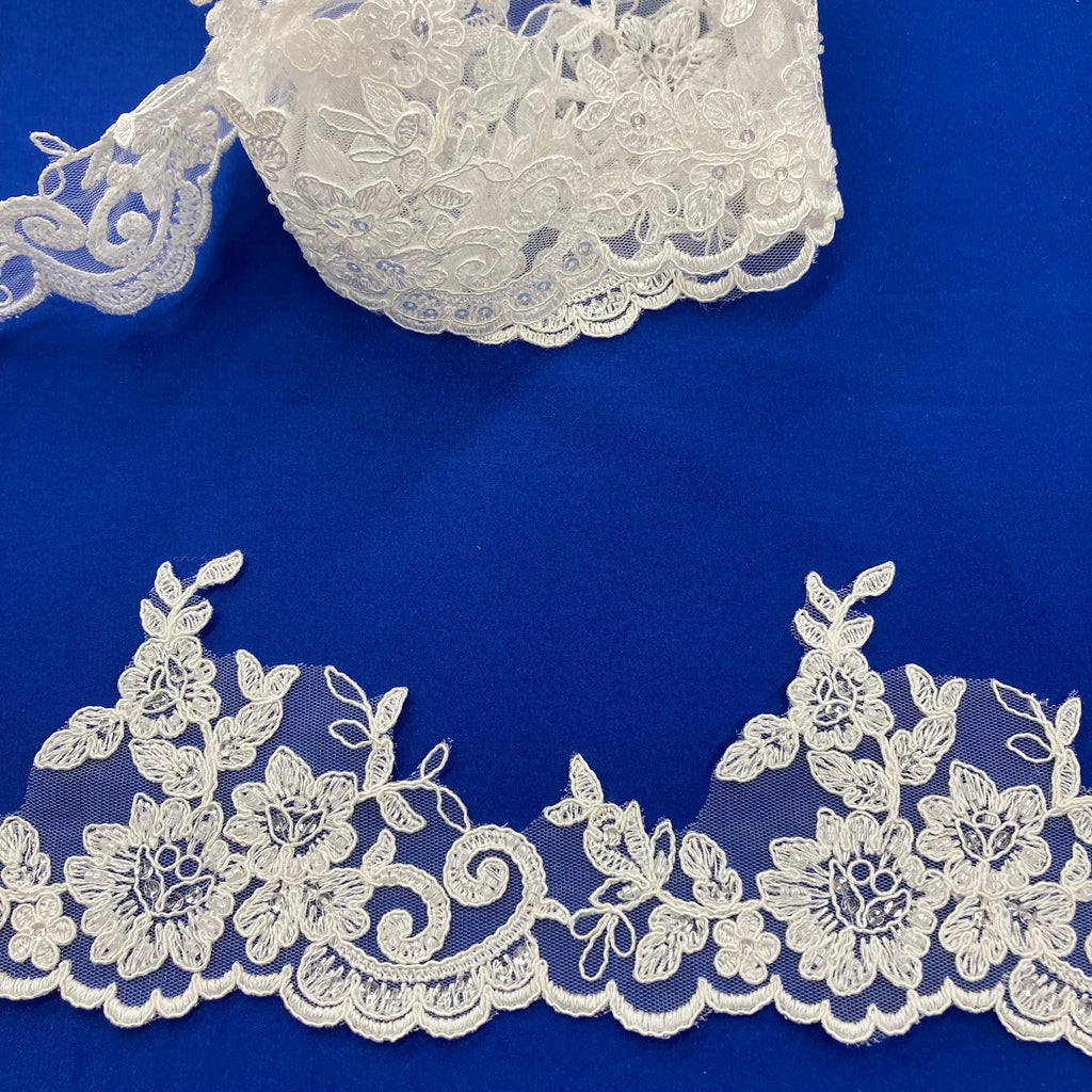 Discover our breathtaking collection of Beaded & Corded Lace Trims from Lace USA! Our exquisite range of trims are handmade using 100% Polyester Net Mesh that are specially designed for bridal gowns, evening dresses, quinceanera dresses, dance costumes and special occasion dresses. This exquisite collection of Beaded & Corded Lace Trimming Embroidered is available in 6 different color schemes and offers a unique combination of beauty and comfort. Our Beaded Couture Lace Trimmings add a touch of elegance to any outfit while our Corded Bridal Lace Trims will give you that unique and glamorous look. For a captivating look, choose our Beaded Evening Dress Trims or Corded Quinceanera Dress Trims, as well as our Beaded and Corded embellishments for dance costumes and special occasion dresses. For a more classic look, go for our Decorative Corded or Beaded Lace Trims. Our Elegant Corded and Beaded Lace Trimmings are perfect for adding a touch of charm and sophistication to any apparel. Shop our Beaded & Corded Lace Trims from Lace USA today and take your wardrobe to the next level! Approximately 4" Wide / Ships within 24 business hours.