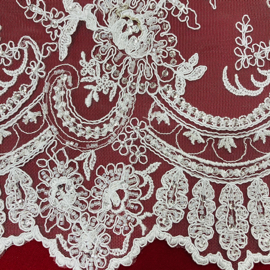 Introducing Beaded & Corded Lace Trimming Embroidered on 100% Polyester Net Mesh from Lace USA. This handmade, high quality lace trimming is perfect for giving your wedding dress, evening gown, dance costume, and more the perfect finishing touch. It is carefully woven to include beautiful beadwork, corded details, and intricate lace embroidery. Our trimming comes in two different colors, so you can choose the one that best matches the theme you have chosen. Make your special occasion dresses stand out by adding a touch of corded, beaded couture lace trim, bridal lace trims, or evening dress lace trims. Create an elegant style with corded embroidered lace trim, beaded embroidered & corded trims, and trims for special occasion dresses. And for a hint of luxury, choose from our selection of decorative corded trim, beaded lace trims, and elegant corded lace trims. At Lace USA, we guarantee you will find the perfect beaded & corded lace trim to give your event its own unique look. Shop now and get your order shipped within 24 business hours. Approximately 14" Wide.