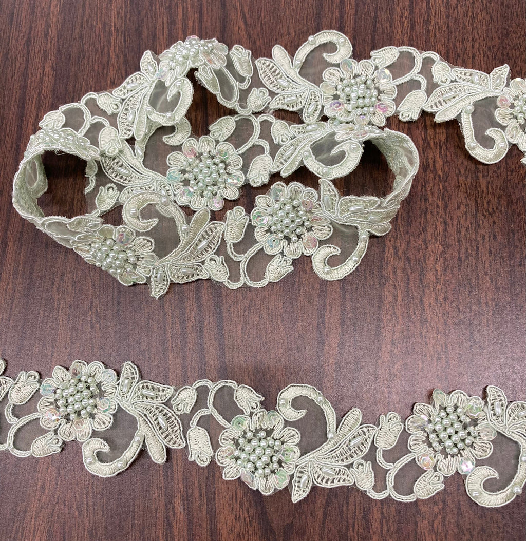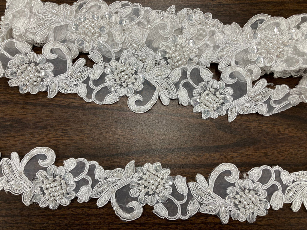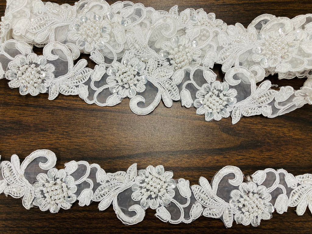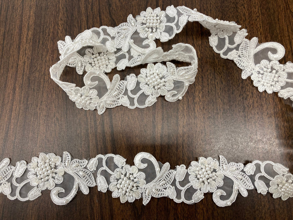 Handmade, high quality Beaded & Corded Lace Trimming Embroidered on 100% Polyester Organza. Beautiful on wedding dresses, evening gowns, dance costumes, and more.
