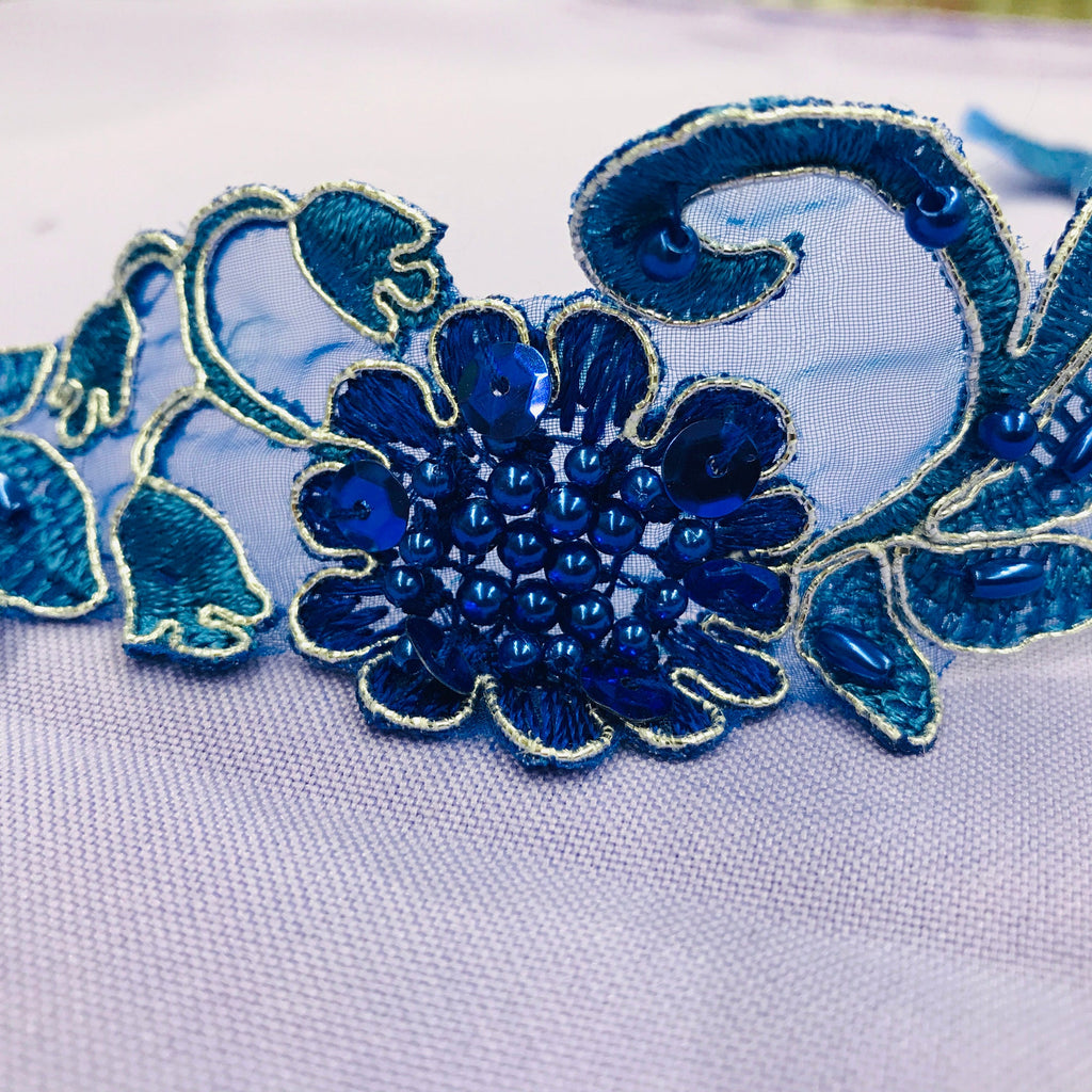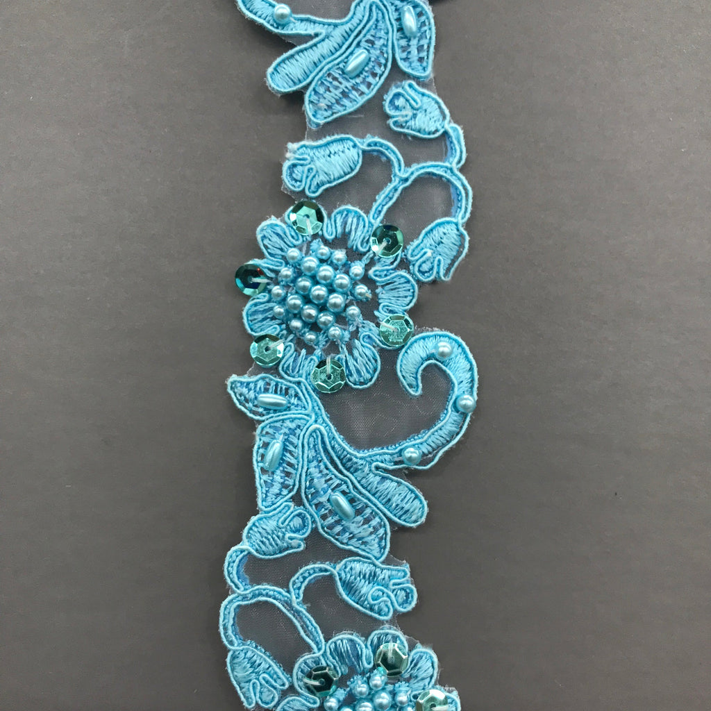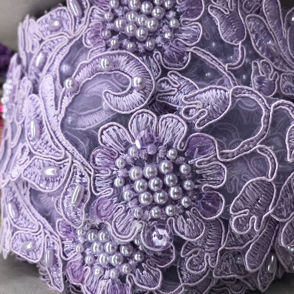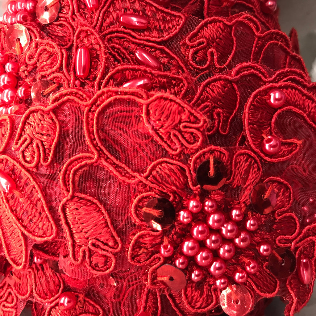 Handmade, high quality Beaded & Corded Lace Trimming Embroidered on 100% Polyester Organza. Beautiful on wedding dresses, evening gowns, dance costumes, and more.