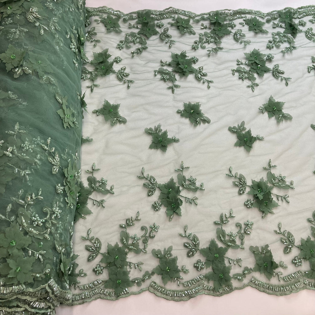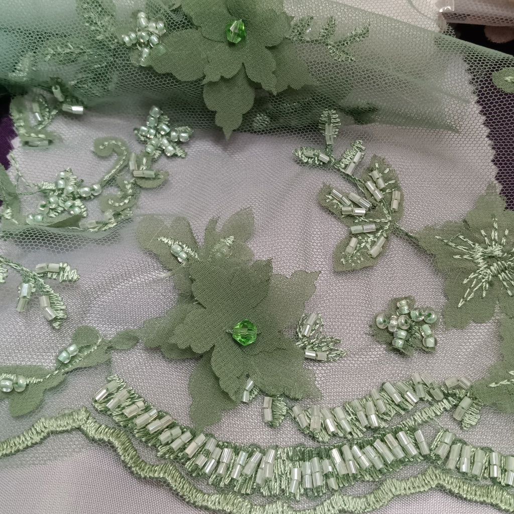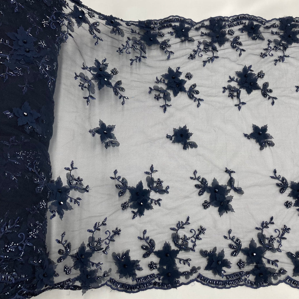 Handmade, high quality Beaded Double Sided 3D Floral Lace Trimming Embroidered on 100% Polyester Net Mesh. Beautiful on wedding dresses, evening gowns, dance costumes, and more.