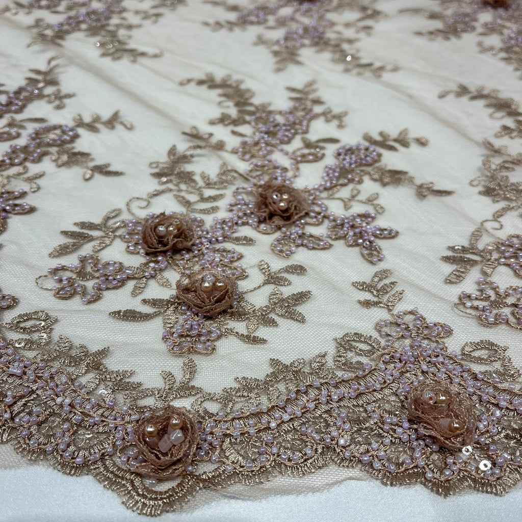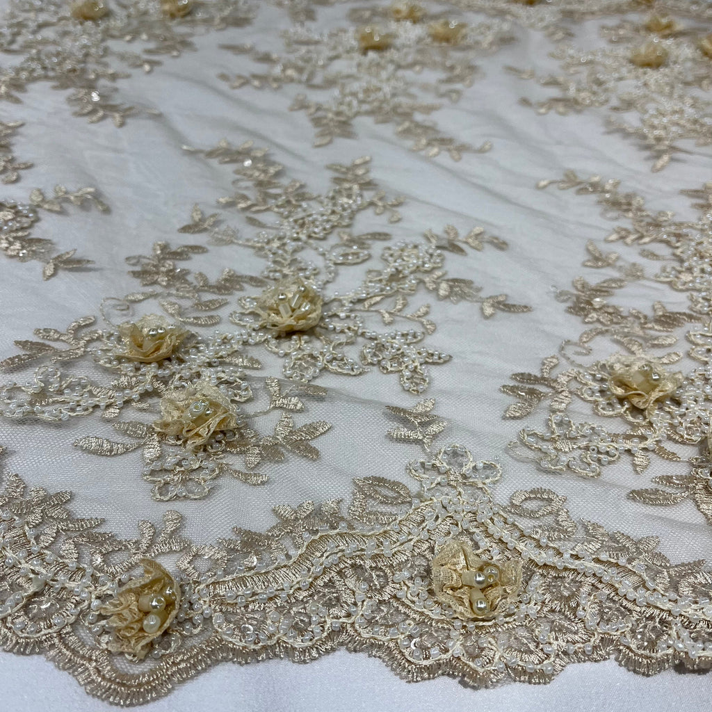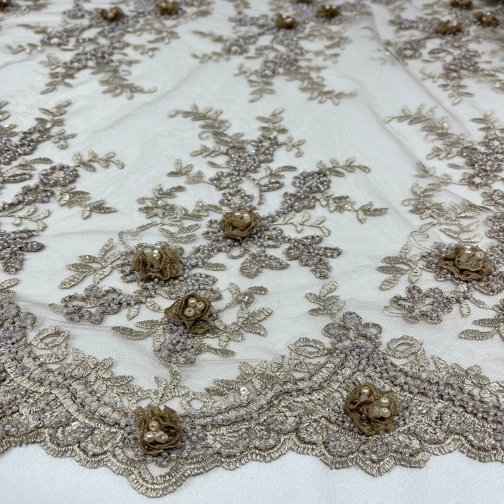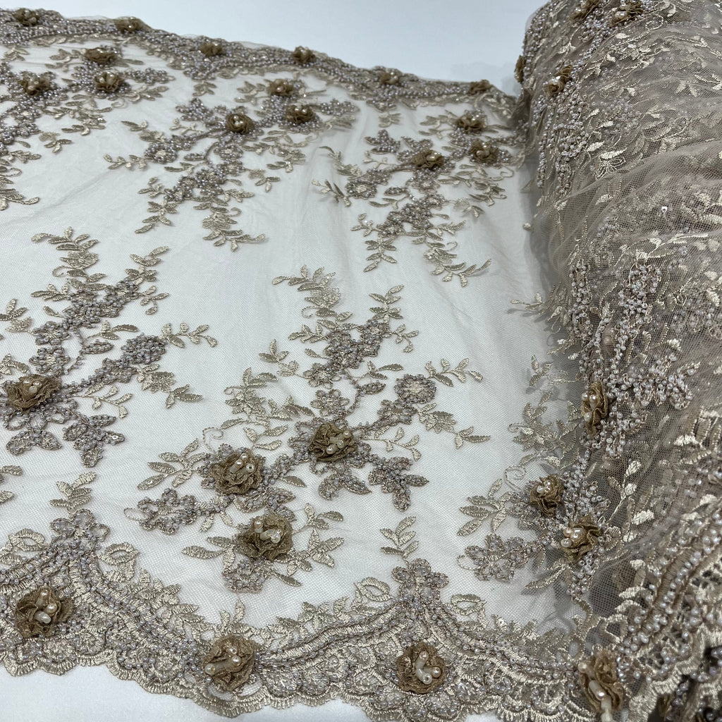 Handmade, high quality Beaded Double Sided 3D Floral Lace Trimming Embroidered on 100% Polyester Net Mesh. Beautiful on wedding dresses, evening gowns, dance costumes, and more.