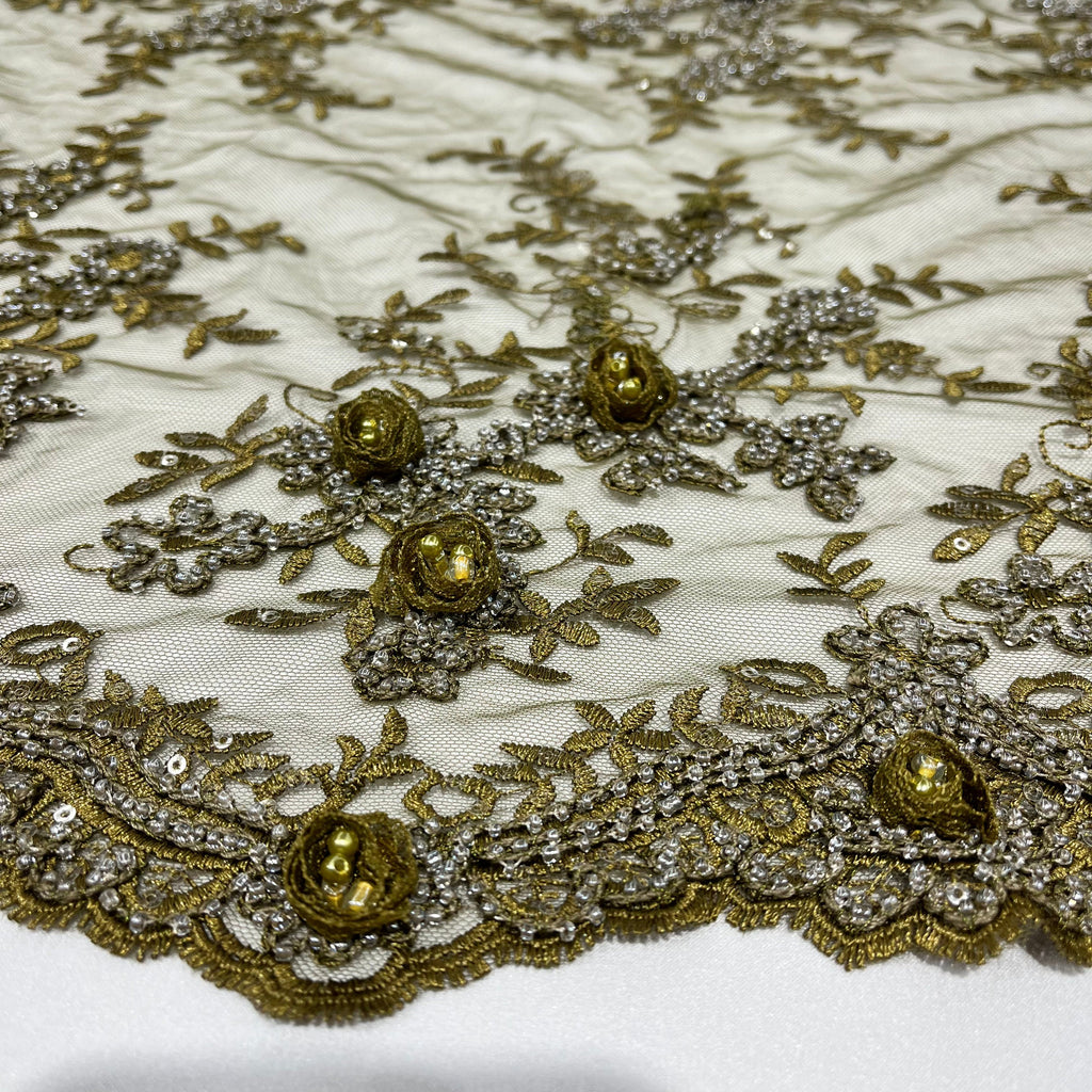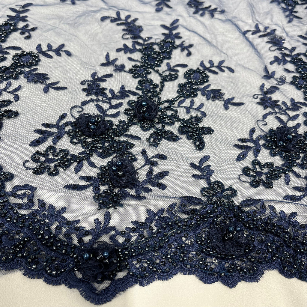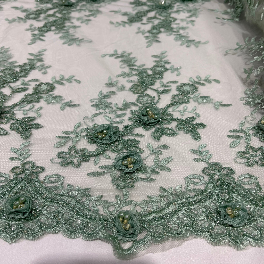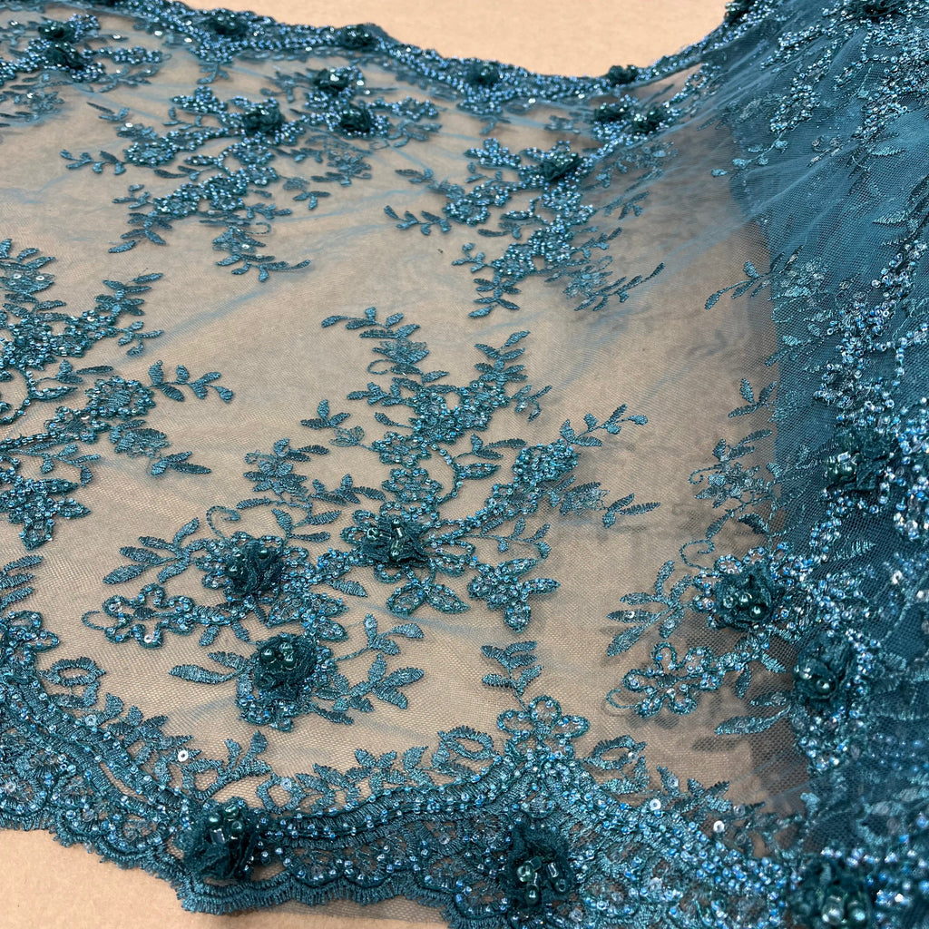 Handmade, high quality Beaded Double Sided 3D Floral Lace Trimming Embroidered on 100% Polyester Net Mesh. Beautiful on wedding dresses, evening gowns, dance costumes, and more.