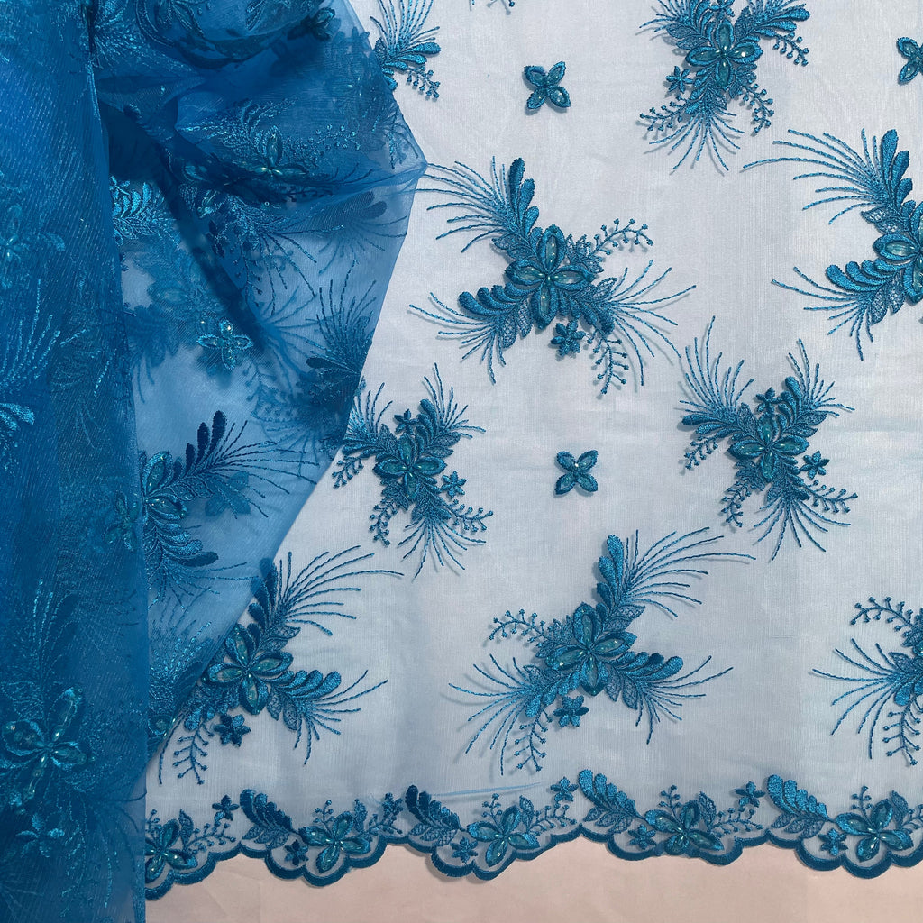 Introducing the luxurious beaded lace fabric embroidered on 100% polyester net mesh from Lace USA. This exquisite fabric is perfect for any special occasion, like weddings, evening gowns, dance costumes, and quinceañeras. The intricate beading, floral patterns, and detailed sequin work add an impressive level of beauty and glam to any dress. The fabric is available in three colors and its size is approximately 52" wide. The fabric doesn't just look luxurious - it is also hand-crafted and of the highest quality. Add a touch of royalty to that one-of-a-kind dress and order your beaded lace fabric today. With a minimum order of one yard, you too can make unique and beautiful wedding dresses, bridal fabrics, costumes, and more! Make your dream come true with Lace USA.