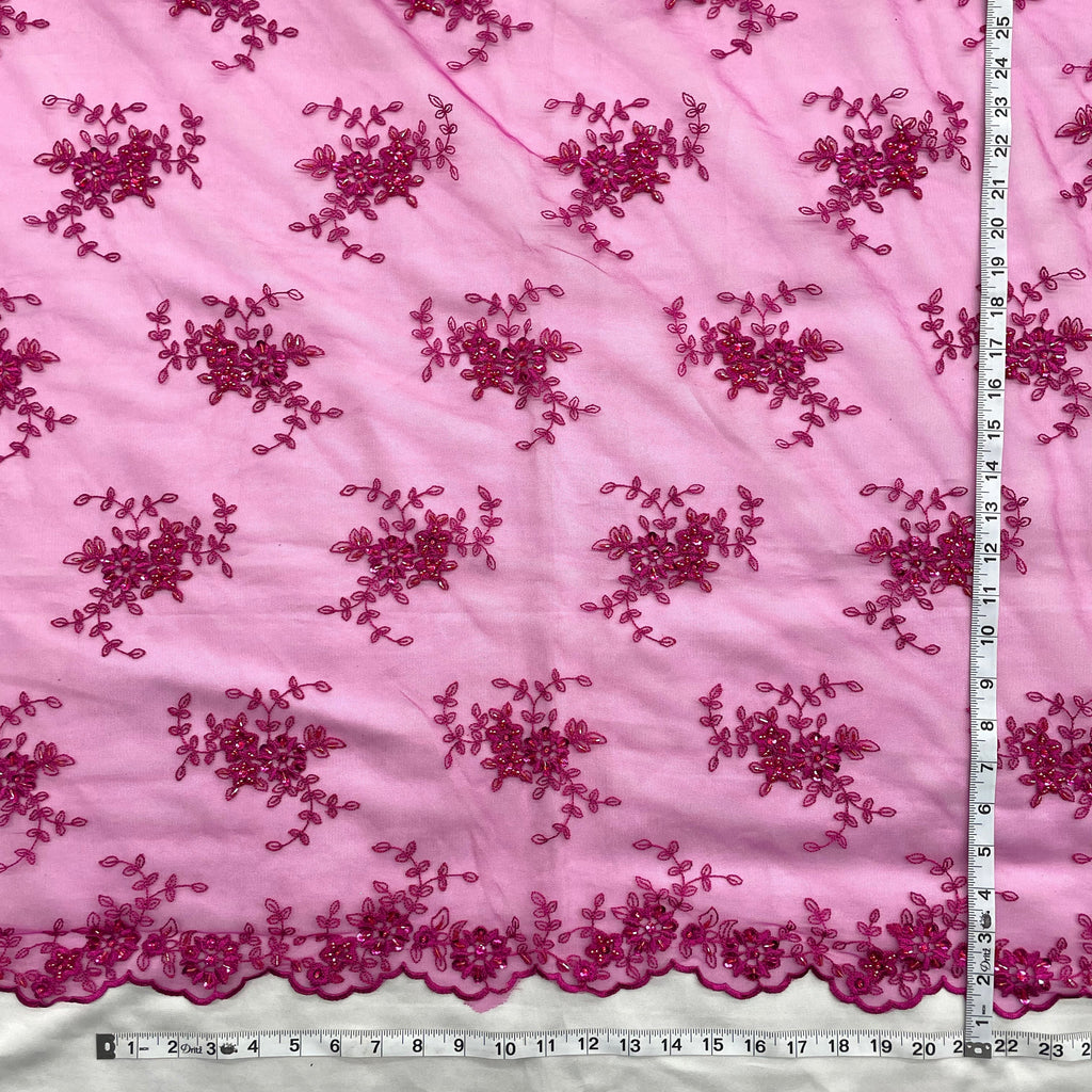 This stunning and unique Beaded Lace Fabric Embroidered on 100% Polyester Net Mesh from Lace USA is the perfect addition to your wedding dress, evening gown, dance costume, or other special occasion outfit. Featuring beautiful beading and pearls, this fuchsia fabric is a sight to behold. The intricate embroidery of this fabric stands out for a grand effect. Whether you’re crafting a wedding dress, evening gown, dance costume, or something special for that quinceanera, this beaded lace fabric provides the perfect amount of luxury and style. Make a statement in your creations with this one of a kind beaded lace fabric embroidered with 100% polyester net mesh. Shop this fabric today and add an exclusive touch of elegance to your project! Size: Approximately 51" wide.