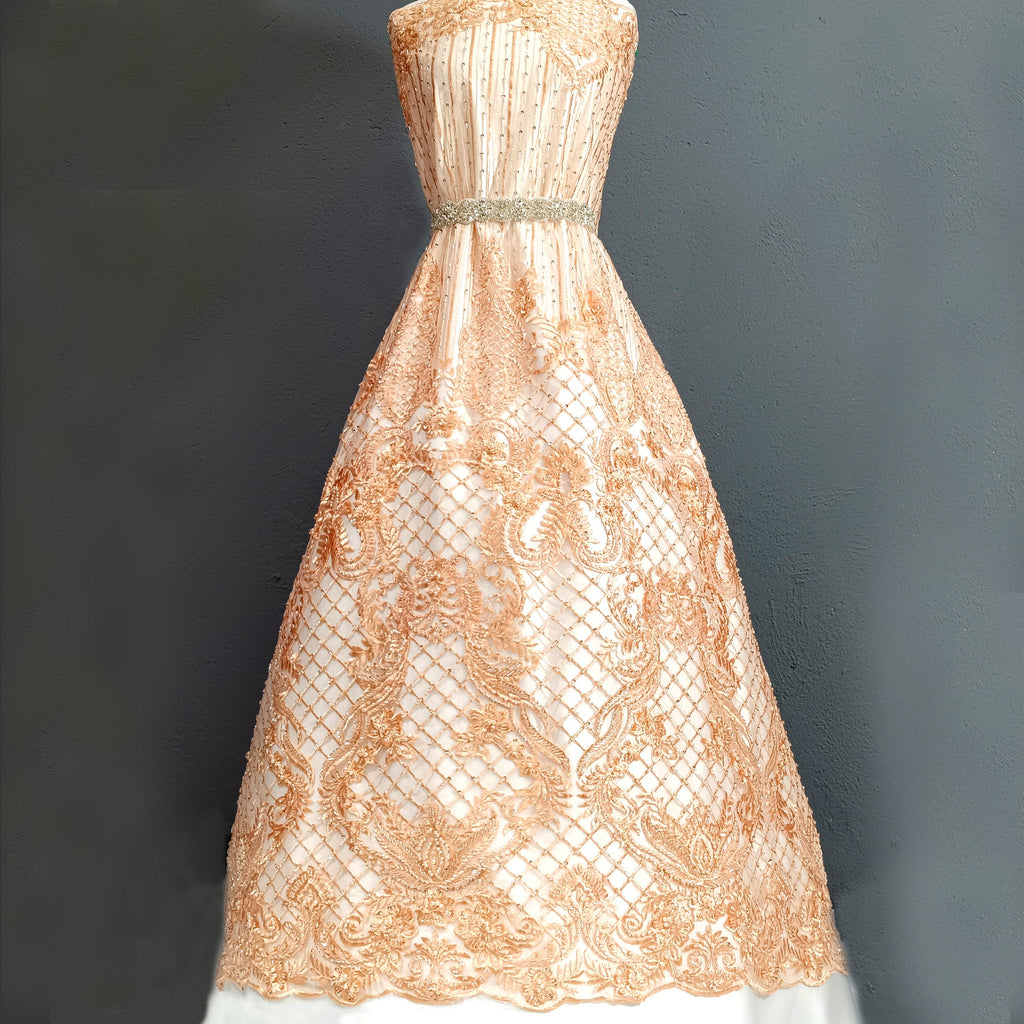 Introducing Lace USA's beautiful Beaded Lace Fabric Embroidered on 100% Polyester Net Mesh! This exquisite lace fabric is perfect for bridal and evening gowns, dance and Quinceanera dresses, and creative special occasion wear. Dressmakers will delight in its luxurious look, and the fine beading, embroidery and pearl details. Crafted from the finest 100% Polyester Net Mesh, our high-end lace fabric is perfect for haute couture and formal dressmaking, offering the ultimate in elegance, beauty and luxury. Whether you are crafting a delicate wedding dress, a formal evening gown, or any other special occasion piece, Lace USA's Beaded Lace Fabric Embroidered on 100% Polyester Net Mesh is the perfect choice to provide glamour and distinction. Available in 5 beautiful colors and with a minimum order of 1 yard, you can create something truly luxurious. With Lace USA, fashion couture is in the very fabric of your beautiful dresses. Approximately 52" wide / Ships within 24 business hours