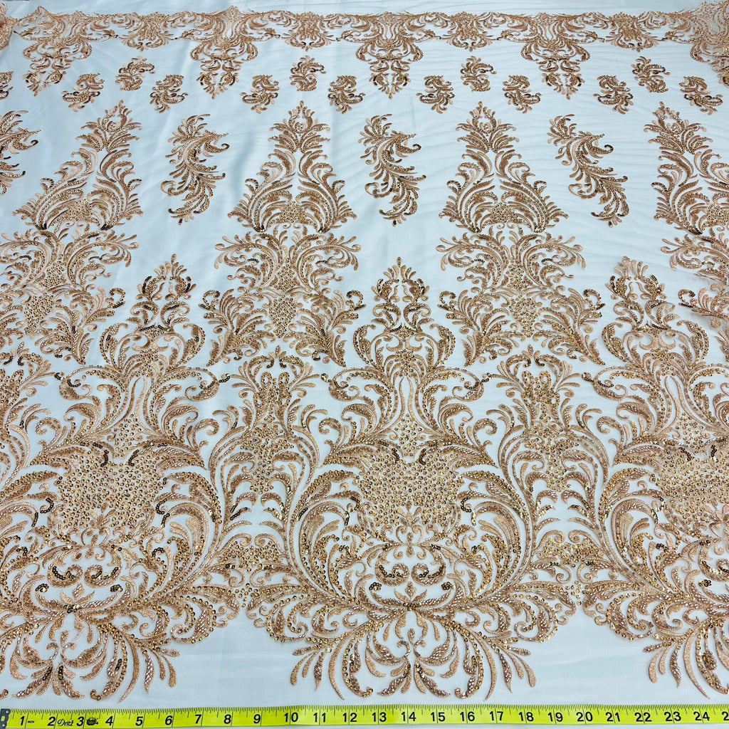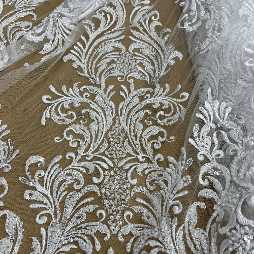 This exquisite Beaded Lace Fabric Embroidered on 100% Polyester Net Mesh from Lace USA is the perfect Couture Fabric for any special occasion. Whether it's for a wedding dress, an evening gown, dancewear, or something in between, this exquisite fabric will fulfill any shopping needs. This high quality mesh features an embroidered design with delicate beading, sequins, and pearls, giving your project an elegant and luxurious feel. Add this gorgeous fabric to any project for a one-of-a-kind bridal or formal look. Available in 5 different colors, this Beaded Lace Fabric Embroidered Mesh is the perfect fabric to add sophistication and glamour to any ensemble. Shop today and get your special project off to a great start! Minimum Order: 1 Yard / Size: Approximately 60" wide / Ships within 24 business hours.