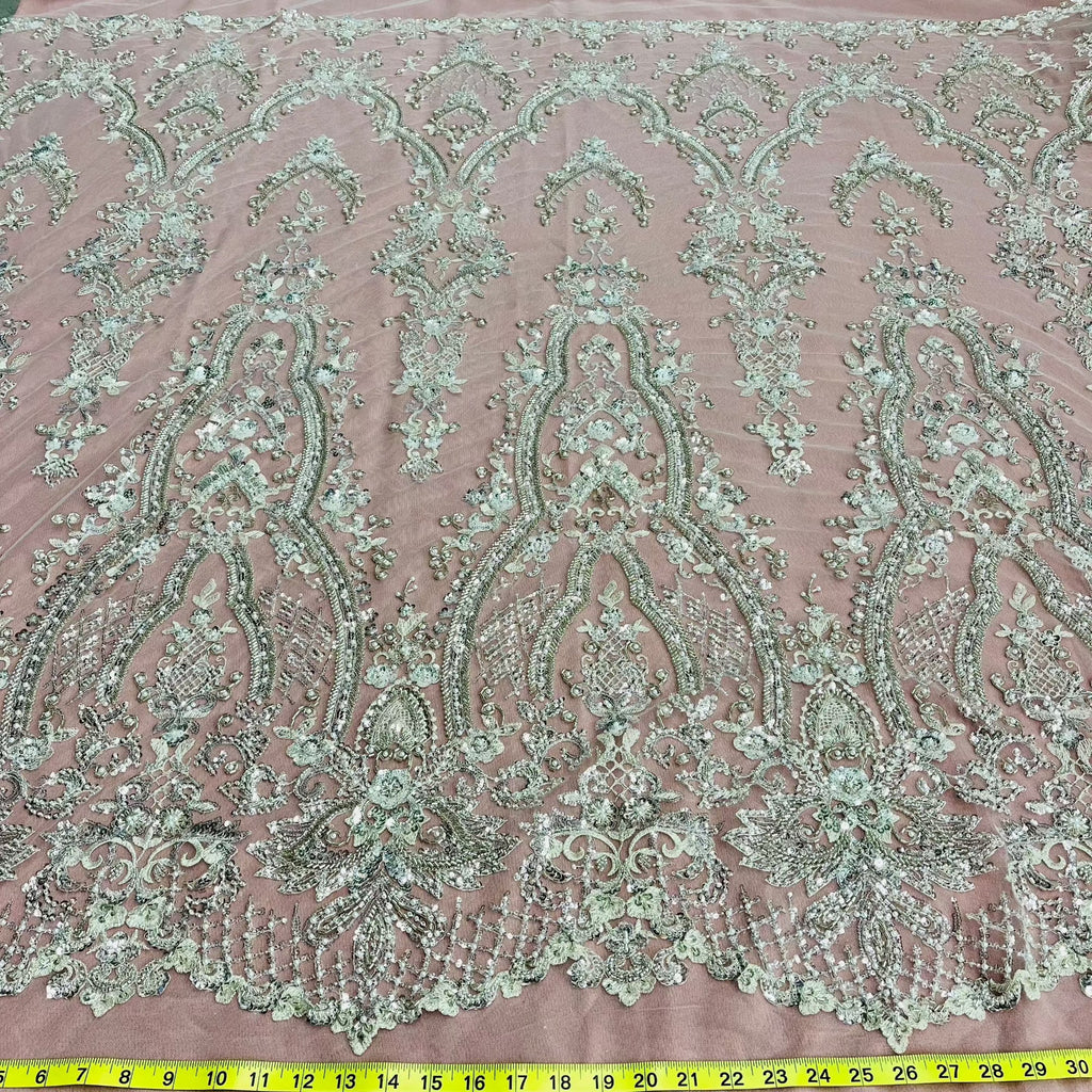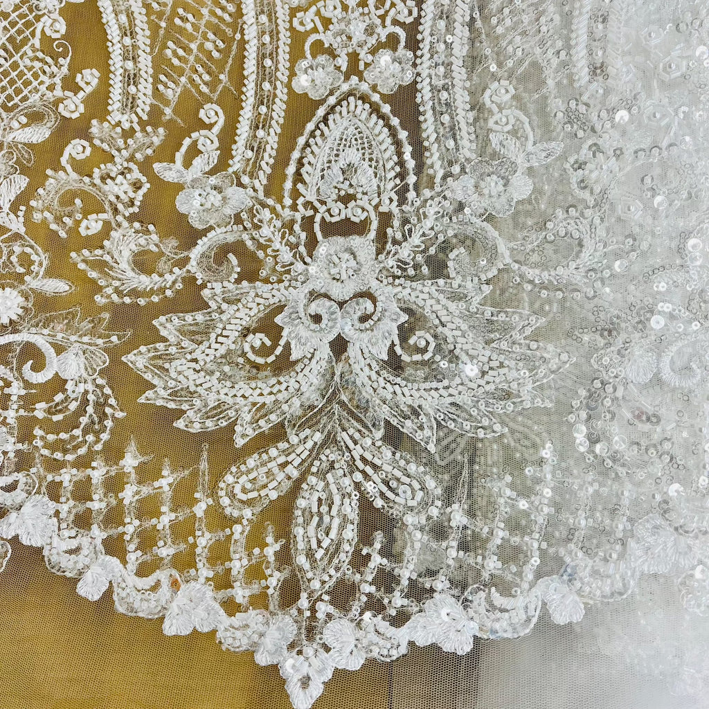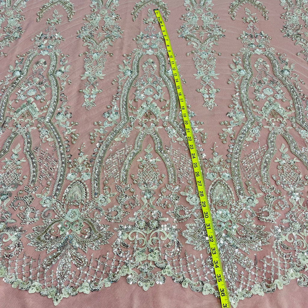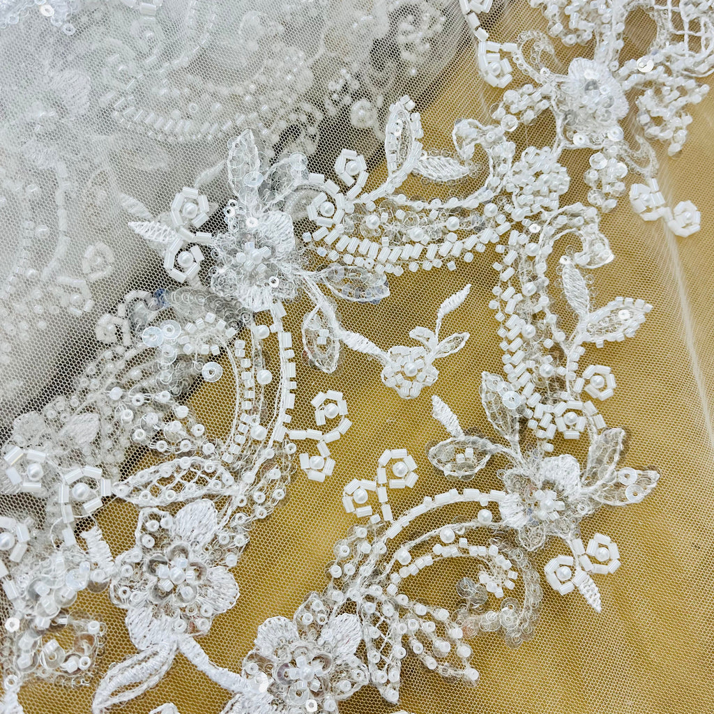 Experience true luxury with Lace USA’s beautiful beaded lace fabric embroidered on 100% polyester net mesh! This exquisite fabric is perfect for a variety of special occasions - from wedding dresses, to evening gowns and dance costumes. With its classic beading, pearls, and colorful sequins, this lace fabric is sure to give any ensemble a couture look and feel. The fabric measures approximately 52" wide and is available in three beautiful colors. Whether you’re shopping for a bridal look, a quinceañera dress, formal dress, or even a dance costume, this high-end lace fabric is perfect for all! Elevate any ensemble with Lace USA’s beautiful beaded lace fabric. With its luxurious feel and decorative elegance, this elegant lace fabric is sure to provide a high-end look and feel. Experience the stunning embellishments of this luxurious lace fabric today!