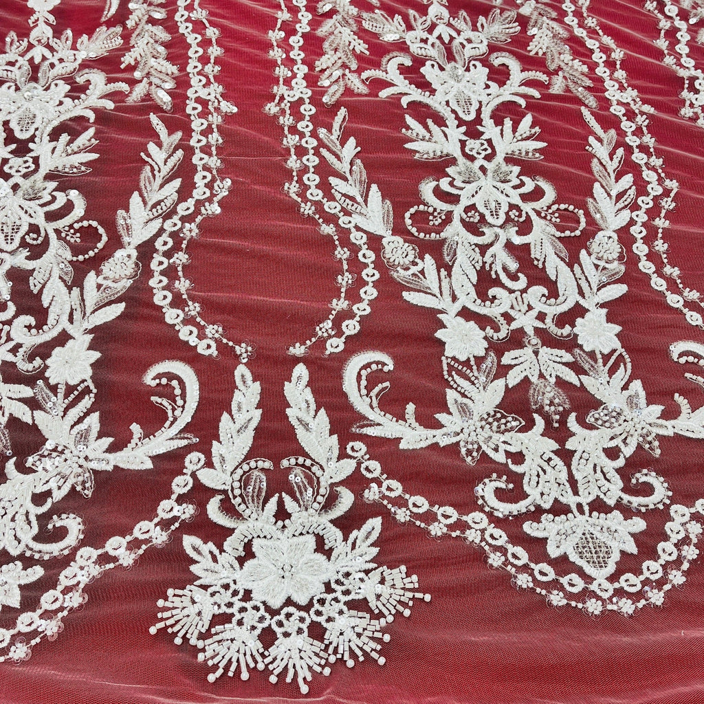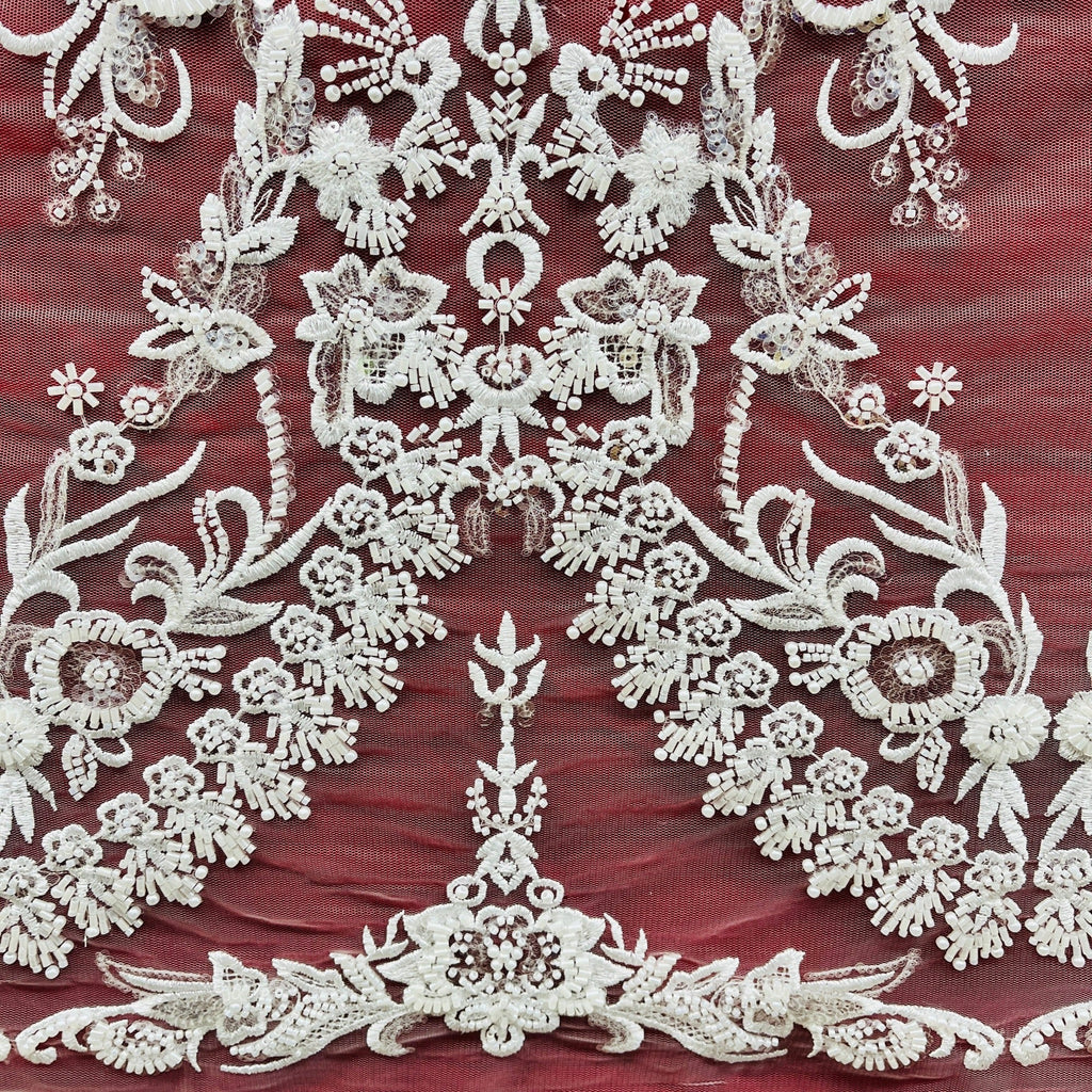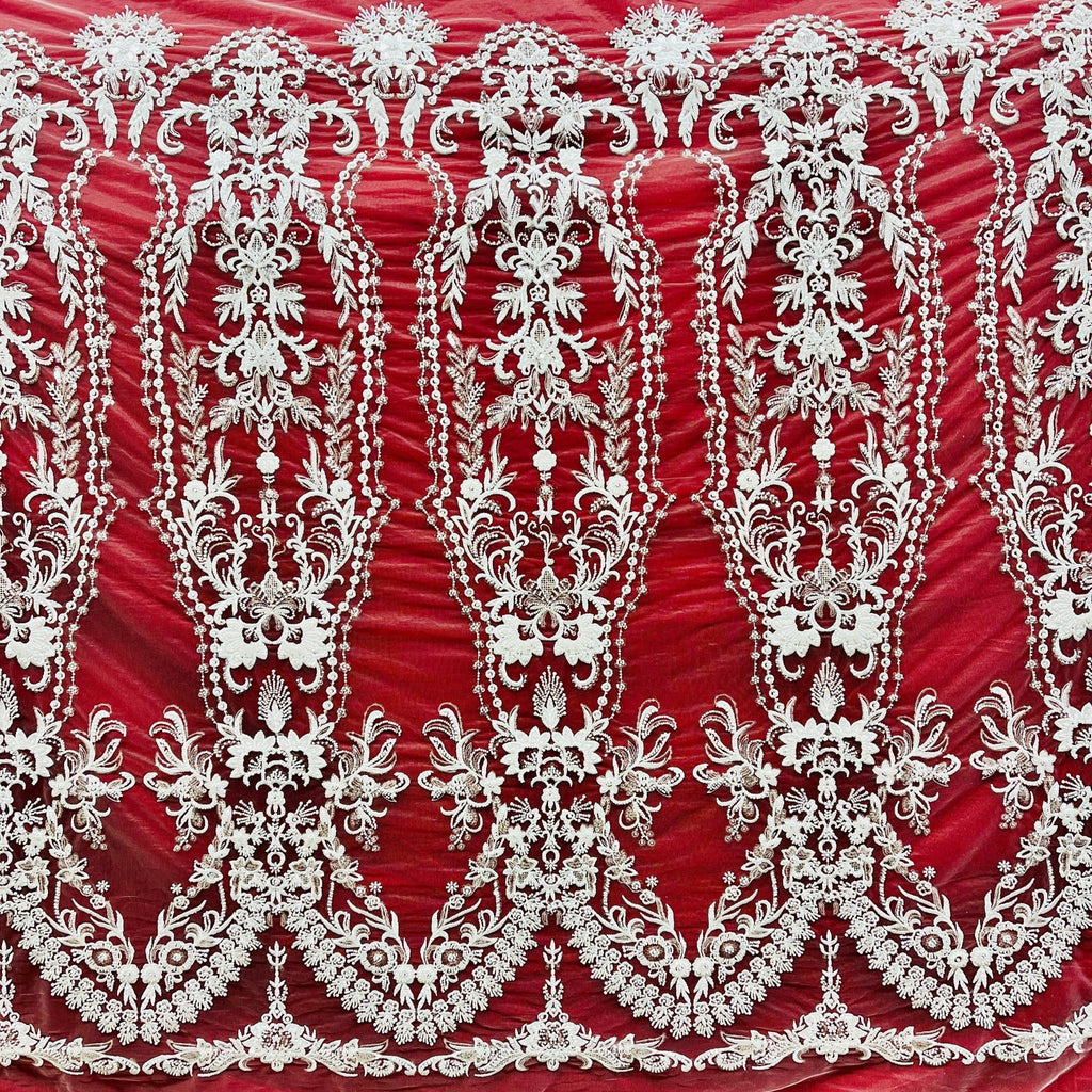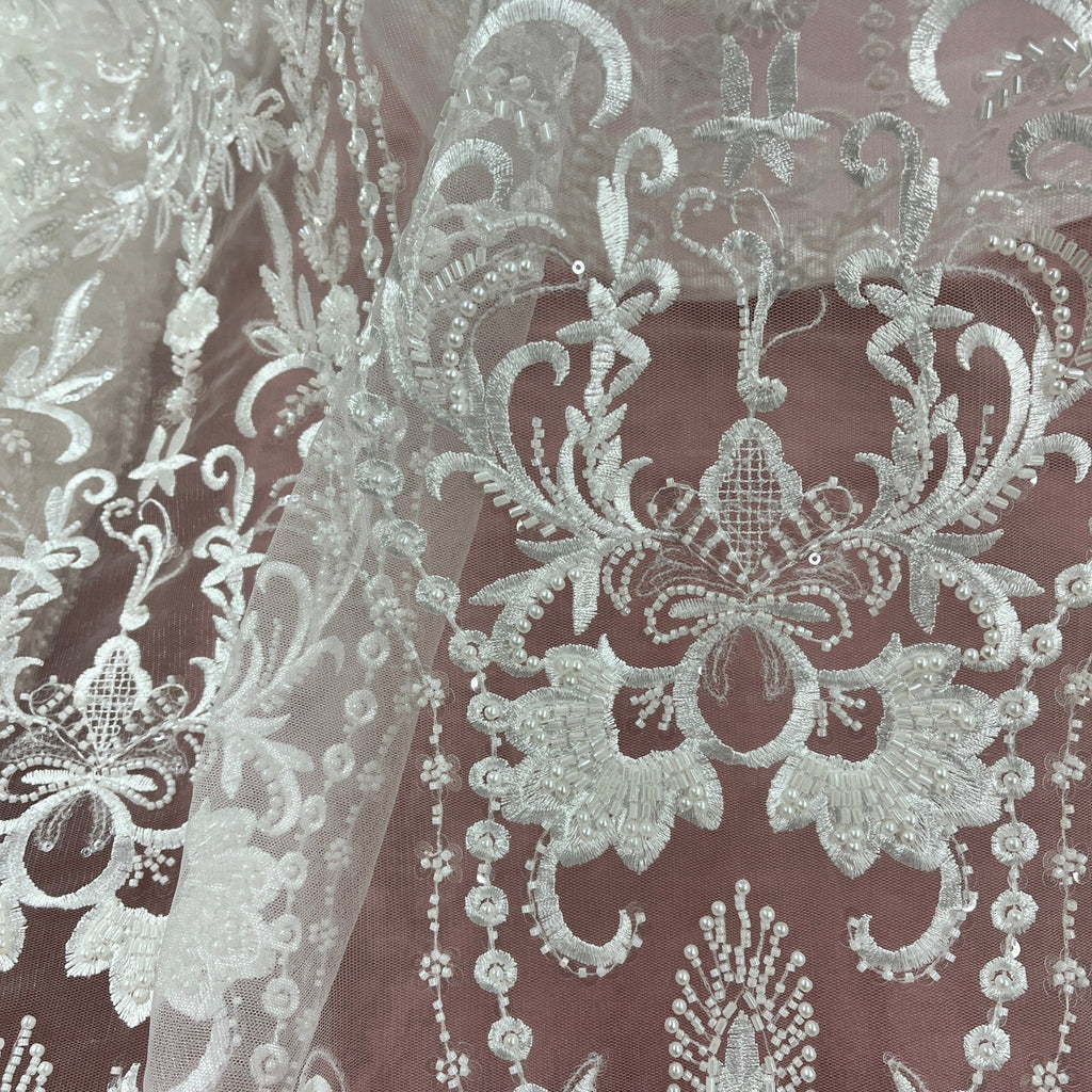 Introducing Lace USA's luxurious Beaded Lace Fabric Embroidered on 100% Polyester Net Mesh! Our beautiful lace fabric is the perfect choice for any special occasion and perfectly accents any couture dress, bridal gown, evening dress, quinceanera dress, dance costume, wedding dress, formal dress, or other decorative occasion. You'll love our beaded, sequined, and pearl-embellished lace fabric and the unique embroidery that elevates this lace to a luxurious high-end. Our lace fabric is made with only the finest grade of 100% polyester net mesh, offering you delicate quality and elegance that will be treasured for years to come! Choose from 3 available colors. Shop now at Lace USA for exquisite lace fabric that will bring an air of elegance and glamour to any style and event! Approximately 50" wide / Ships within 24 business hours.
