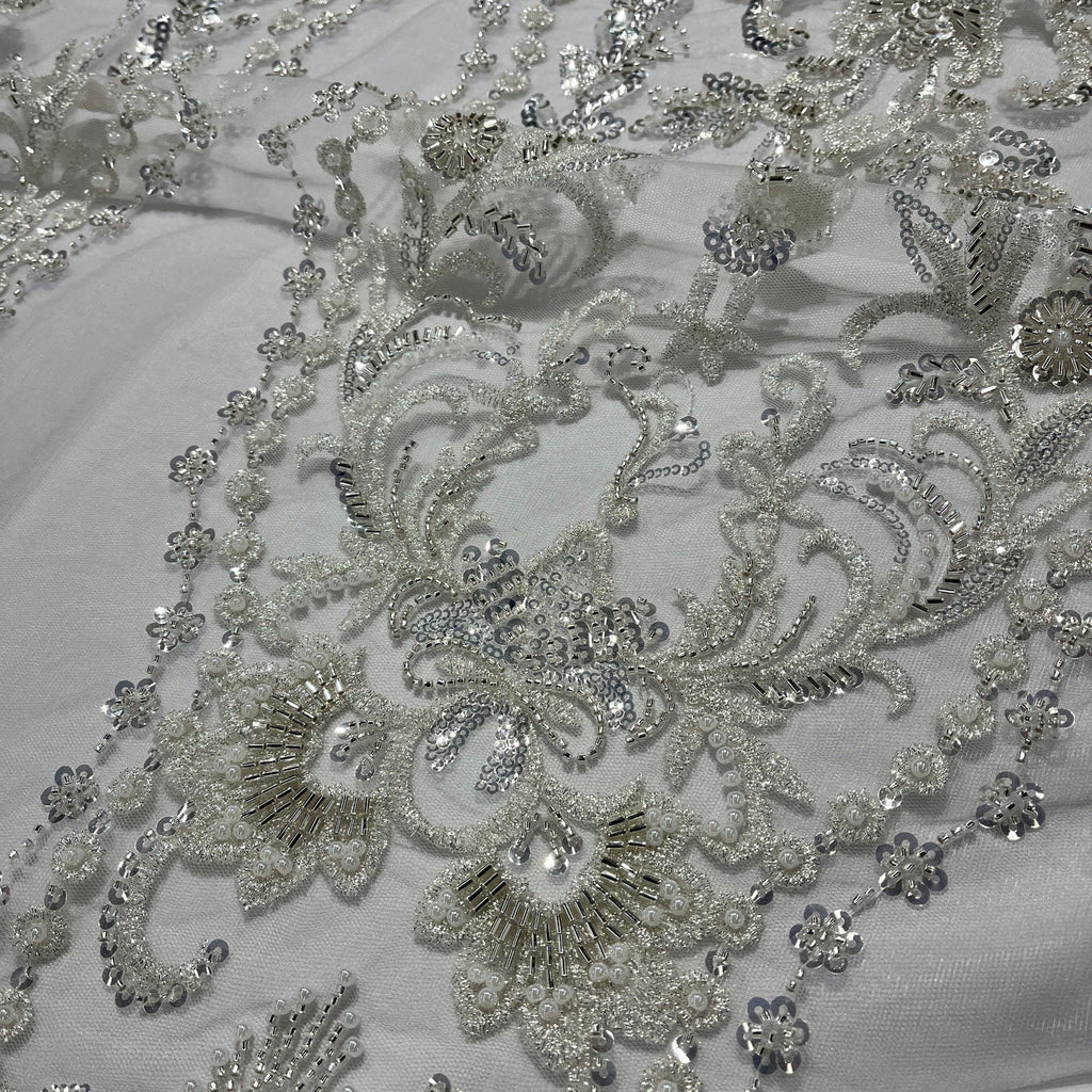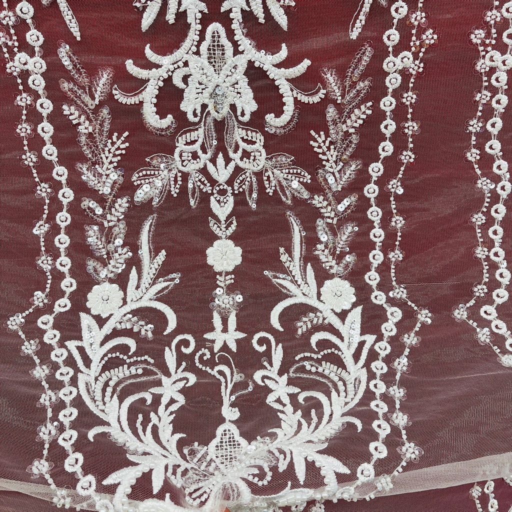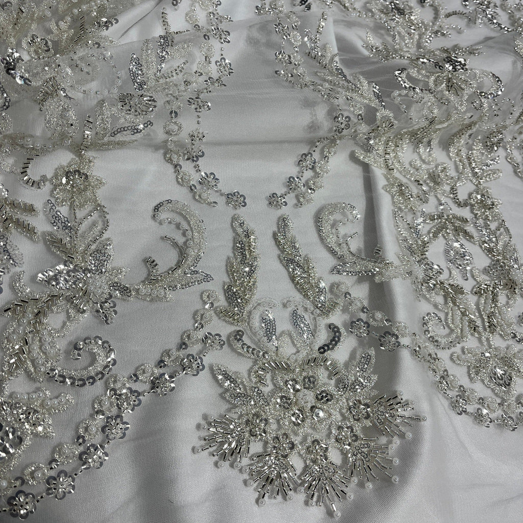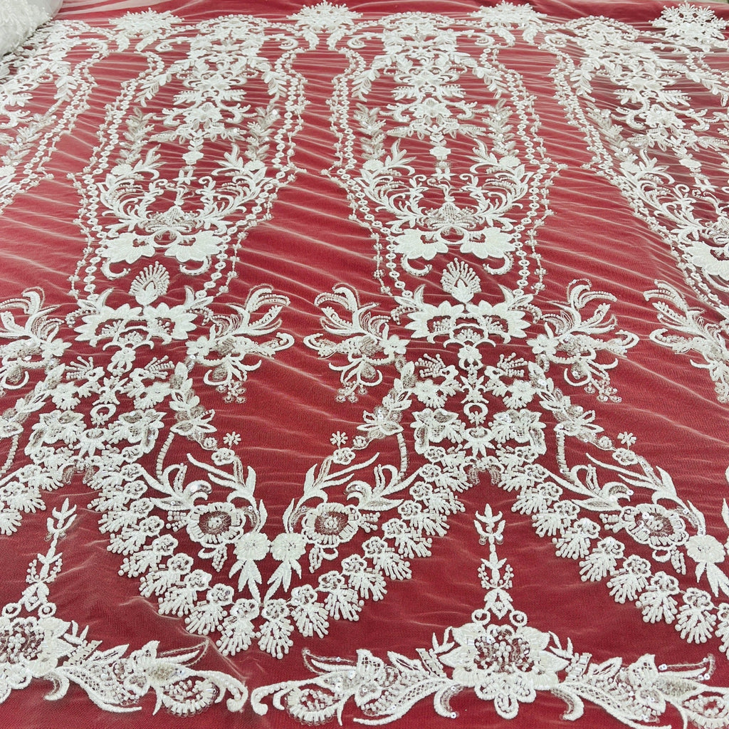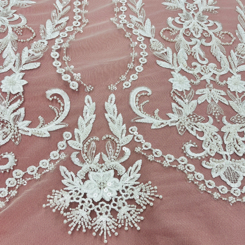 Introducing Lace USA's luxurious Beaded Lace Fabric Embroidered on 100% Polyester Net Mesh! Our beautiful lace fabric is the perfect choice for any special occasion and perfectly accents any couture dress, bridal gown, evening dress, quinceanera dress, dance costume, wedding dress, formal dress, or other decorative occasion. You'll love our beaded, sequined, and pearl-embellished lace fabric and the unique embroidery that elevates this lace to a luxurious high-end. Our lace fabric is made with only the finest grade of 100% polyester net mesh, offering you delicate quality and elegance that will be treasured for years to come! Choose from 3 available colors. Shop now at Lace USA for exquisite lace fabric that will bring an air of elegance and glamour to any style and event! Approximately 50" wide / Ships within 24 business hours.
