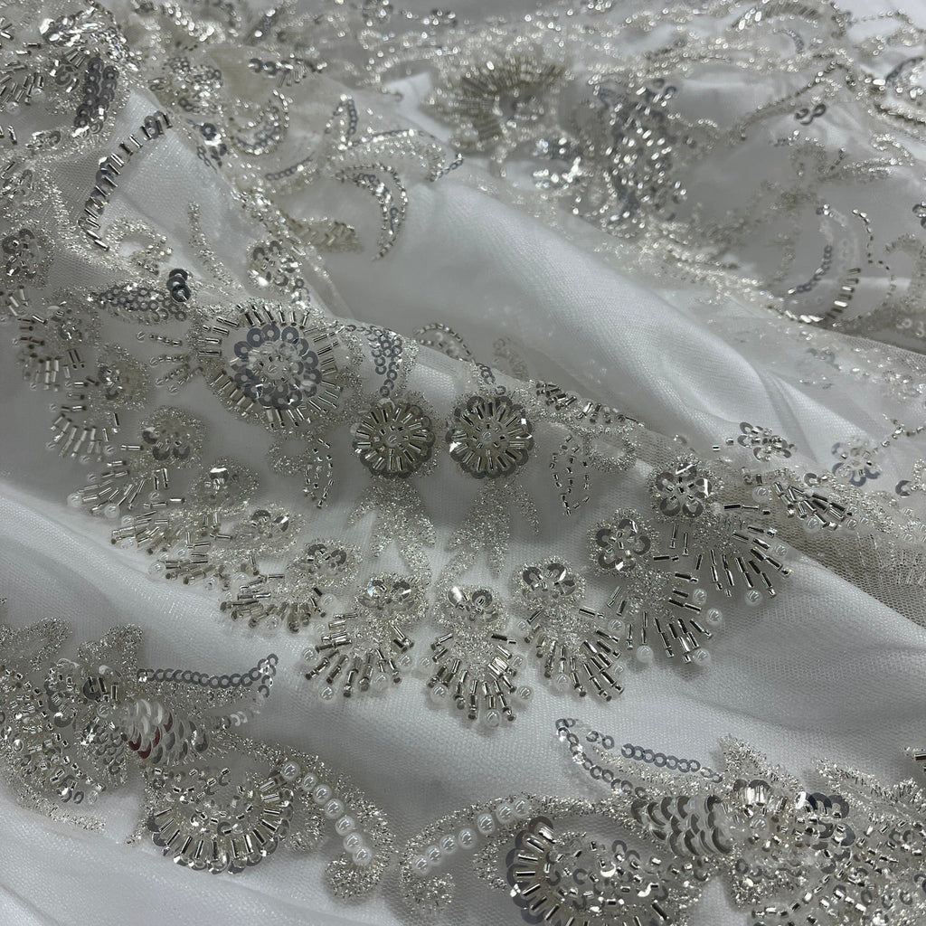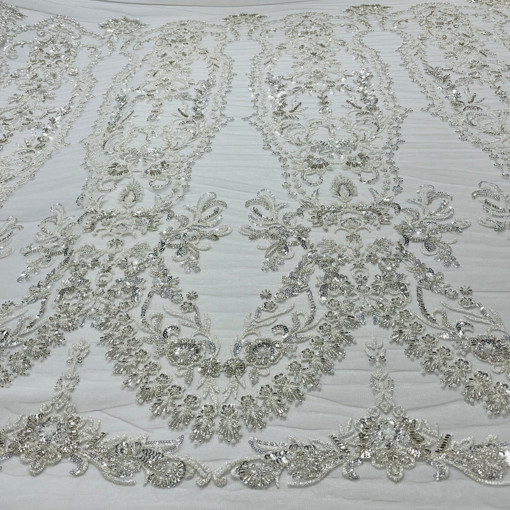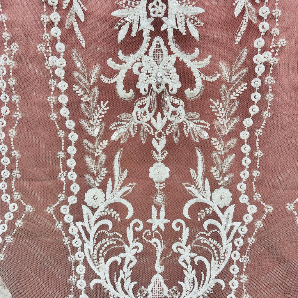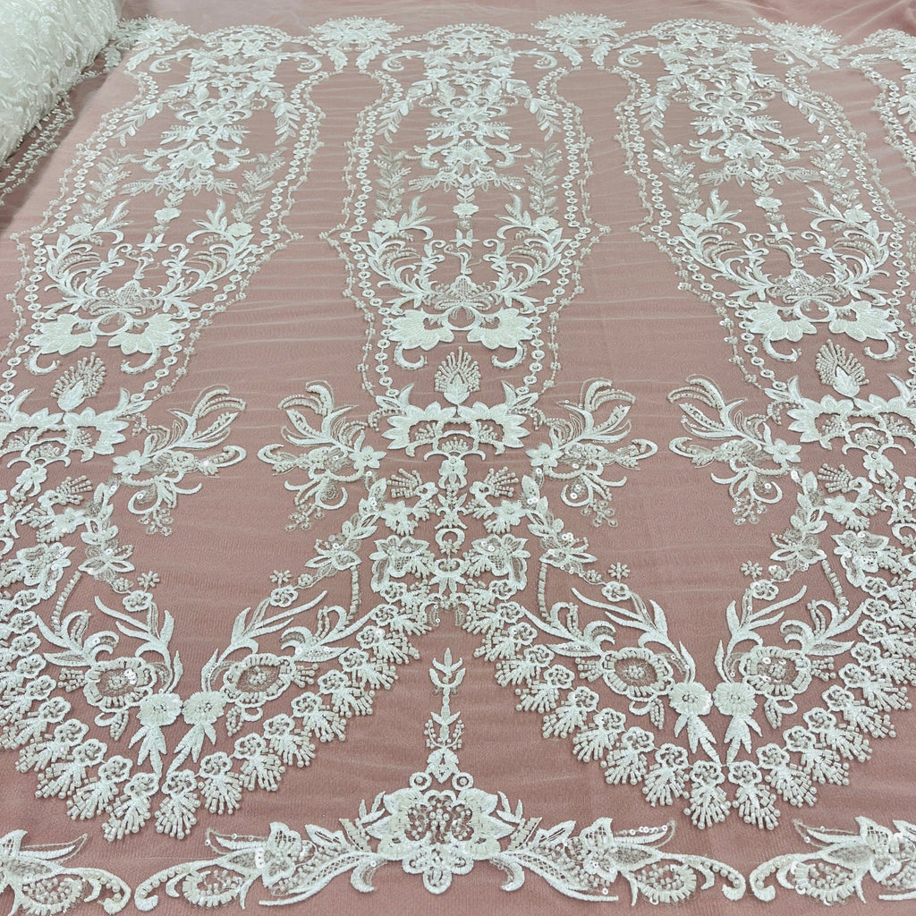 Introducing Lace USA's luxurious Beaded Lace Fabric Embroidered on 100% Polyester Net Mesh! Our beautiful lace fabric is the perfect choice for any special occasion and perfectly accents any couture dress, bridal gown, evening dress, quinceanera dress, dance costume, wedding dress, formal dress, or other decorative occasion. You'll love our beaded, sequined, and pearl-embellished lace fabric and the unique embroidery that elevates this lace to a luxurious high-end. Our lace fabric is made with only the finest grade of 100% polyester net mesh, offering you delicate quality and elegance that will be treasured for years to come! Choose from 3 available colors. Shop now at Lace USA for exquisite lace fabric that will bring an air of elegance and glamour to any style and event! Approximately 50" wide / Ships within 24 business hours.