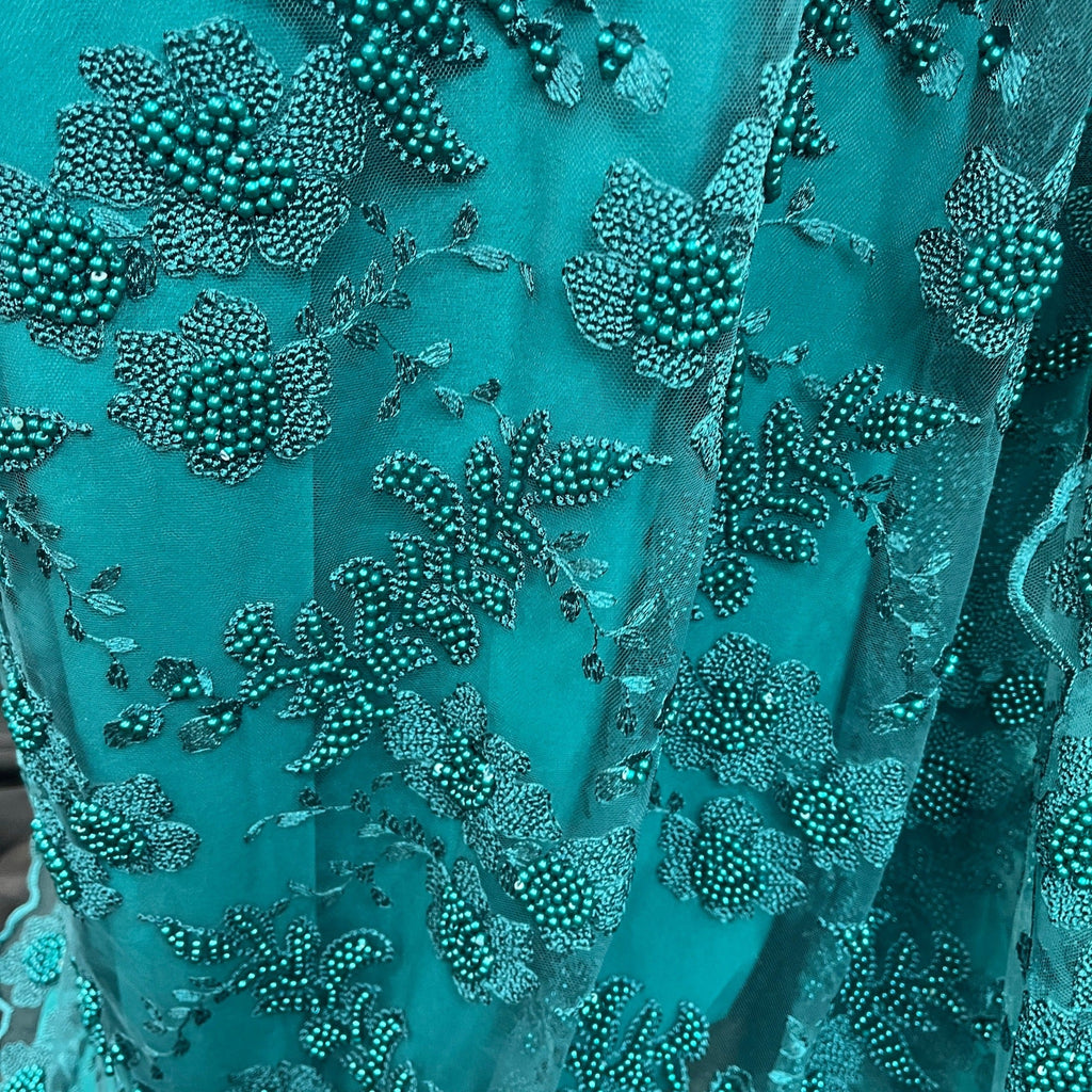 This beautiful fabric, delicately embroidered onto a 100% polyester net mesh, features a floral design embellished with beads and pearls. It's perfect for creating unique and special occasion dresses, evening gowns, quinceañera dresses, and dance costumes.