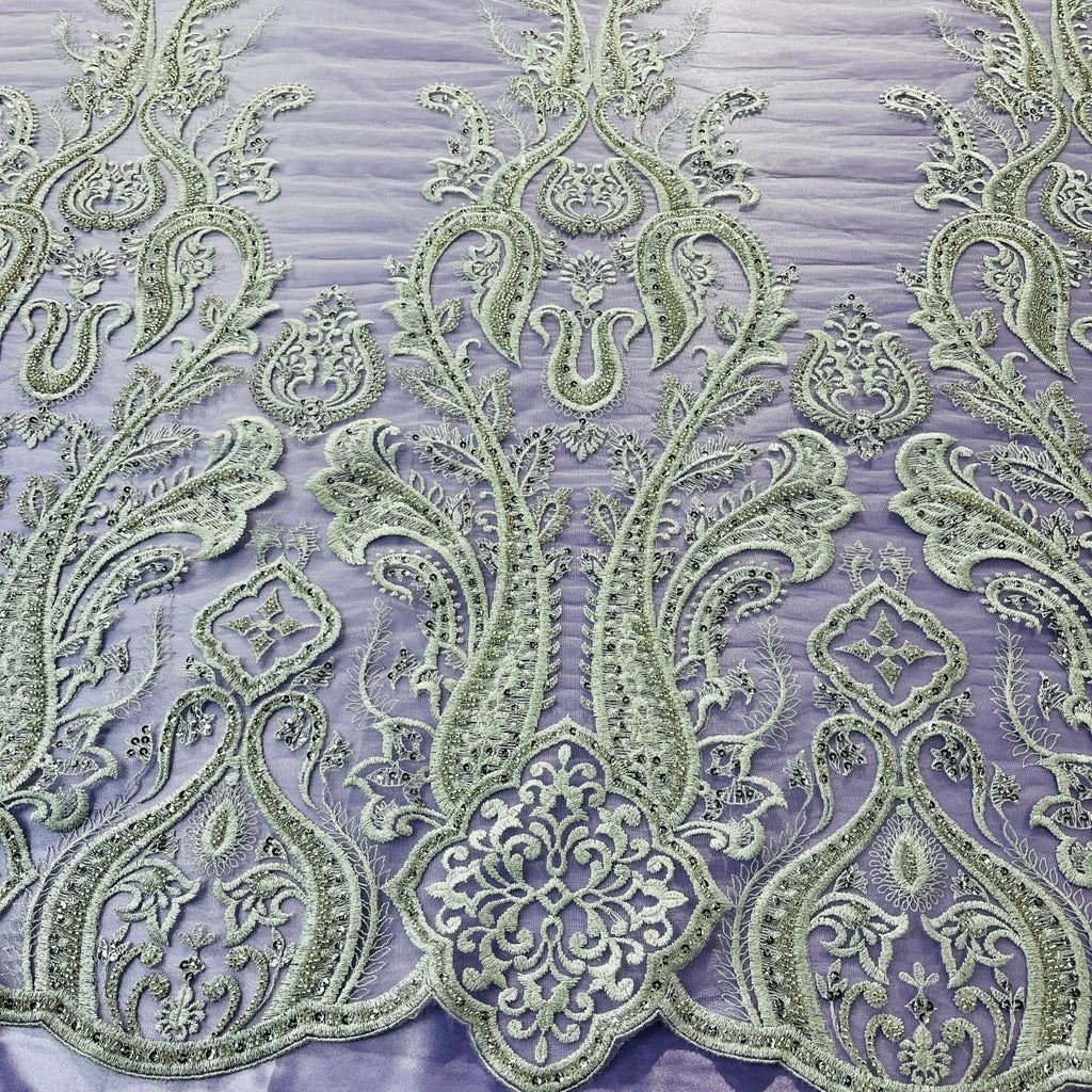 Introducing Lace USA's luxurious Beaded Lace Fabric Embroidered on 100% Polyester Net Mesh! Our beautiful lace fabric is the perfect choice for any special occasion and perfectly accents any couture dress, bridal gown, evening dress, quinceanera dress, dance costume, wedding dress, formal dress, or other decorative occasion. You'll love our beaded, sequined, and pearl-embellished lace fabric and the unique embroidery that elevates this lace to a luxurious high-end. Our lace fabric is made with only the finest grade of 100% polyester net mesh, offering you delicate quality and elegance that will be treasured for years to come! Choose from four available colors. Shop now at Lace USA for exquisite lace fabric that will bring an air of elegance and glamour to any style and event! Approximately 50" wide / Ships within 24 business hours.