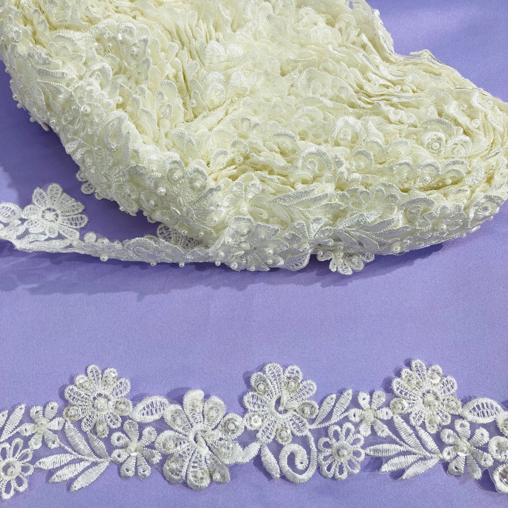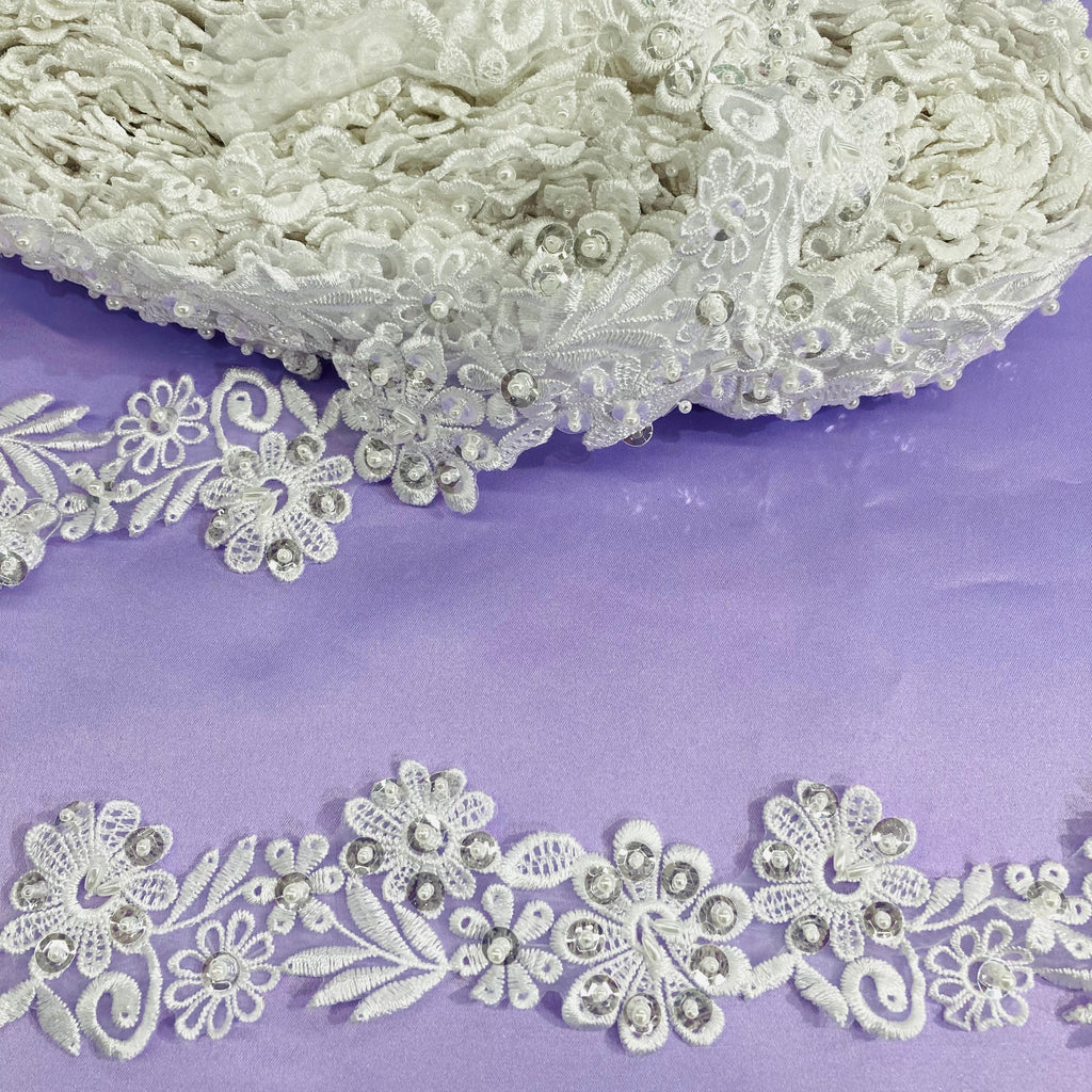 Handmade, high quality Beaded Lace Trimming Embroidered on 100% Polyester Organza. Beautiful on wedding dresses, evening gowns, dance costumes, and more.