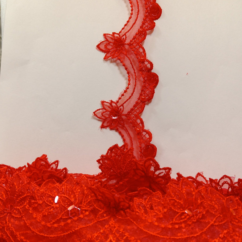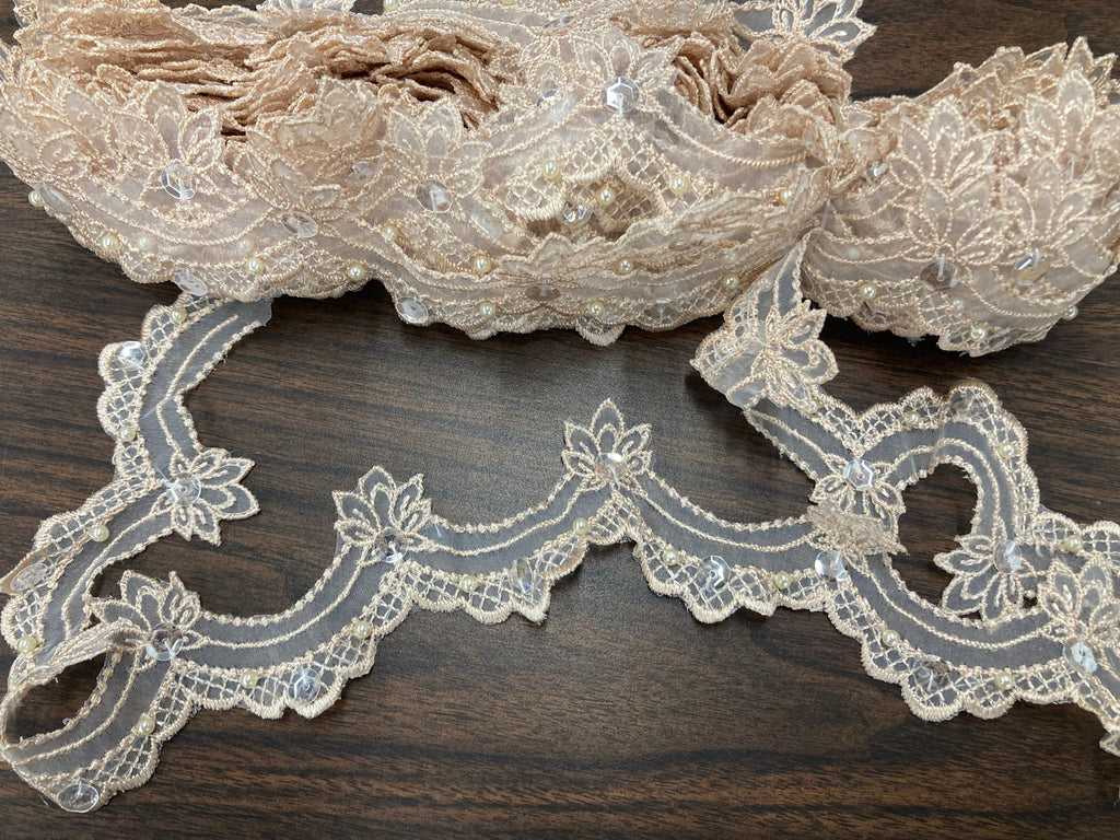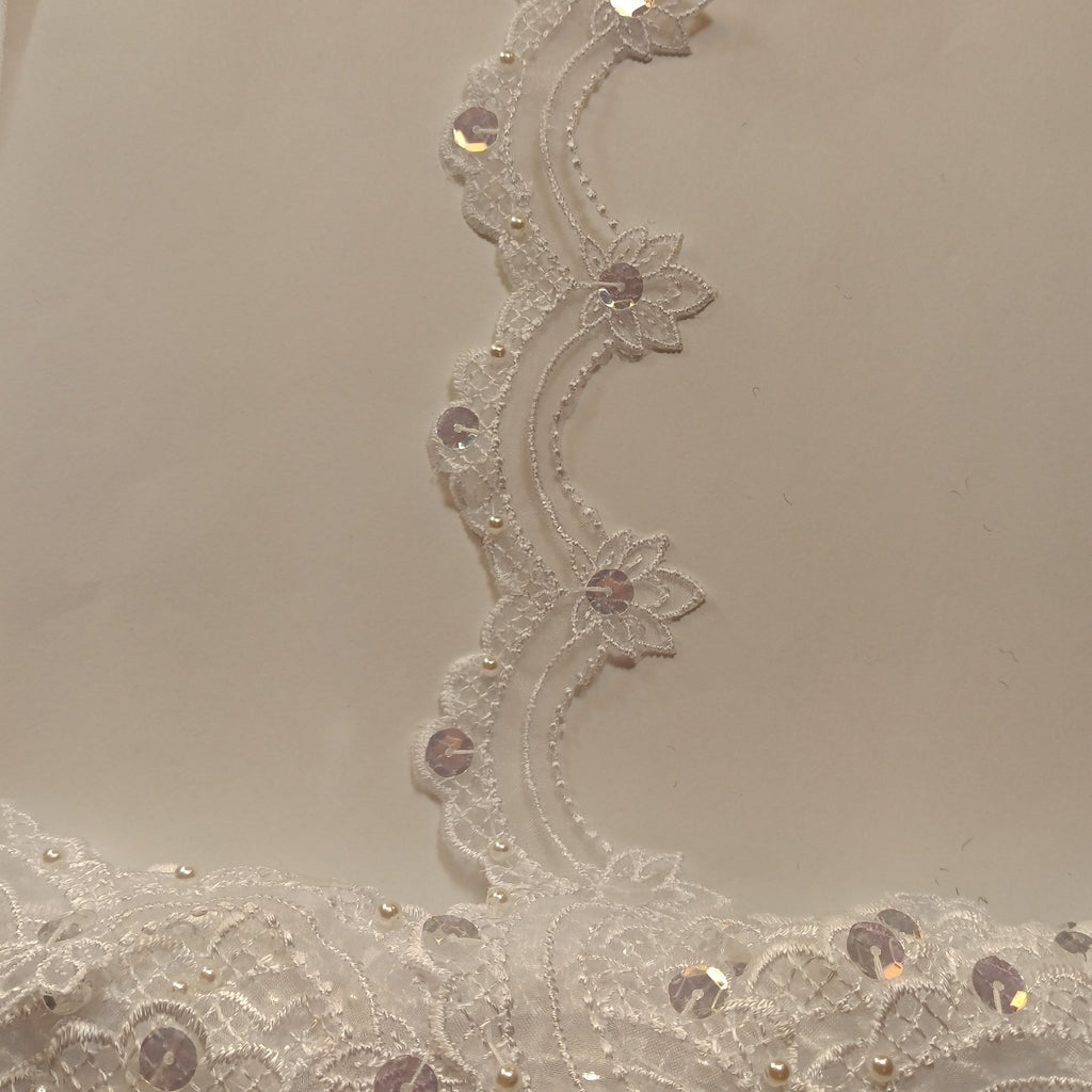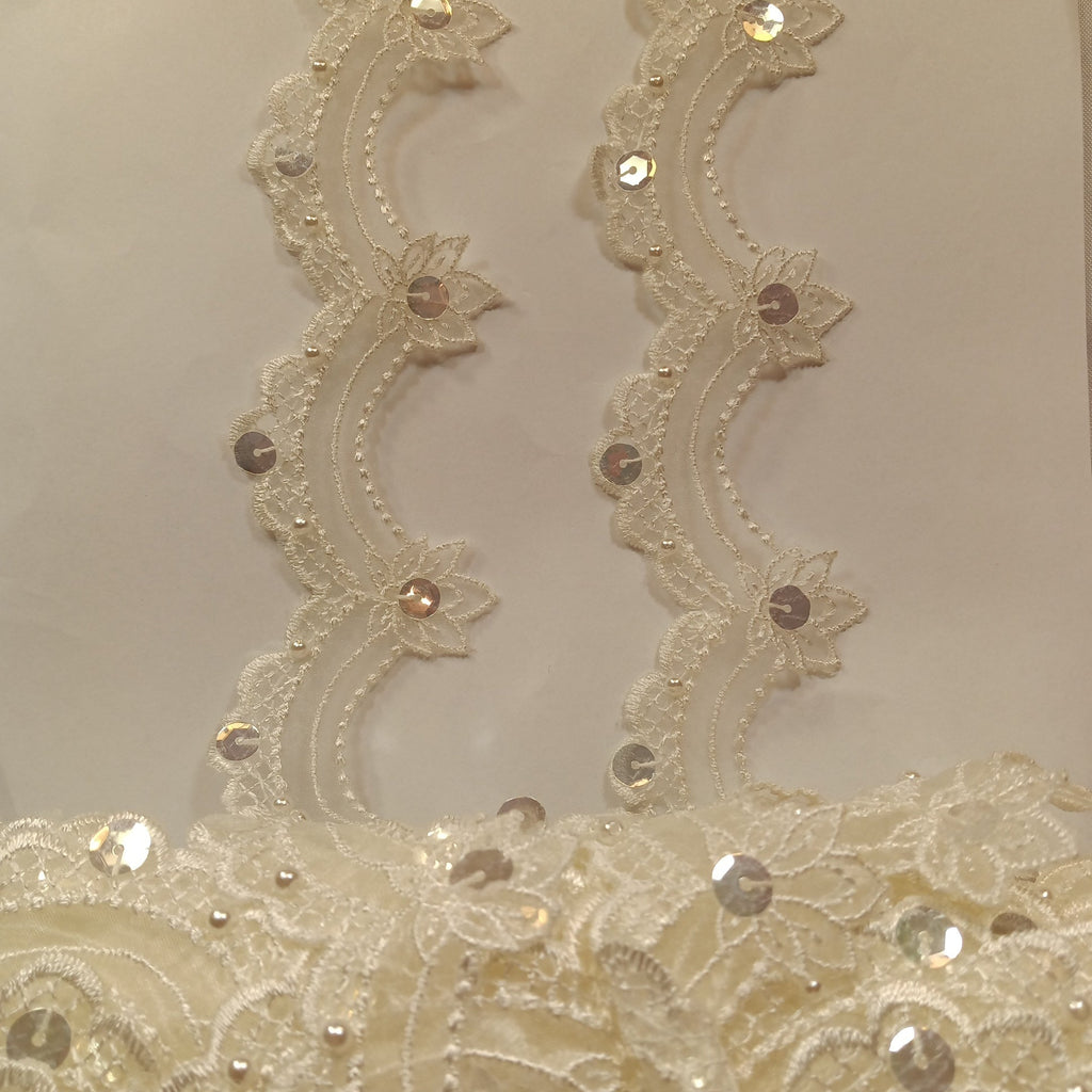 Handmade, high quality Beaded Lace Trimming Embroidered on 100% Polyester Organza. Beautiful on wedding dresses, evening gowns, dance costumes, and more.