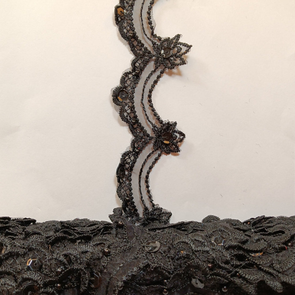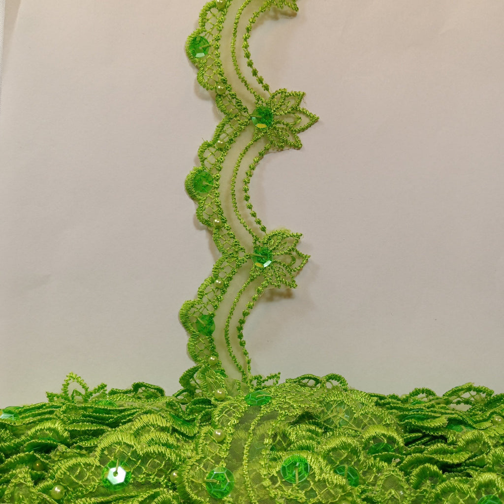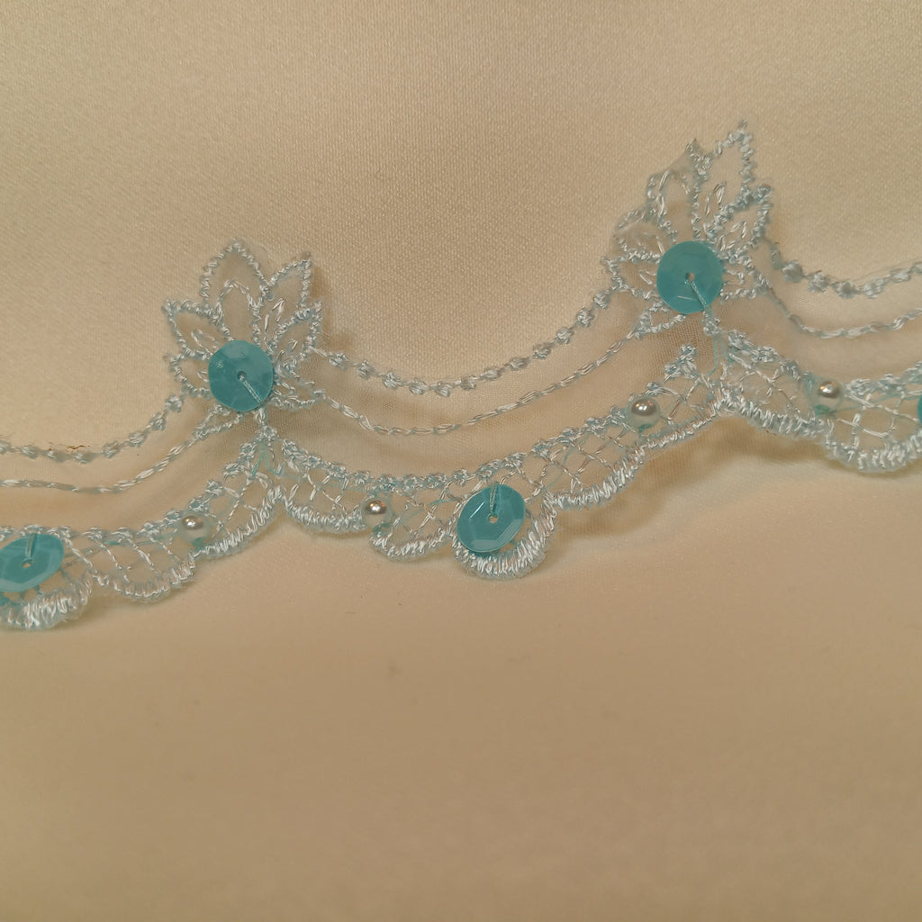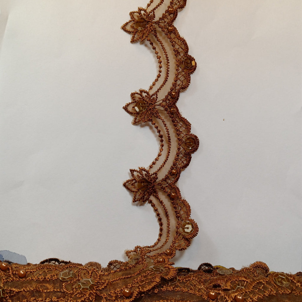 Handmade, high quality Beaded Lace Trimming Embroidered on 100% Polyester Organza. Beautiful on wedding dresses, evening gowns, dance costumes, and more.