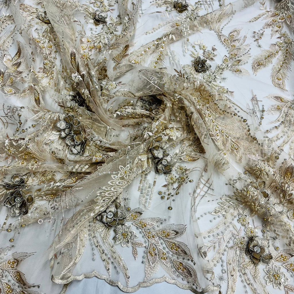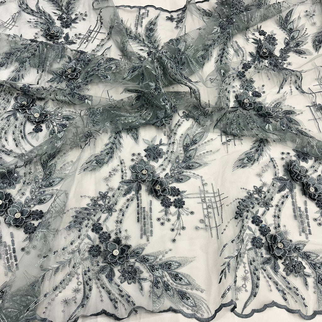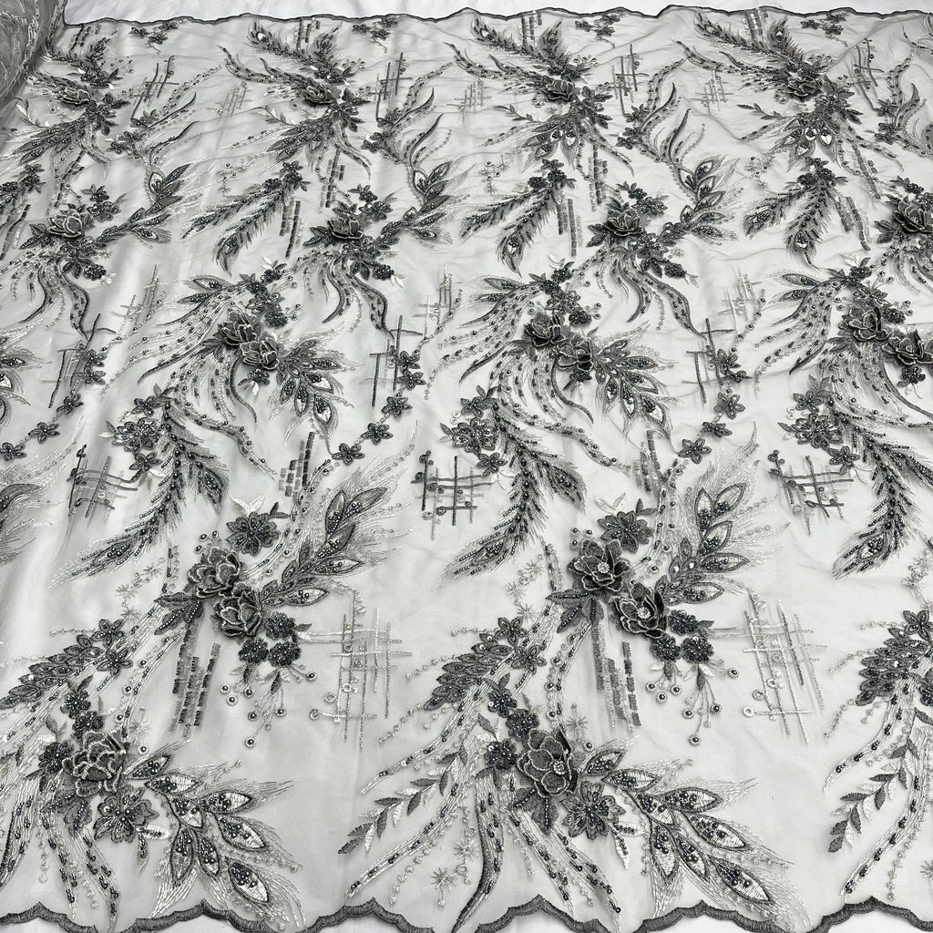 Beaded & Rhinestone 3D Floral Lace Fabric Embroidered on 100% Polyester Net Mesh | Lace USA - GD-2266