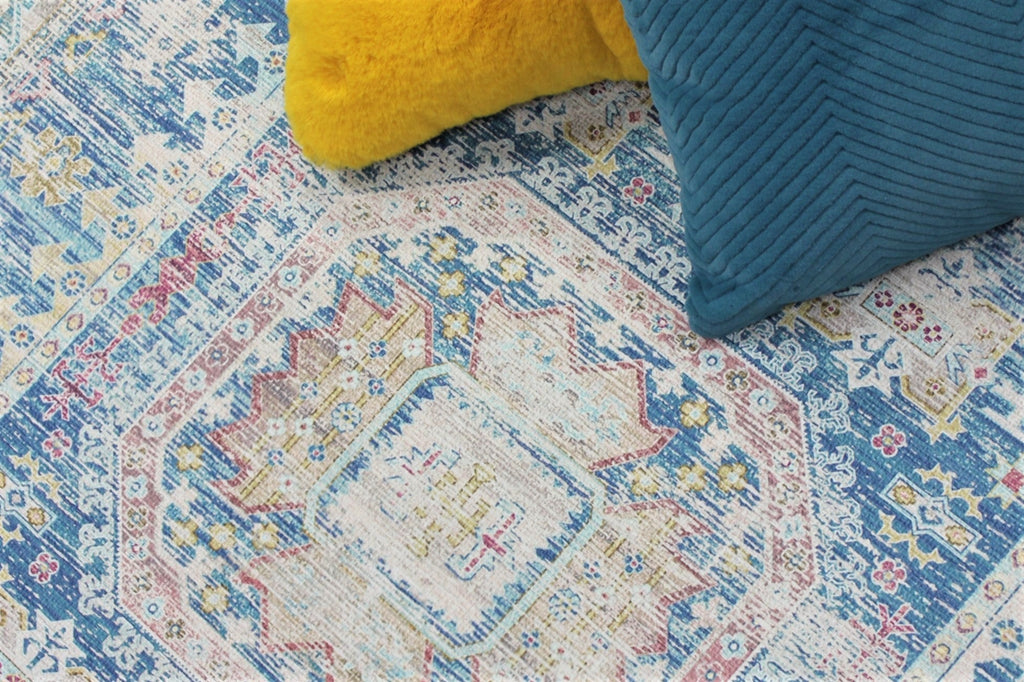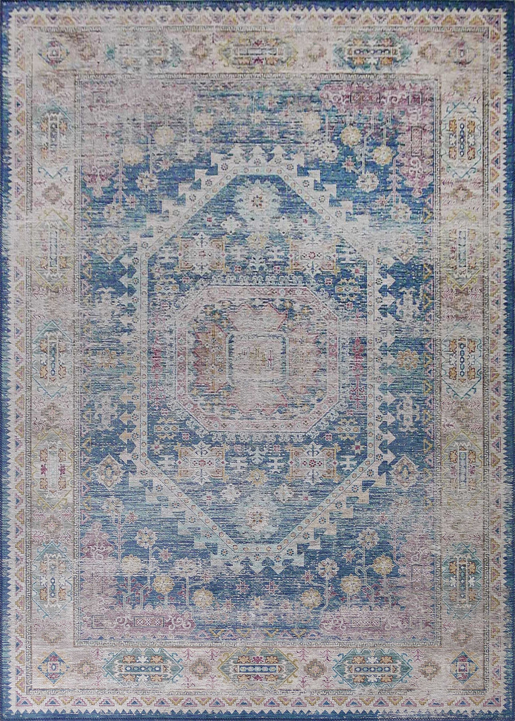Blue Beige Vintage Faded Distressed Print Style Area Rug/ Carpet