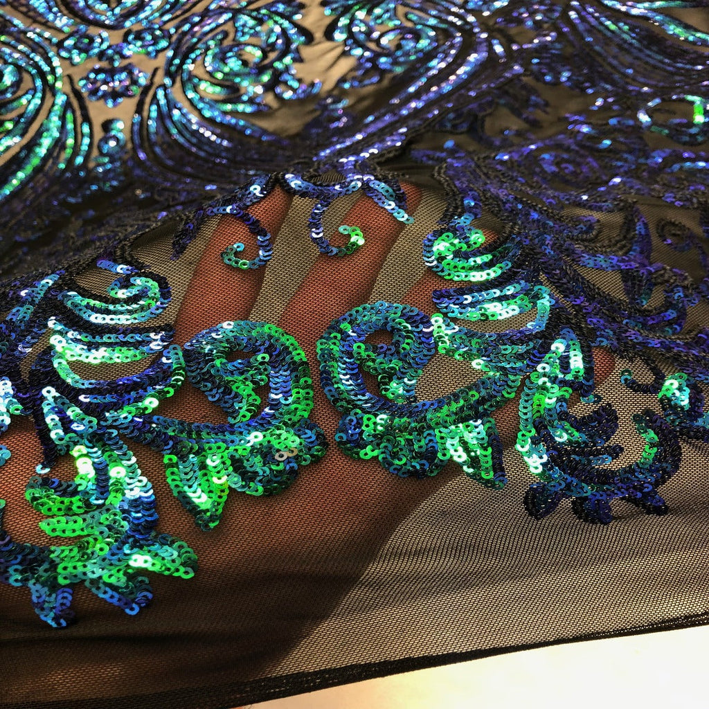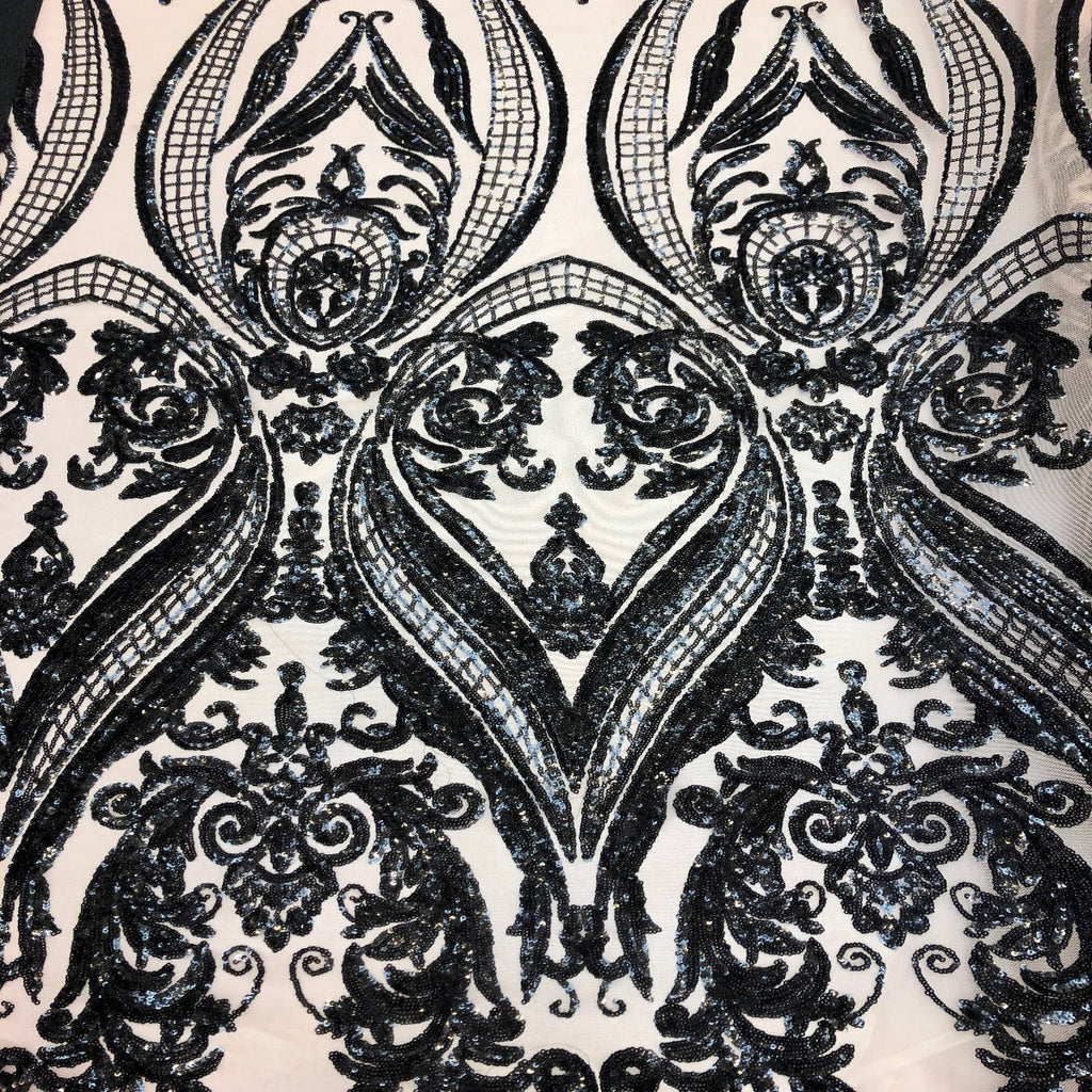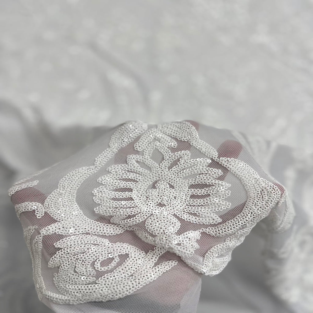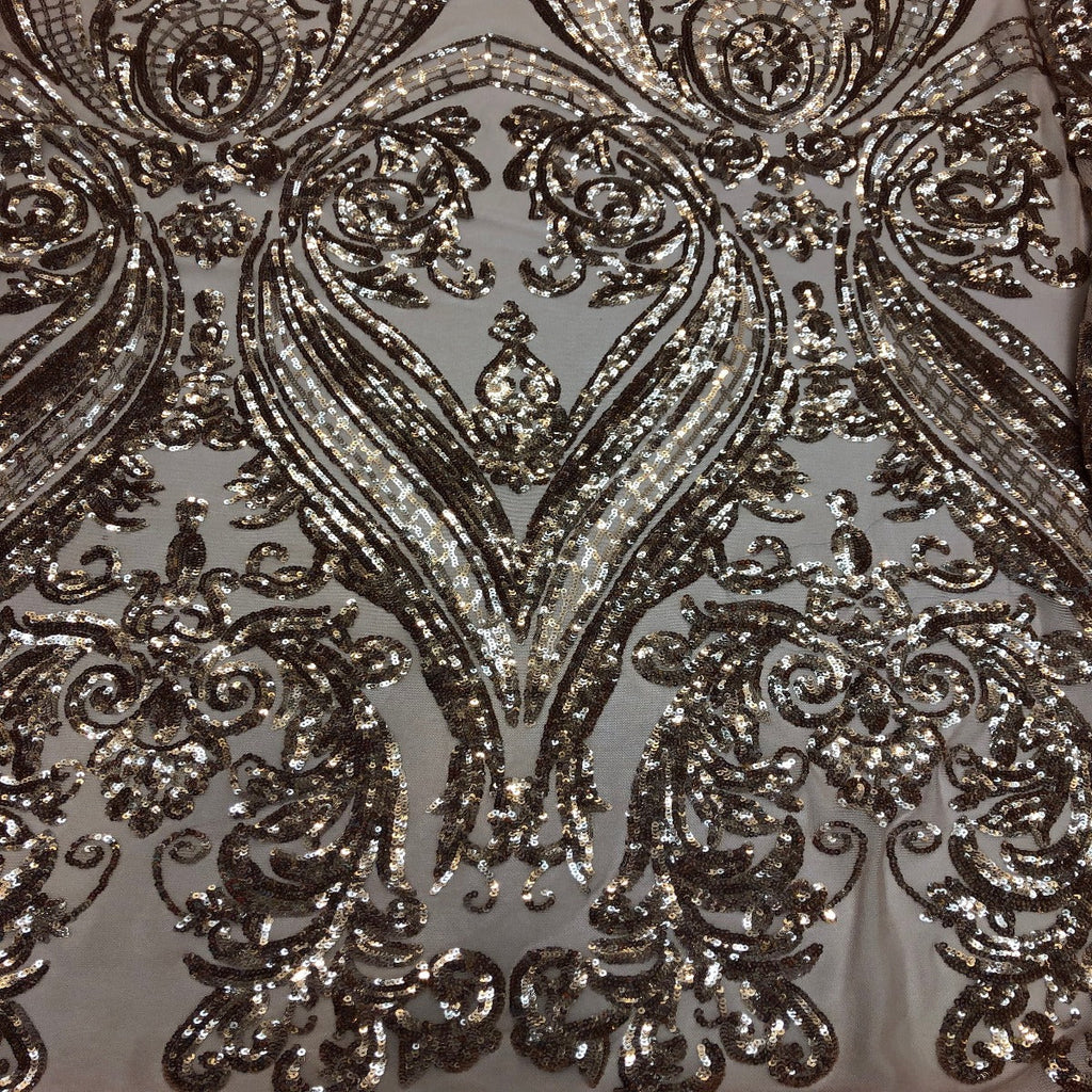 This beautiful and elegant Catina Sequins Lace Fabric is truly one of a kind. Each fabric is backed with a four-way stretch nylon mesh, showcasing a stunning sequin design throughout. Sold by the yard, if more than one yard is purchased, you will receive your fabric in a continuous piece; for example, ordering two yards will yield a piece measuring 60" x 72".