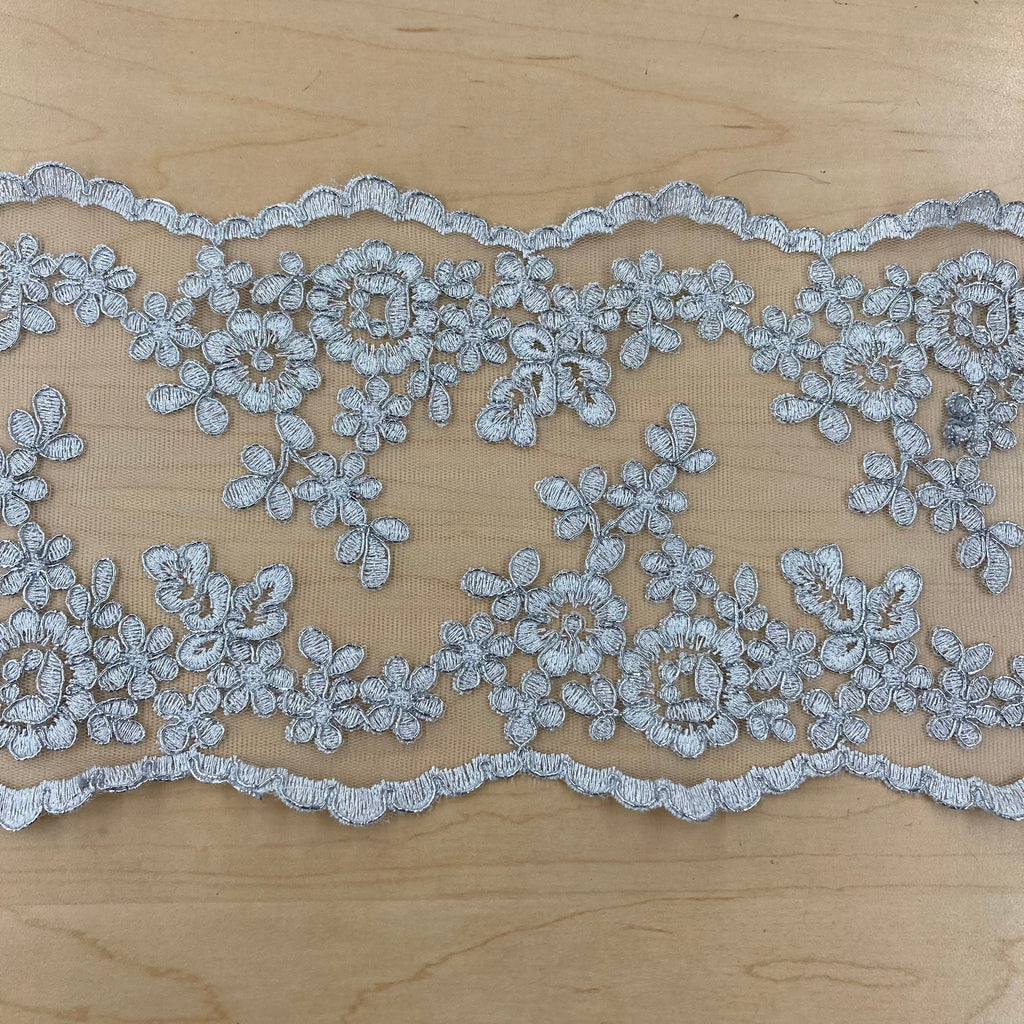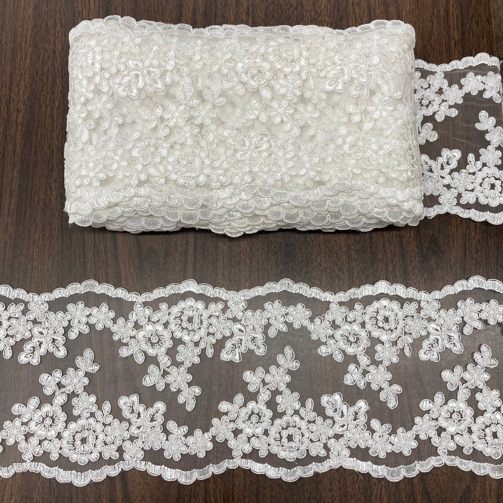 Introducing Lace USA's elegant 6" wide Corded lace trim collection, perfect for creating beautiful decorative accents for special occasion dresses. Our high quality Corded couture lace trim is handmade and embroidered on 100% Polyester Net Mesh fabric - light enough for your most delicate of designs. Available in 6 different colors, from beautiful ivory and white to the perfect pastels, our Corded lace trim will add the perfect ornamental detail to your wedding dresses, quinceanera dresses, evening gowns, and dance costumes. Our Corded embroidered lace trim is multi-dimensional and perfect for adding a timeless elegance to your special occasion look. From quinceanera dress trim to trim for a dance costume, you can choose from our diverse selection to find the right nuance of trim for a variety of materials. Our bridal lace trim, Corded evening dress lace trim, and Corded trim for special occasion dresses will all make your special occasion look one-of-a-kind. Our Corded lace trims come in a stunning array of sizes and styles, adding unique dimension to your garments. From Decorative lace trims to more Elegant corded lace trims, there's something special in our collection for everyone. Add the perfect balance of style and comfort to your special occasion look with our Corded lace trims collection.