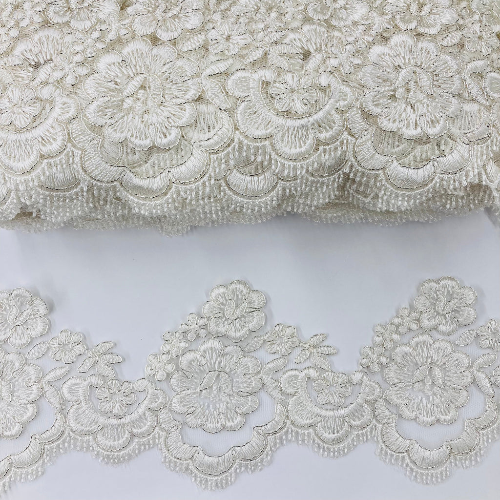 Welcome to Lace USA, where you'll find beautiful Corded Lace Trimming Embroidered on 100% Polyester Net Mesh. Our lace trims are the perfect choice for creating one-of-a-kind wedding dresses, couture evening gowns, quinceanera dresses, and dance costumes. Our products are handmade and of the highest quality, so you can be sure you're choosing the best for your special projects. This corded lace trim is 4" wide and comes in four stylish colors, perfect for adding the perfect touch of elegance to any project. Our Corded Lace Trimming makes for a stunning and unique couture lace trim, bridal lace trim, evening dress trim, quinceanera dress trim, trim for dance costumes, embroidered and corded trim, trim for special occasion dresses, decorative corded trim, decorative lace trims, and elegant corded lace trims. For your wedding, quinceanera, prom, or any special occasion dress, choose our Corded Lace Trimming Embroidered on 100% Polyester Net Mesh. Shop Lace USA and make your next project unique and unforgettable.