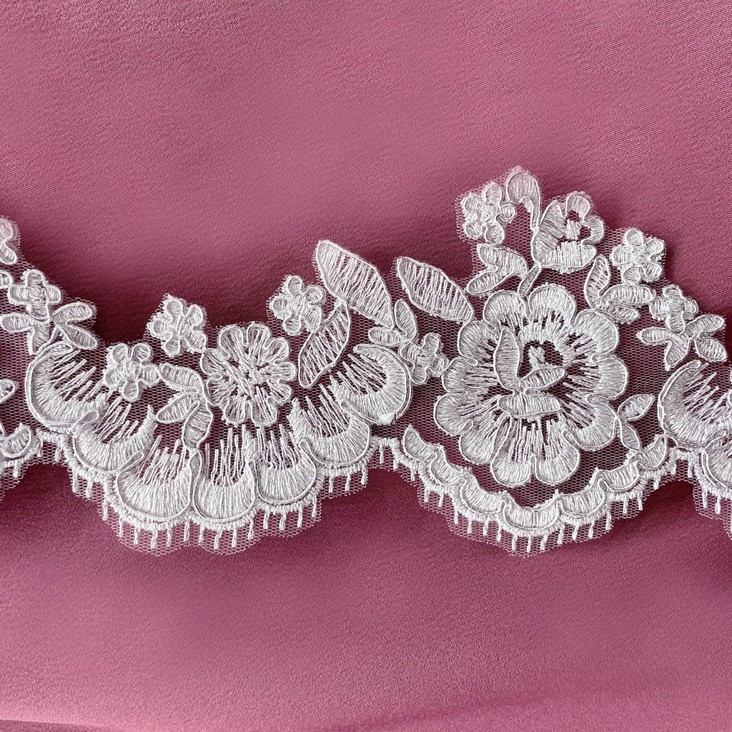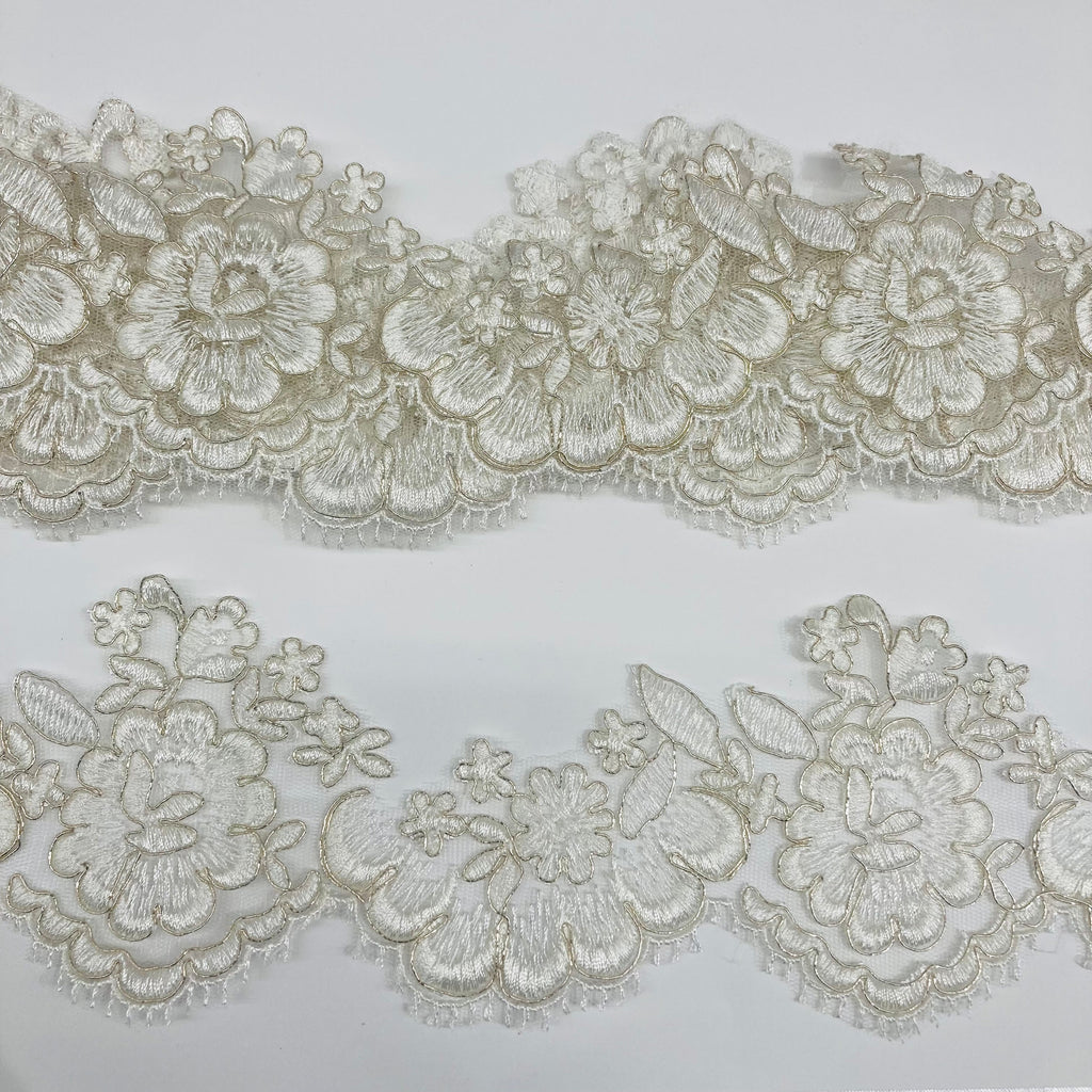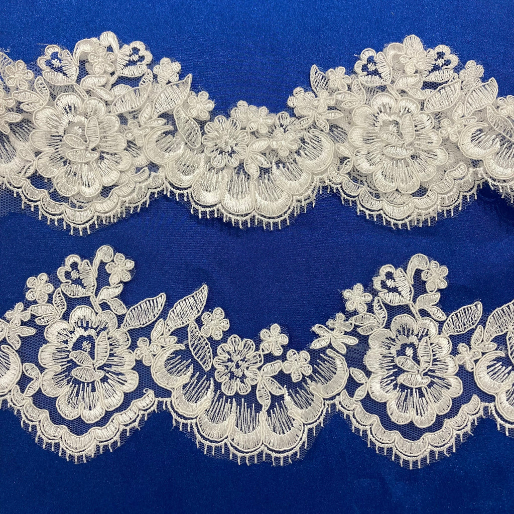 Handmade, high quality Corded Lace Trimming Embroidered on 100% Polyester Net Mesh. Beautiful on wedding dresses, evening gowns, dance costumes, and more.
