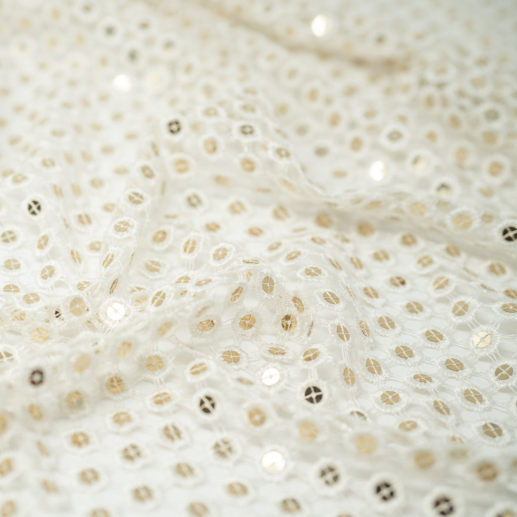 Dottie is a non-stretch Polyester Knitted Lace; ideal for formal designs. It also features a beautiful sparkle of sequin detailing throughout the fabric for a touch of glamor. This fabric is perfect for stand-out eveningwear, beautiful bridal and prom dresses, and any other special occasion. This fabric is lightweight, making it easy to sew, and it drapes nicely for a timeless, luxurious look. It is also perfect for creating showstopping statement pieces. Dottie is a timeless fabric, featuring a classic lace pattern and an elegant sequin detail. It's lightweight, meaning you can craft sophisticated pieces with ease. Enjoy the luxe look of high-end fabrics without the extra weight. You'll be dazzled by the results.