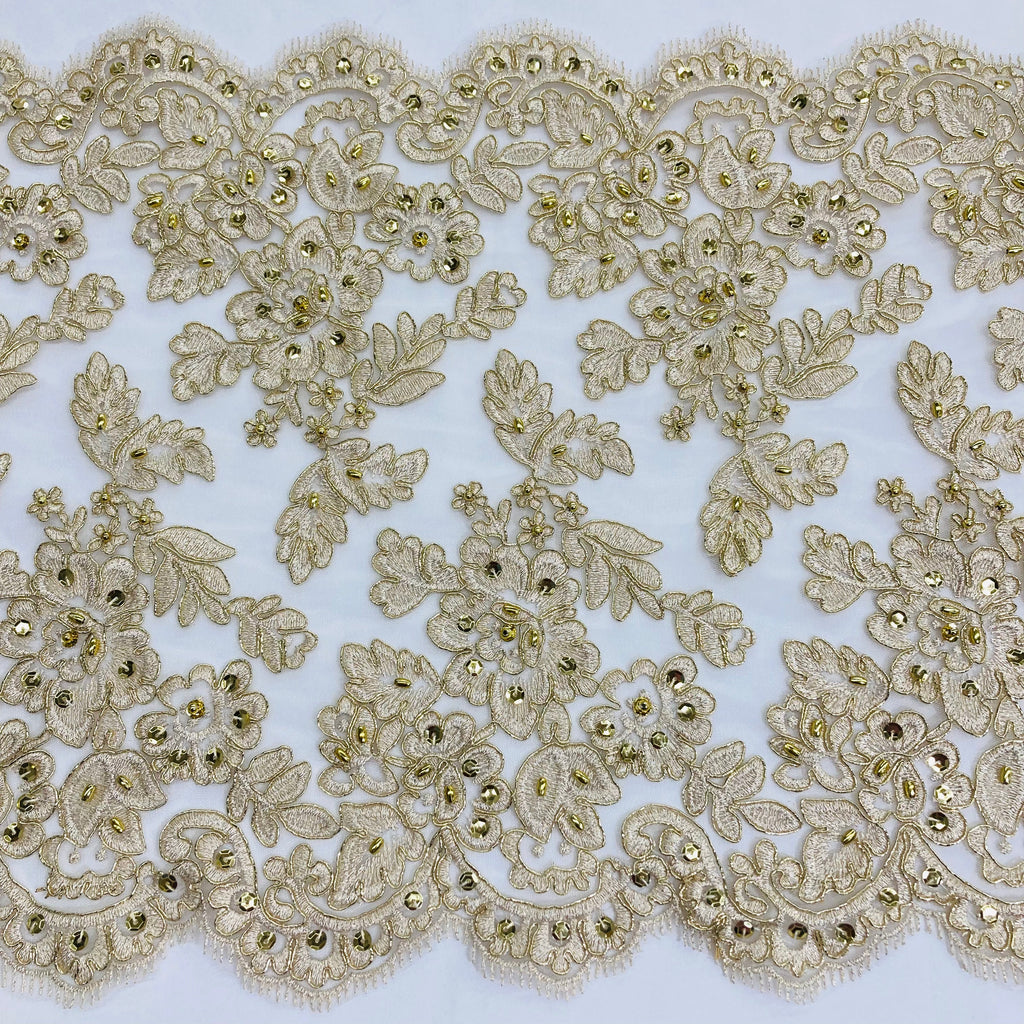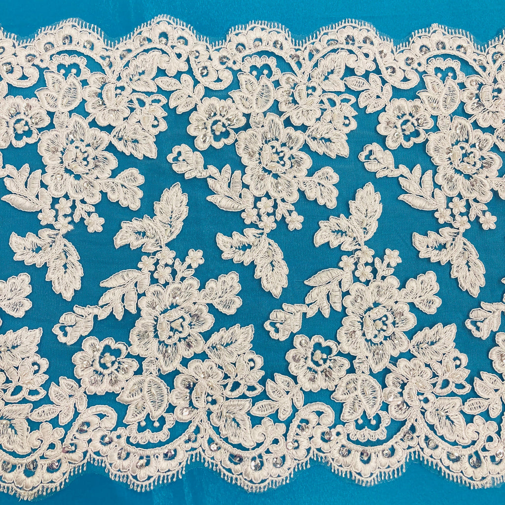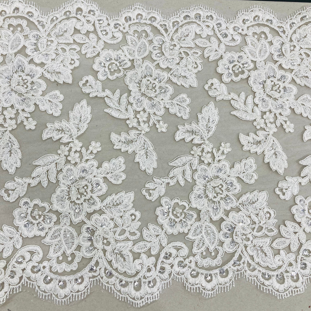 This handcrafted lace trim is the ideal finishing touch for custom bridal wear, couture gowns, wedding veils, formal costumes, or DIY fashion projects. Whether you're enhancing hems, sleeves, overlays, or bodices, this premium embroidered lace adds timeless beauty, professional texture, and refined elegance to any creation — perfect for dressmakers, costume designers, and anyone seeking high-end beaded and corded lace detailing.