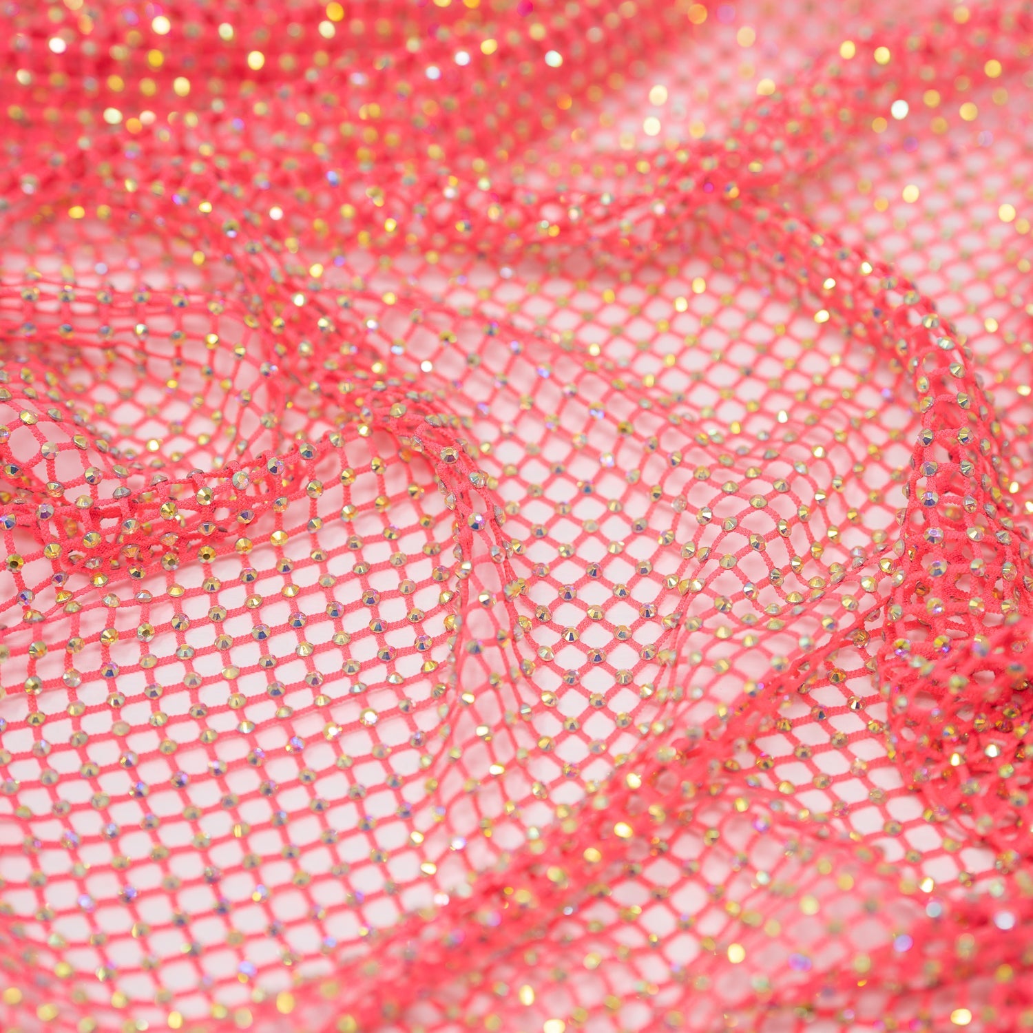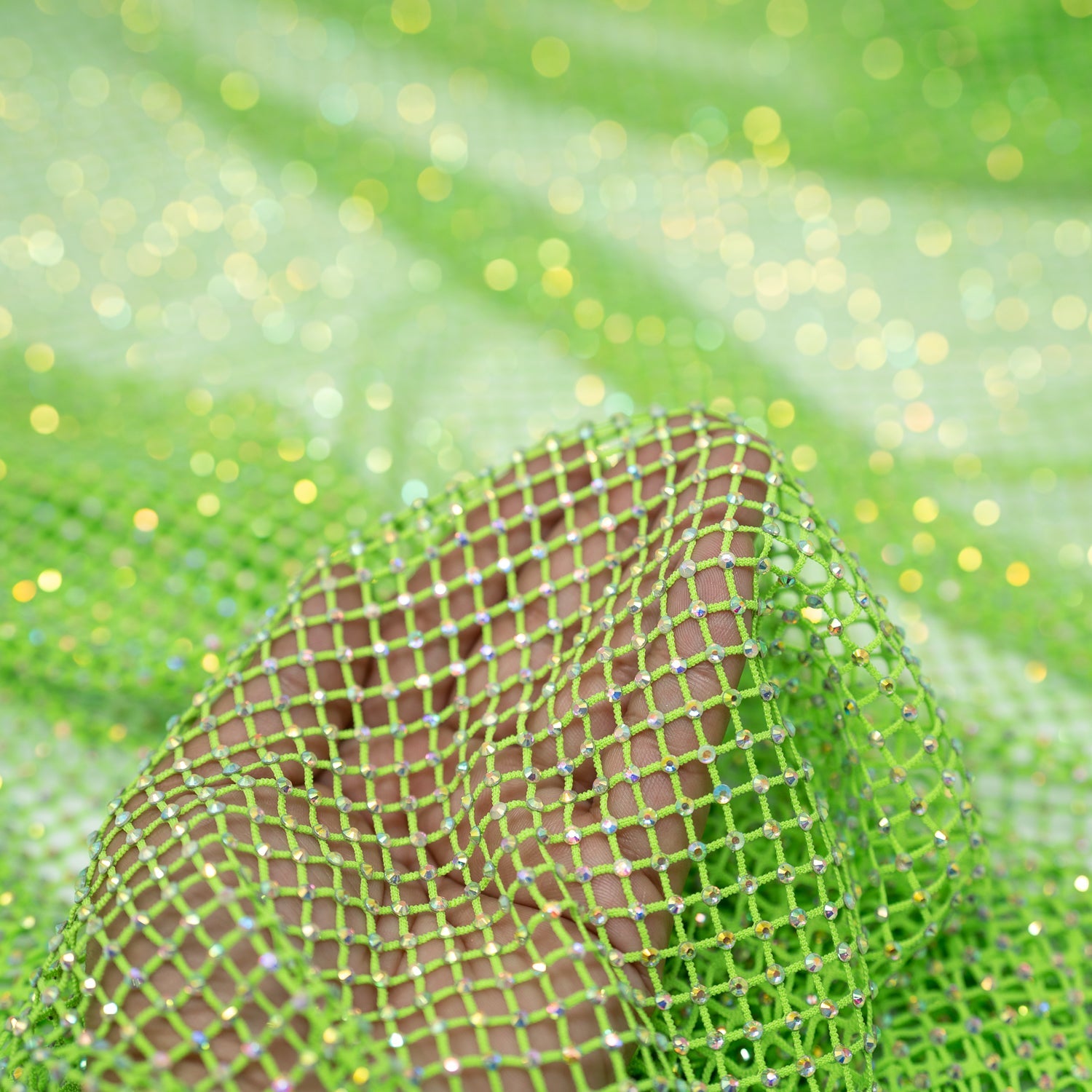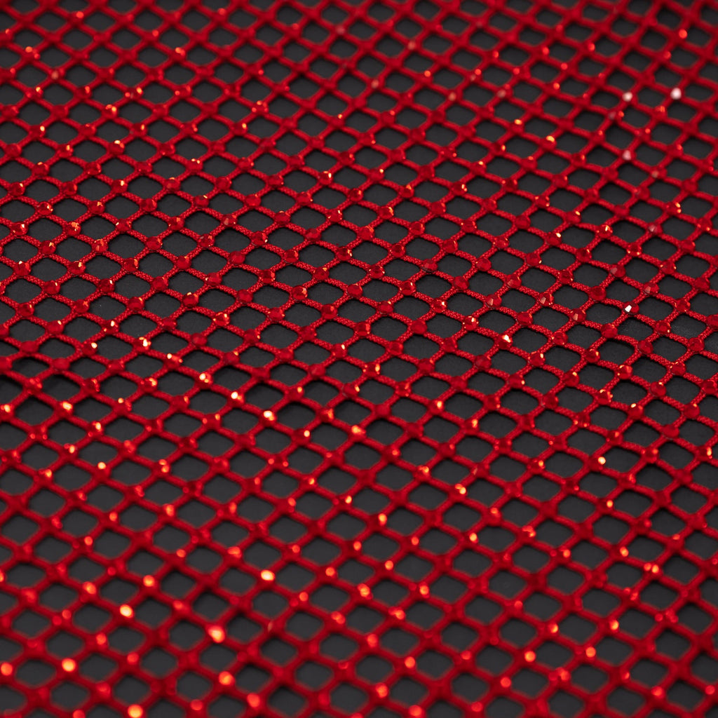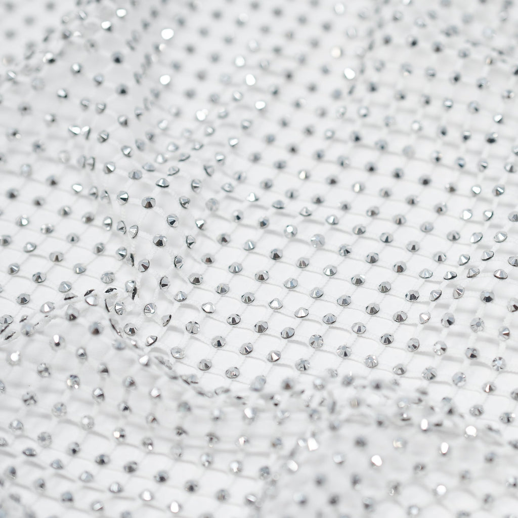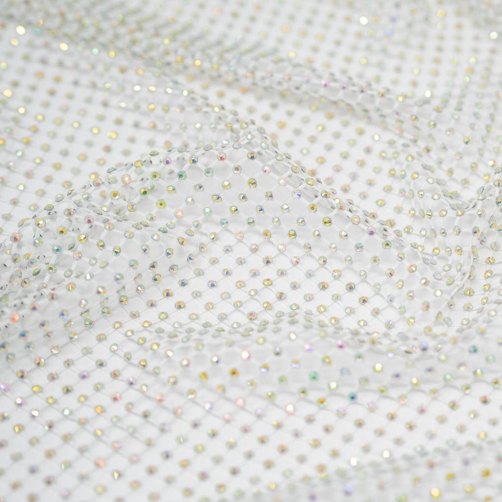 Enigma Diamond Fishnet is a high quality fabric ideal for high fashion concepts, swim cover ups, resort wear, couture, and dancewear. The rhinestones are adhered with a strong grade adhesive to secure the stones in place. The fabric is designed to provide a luxurious, shimmering texture ideal for beachwear and other fashionable occasions. The adhesive bonds the rhinestones to the fabric, allowing them to remain in place through washing and wear. This fabric is lightweight and strong, withstanding the test of time. The rhinestones are securely attached, with no worry of them becoming loose or falling off. The fabric is perfect for creating beautiful and unique pieces that are sure to turn heads.