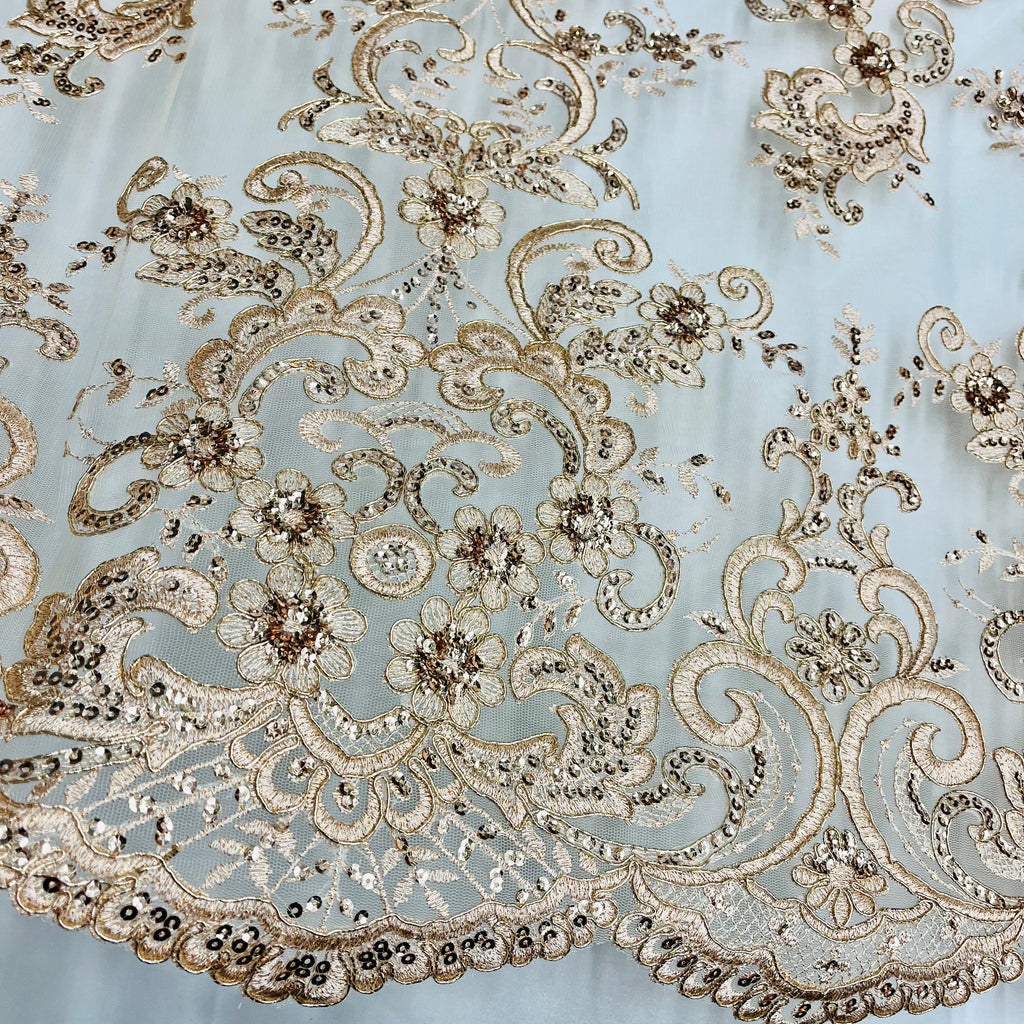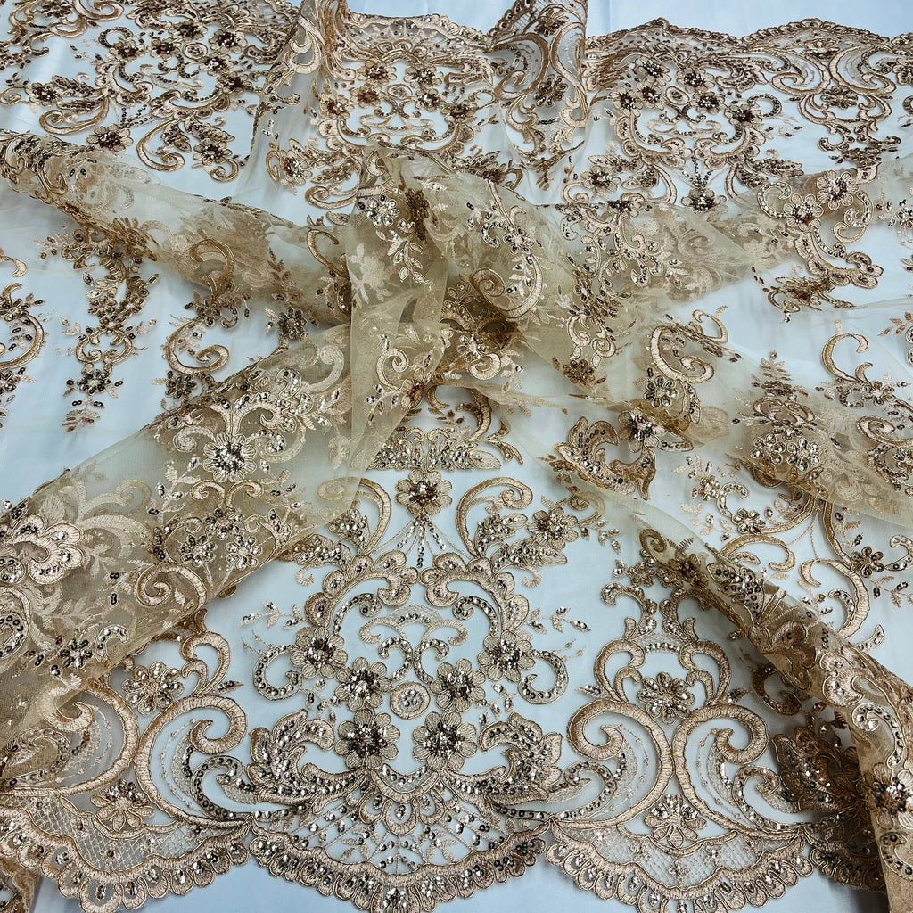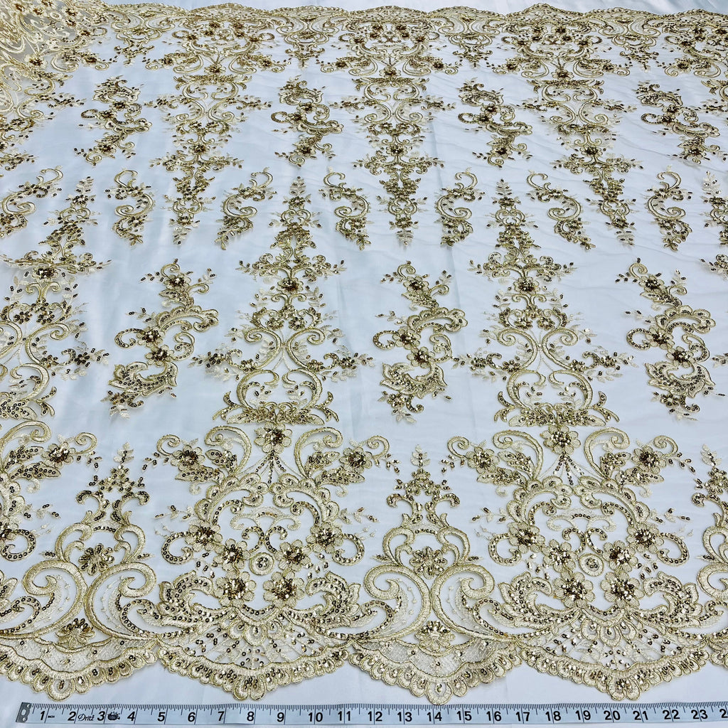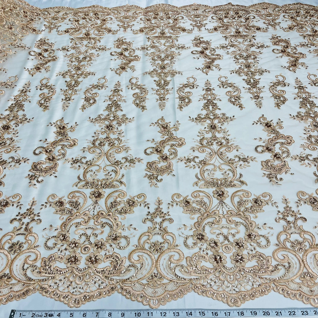 This premium 100% polyester net mesh fabric is adorned with intricately beaded and corded bridal lace embroidery for an elegant, decorative look. Perfect for unique couture, bridal, evening dress, quinceanera dress, dance costume, special occasion and more. Craft exquisite garments with this exquisite fabric.