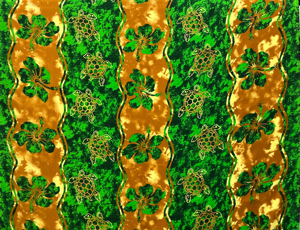 Bring a splash of the tropics to your next project with this vibrant Polynesian print. Rich vibrant colors. Alternating stripes of hibiscus flowers and graceful honu (sea turtles), capturing the spirit of island life. Whether you’re sewing a breezy summer dress or adding an exotic touch to your décor, this fabric infuses every creation with a lively island vibe.